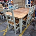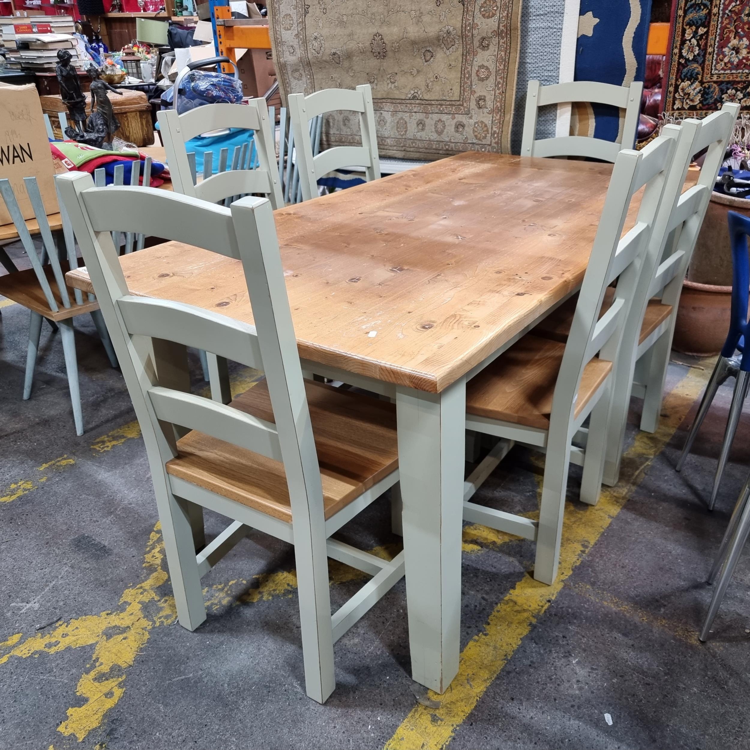 Star Lot : A good sized wooden country kitchen table By Strawbridge of Mount Usher and 6 chairs. Good quality heavy classic furniture. Measures 180 x 90 x 78cm. Super Set cost €2600 new.