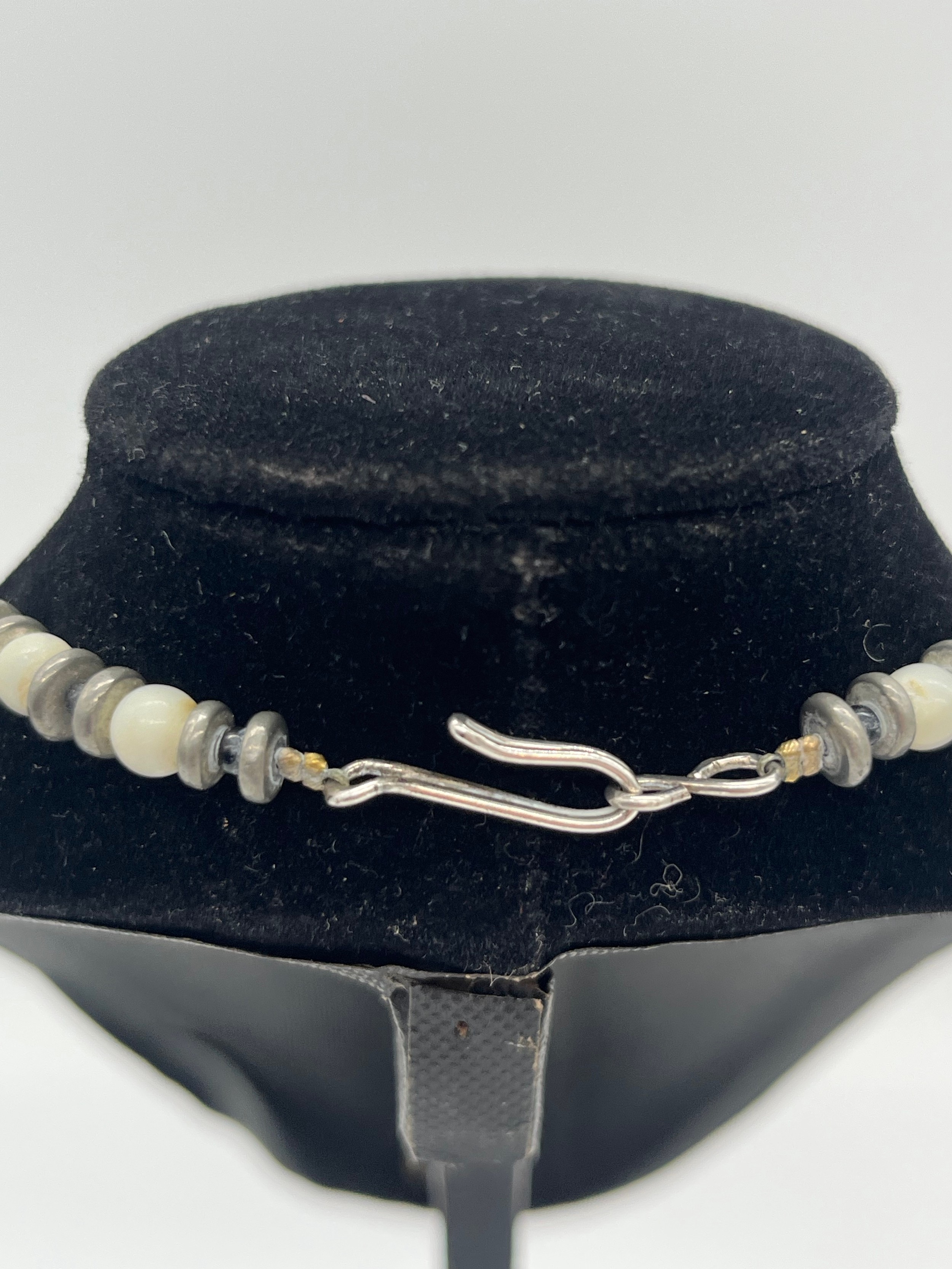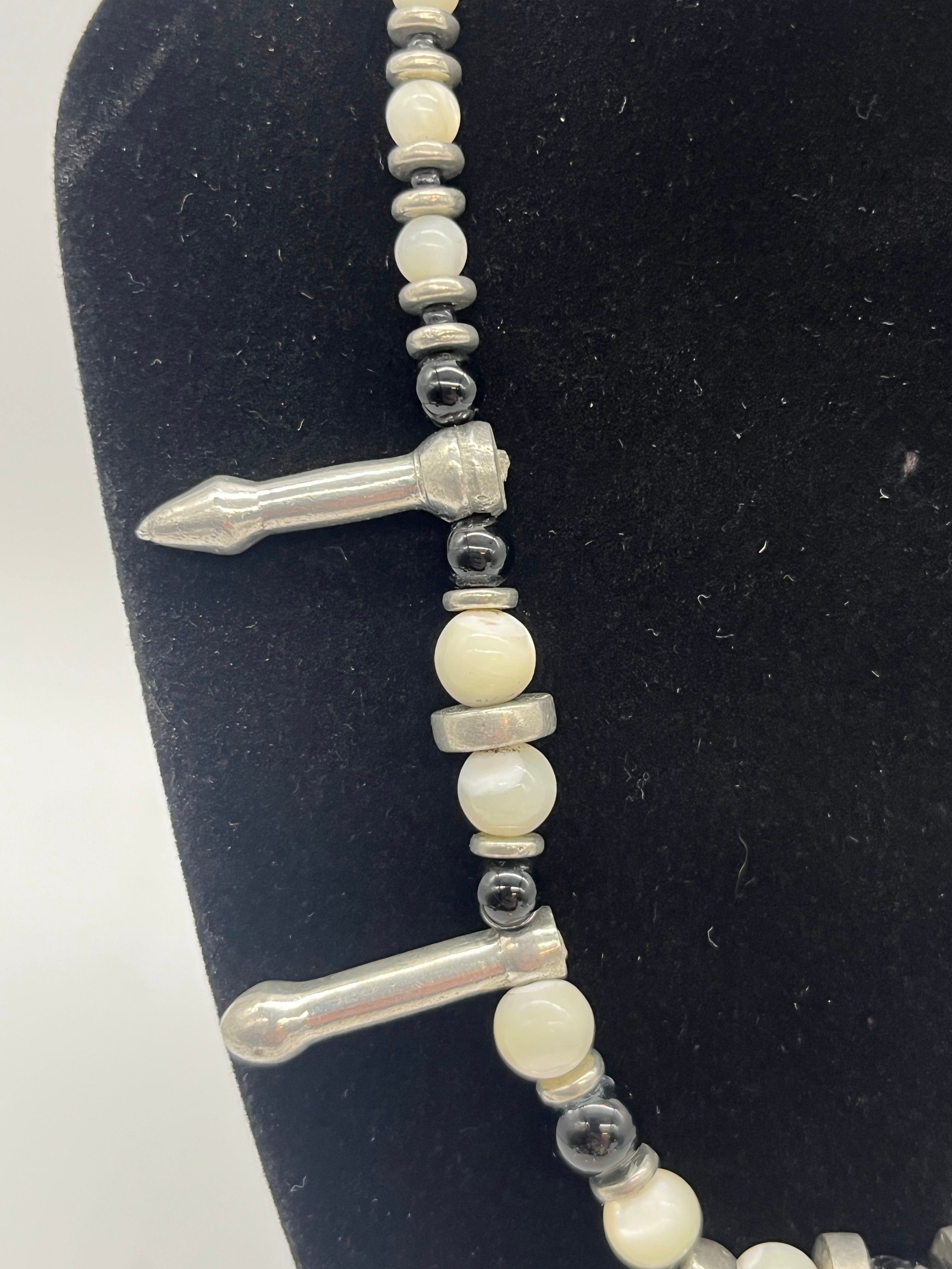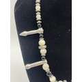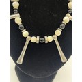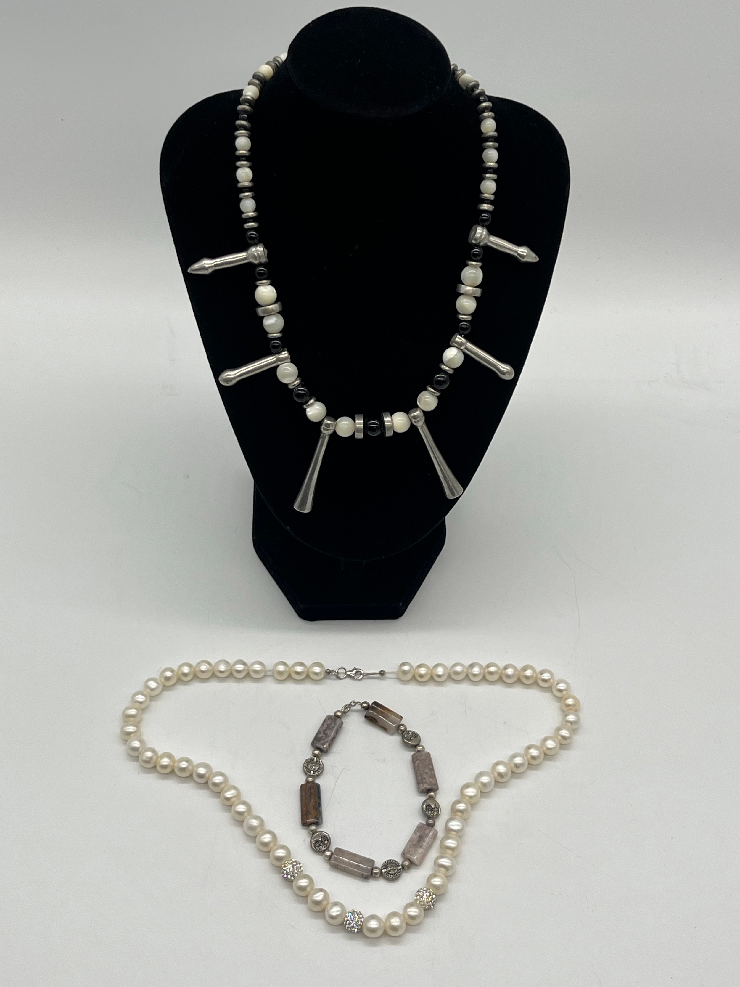 Unusual tribal style necklace with onyx beads and silver toned spacers along with silver and pearl necklace and silver and quartz bracelet.