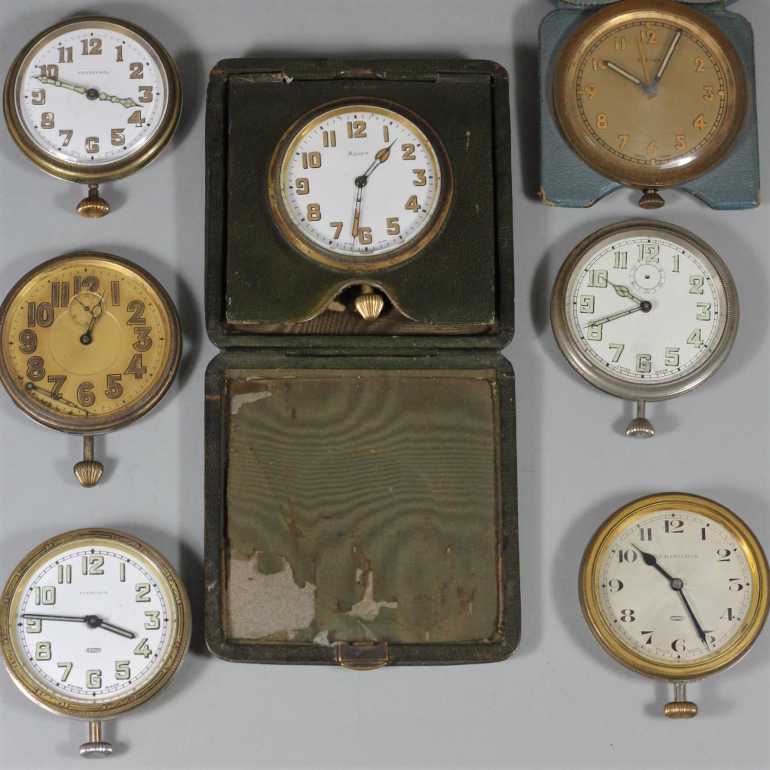A Tiffany & Co 8 day travelling clock, two Elkington & Co examples and 4 other examples.