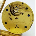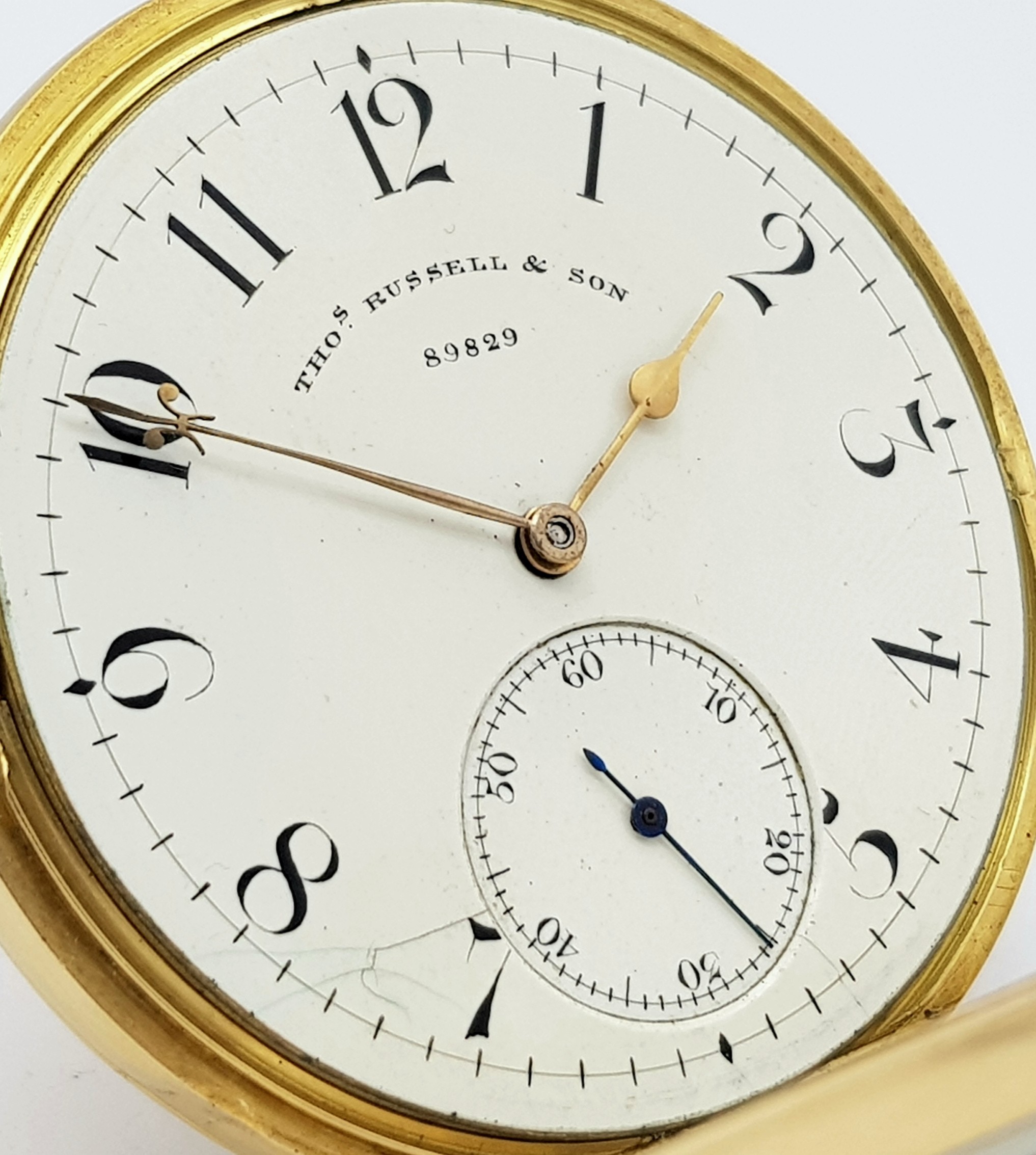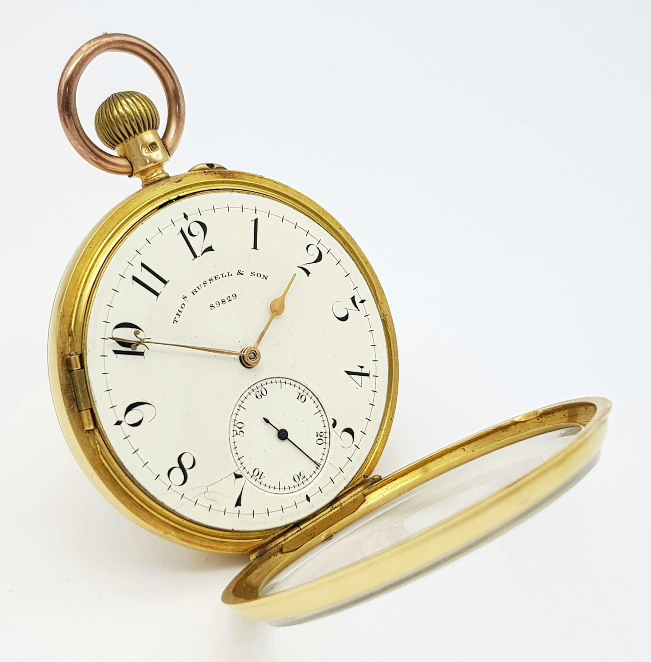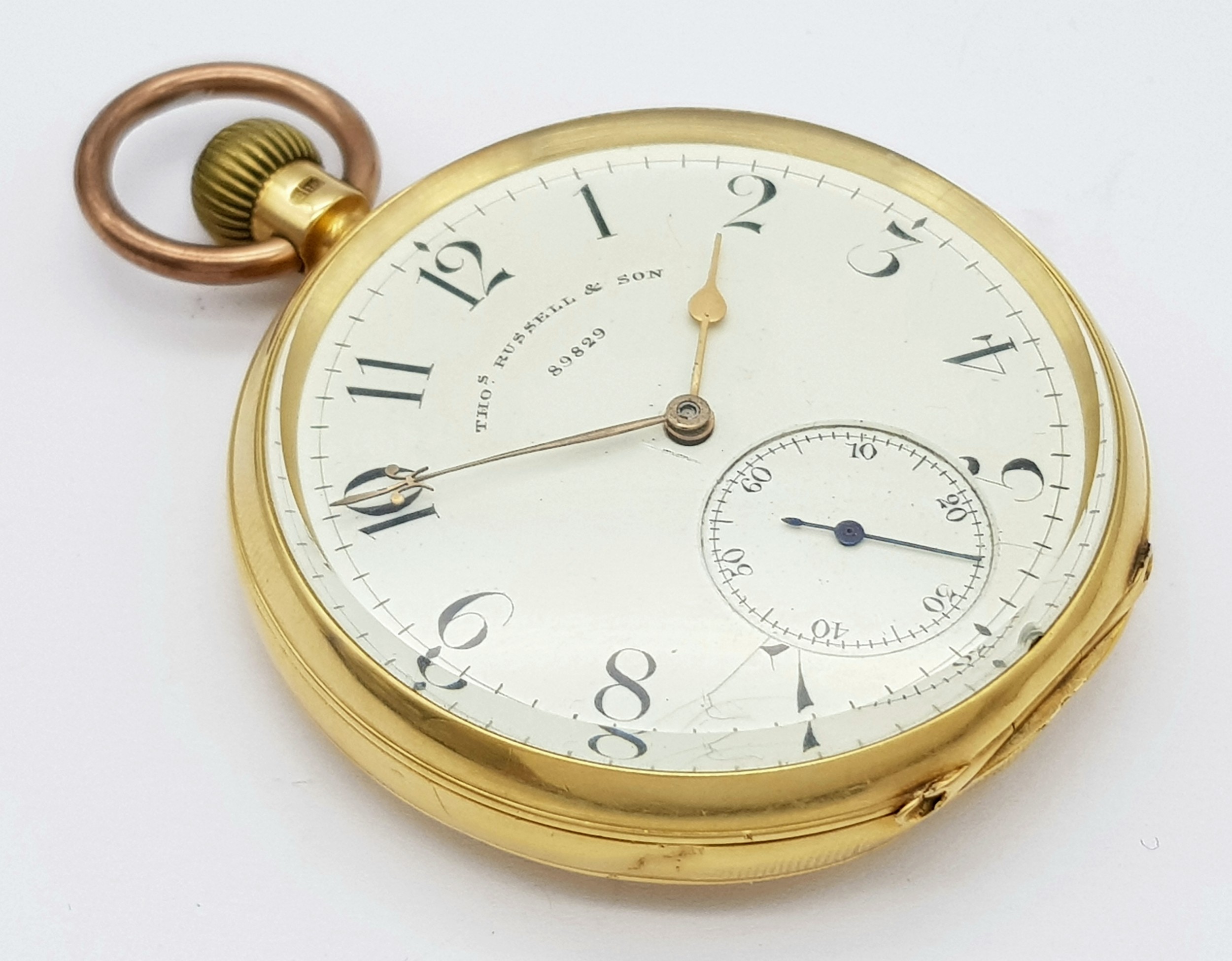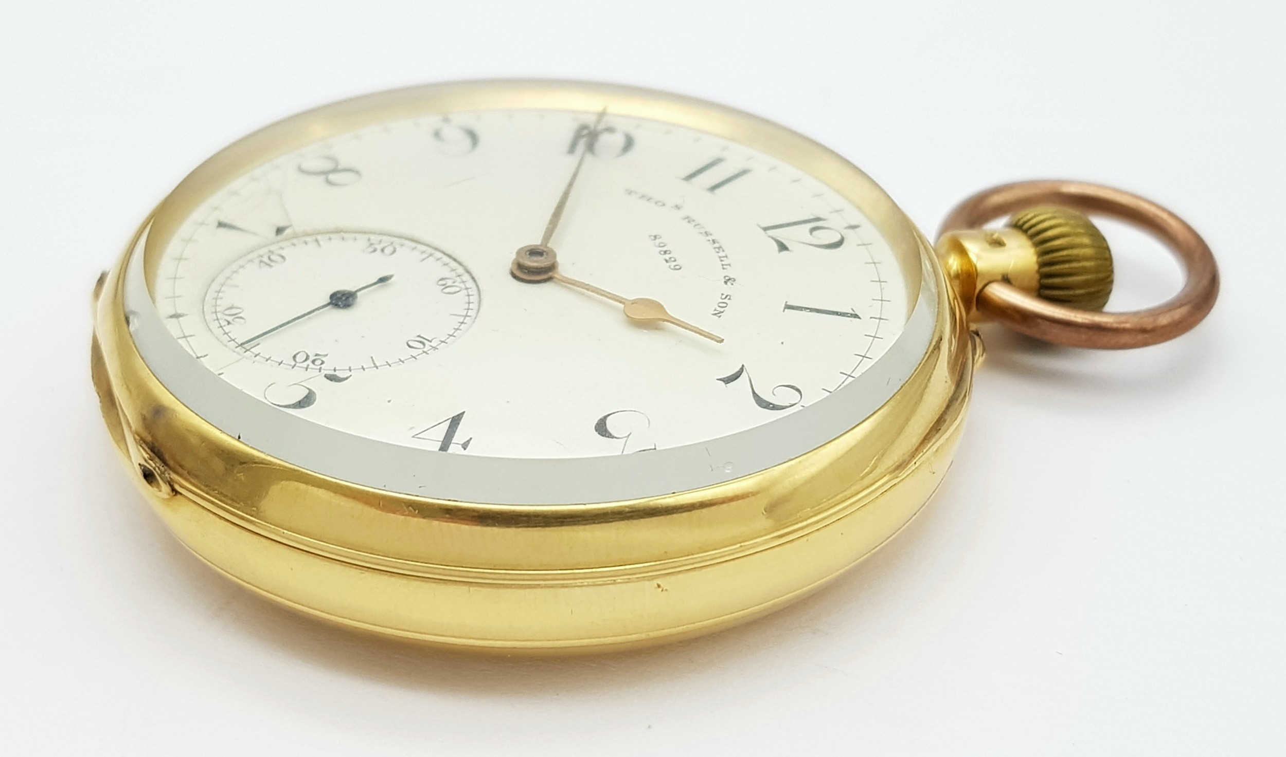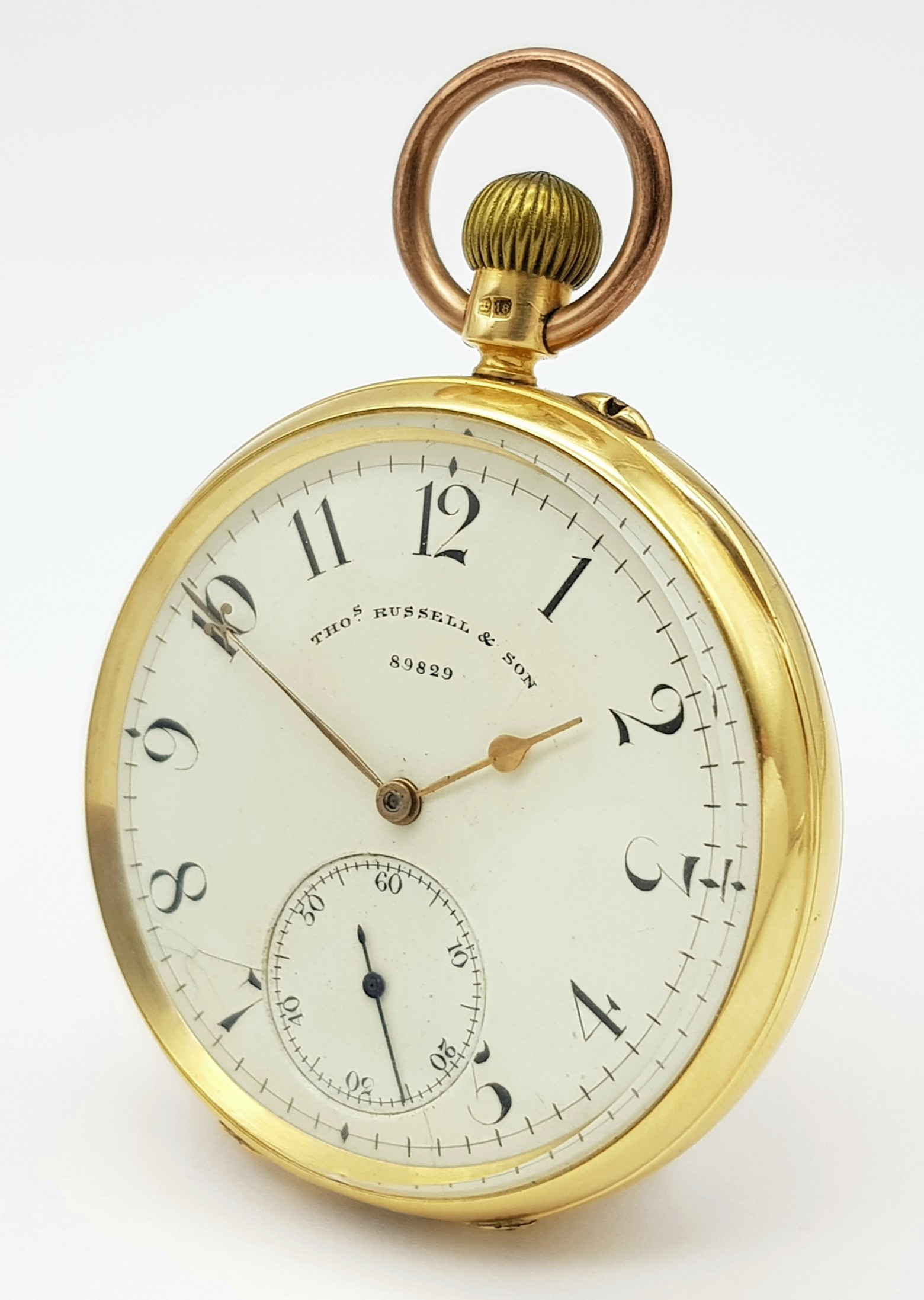 AN 18K GOLD THOMAS RUSSELL AND SON, EARLY 20TH CENTURY POCKET WATCH - ORIGINALLY SOLD BY MAPPIN AND WEBB IN LONDON. HAVING A DENT AT THE BOTTOM AND BEING OVERWOUND -NEVERTHELESS A BEAUTIFUL WATCH MADE BY A TOP MAKER. 54MM CASE DIAMETER. NOTE - THIS WATCH IS AS FOUND. SERIAL NUMBER 89829. 18K GOLD CASE WEIGHT - c.28G. 9K HOOK WEIGHT - c.2G. 104.4G TOTAL WEIGHT.