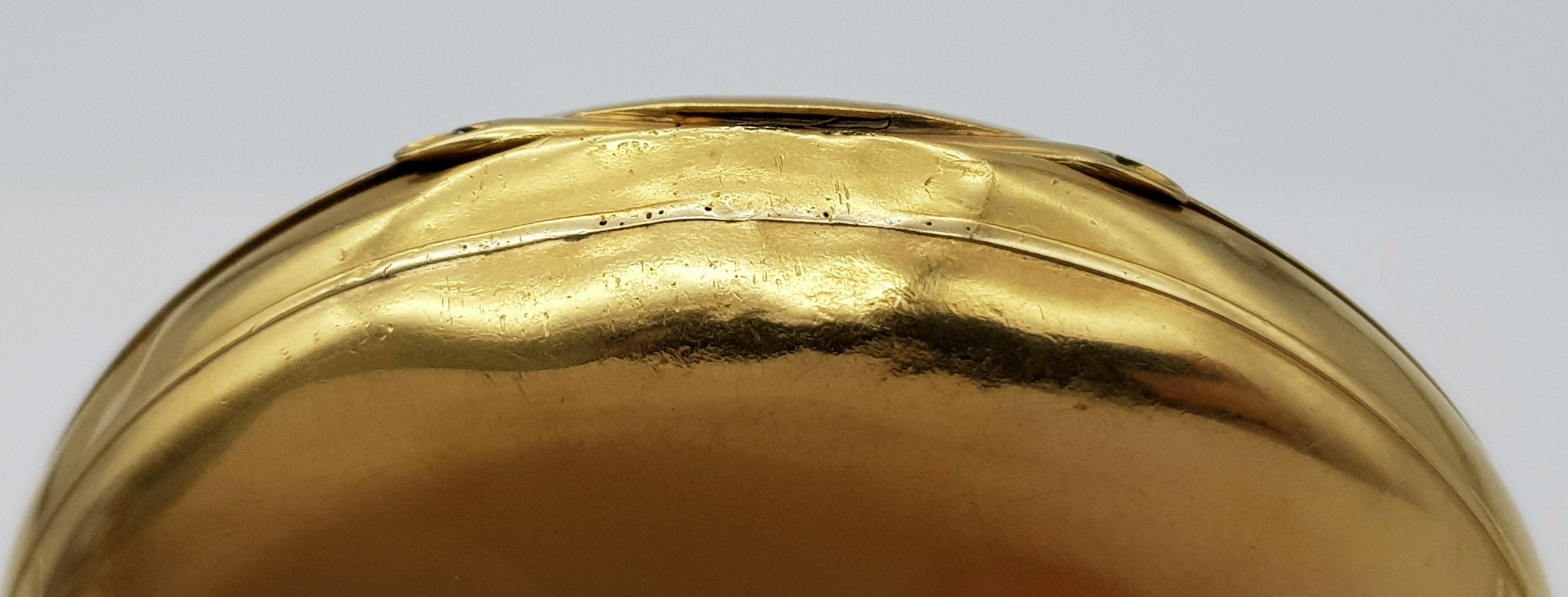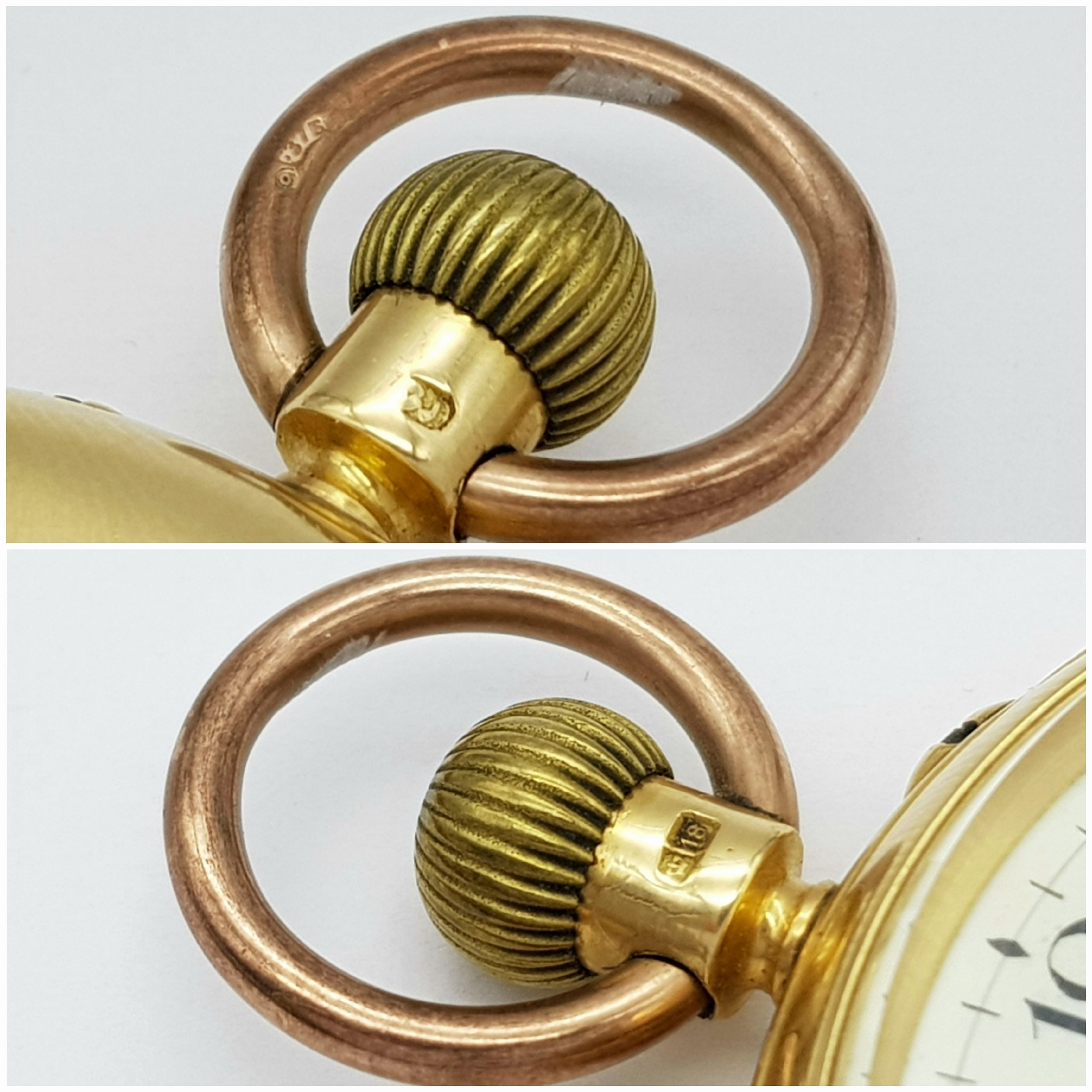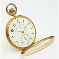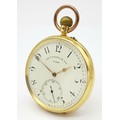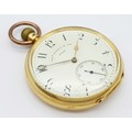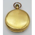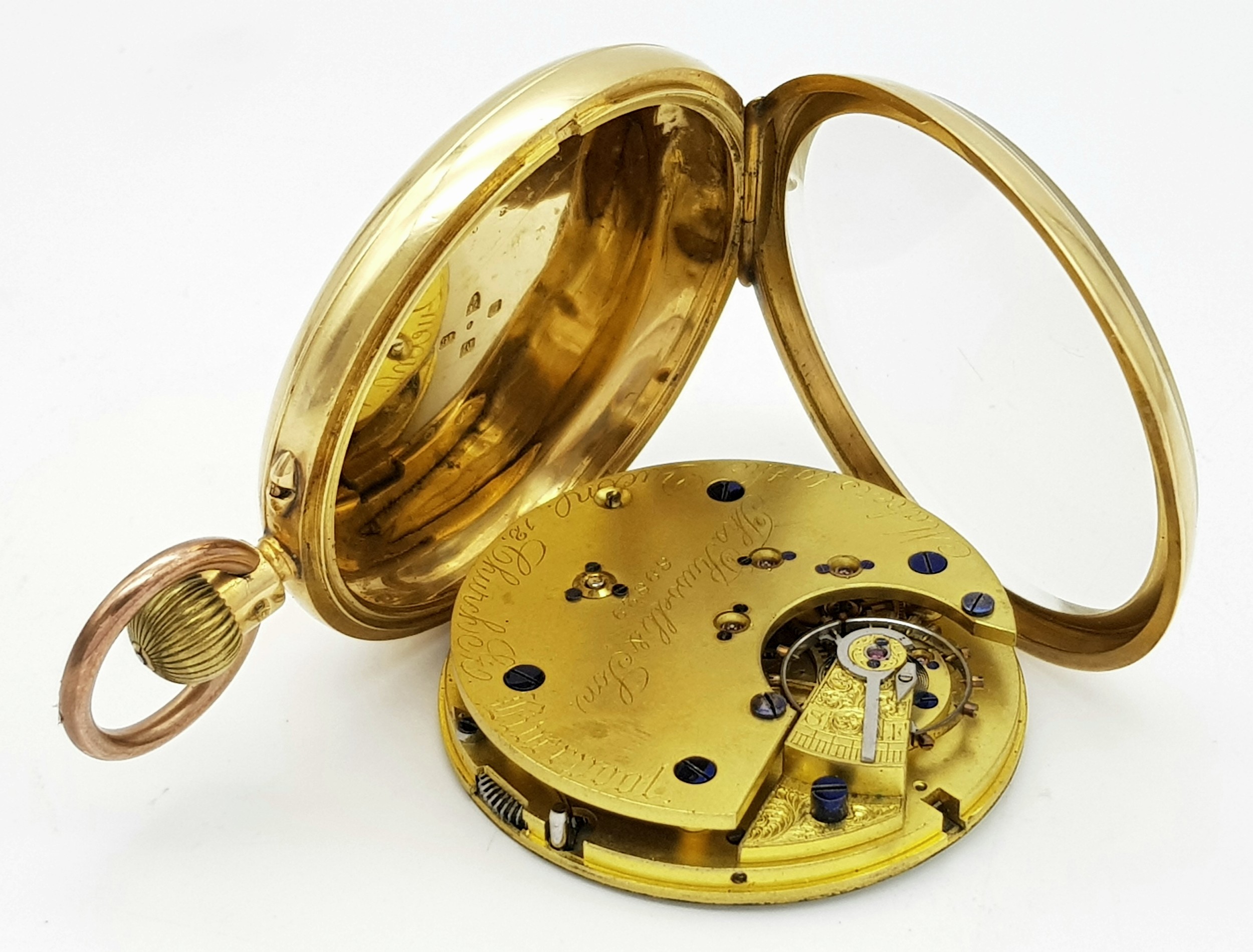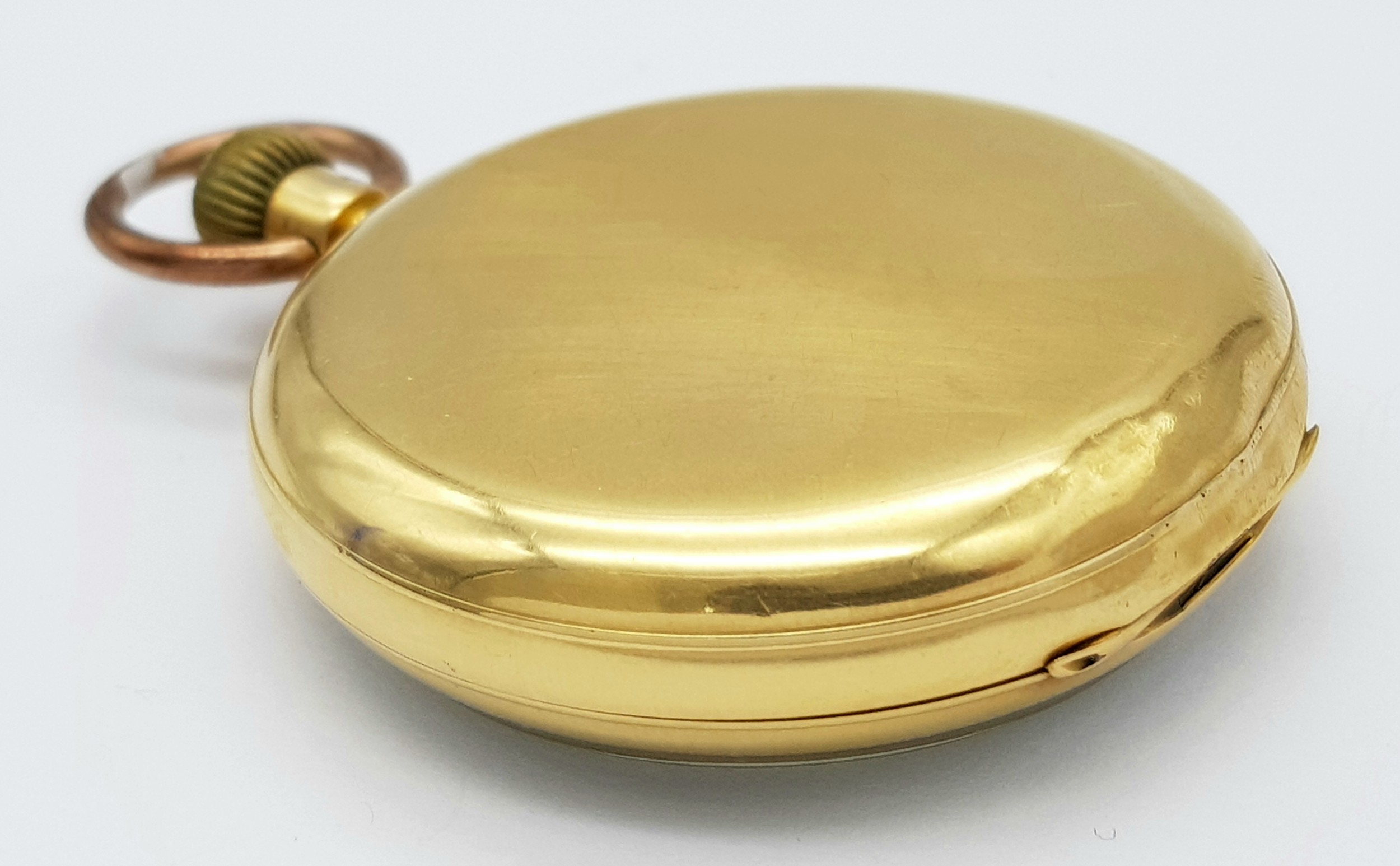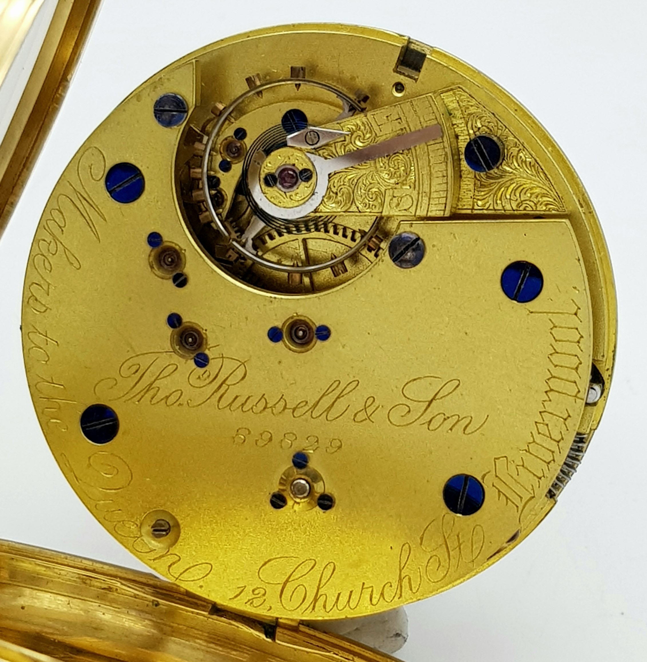 AN 18K GOLD THOMAS RUSSELL AND SON, EARLY 20TH CENTURY POCKET WATCH - ORIGINALLY SOLD BY MAPPIN AND WEBB IN LONDON. HAVING A DENT AT THE BOTTOM AND BEING OVERWOUND -NEVERTHELESS A BEAUTIFUL WATCH MADE BY A TOP MAKER. 54MM CASE DIAMETER. NOTE - THIS WATCH IS AS FOUND. SERIAL NUMBER 89829. 18K GOLD CASE WEIGHT - c.28G. 9K HOOK WEIGHT - c.2G. 104.4G TOTAL WEIGHT.