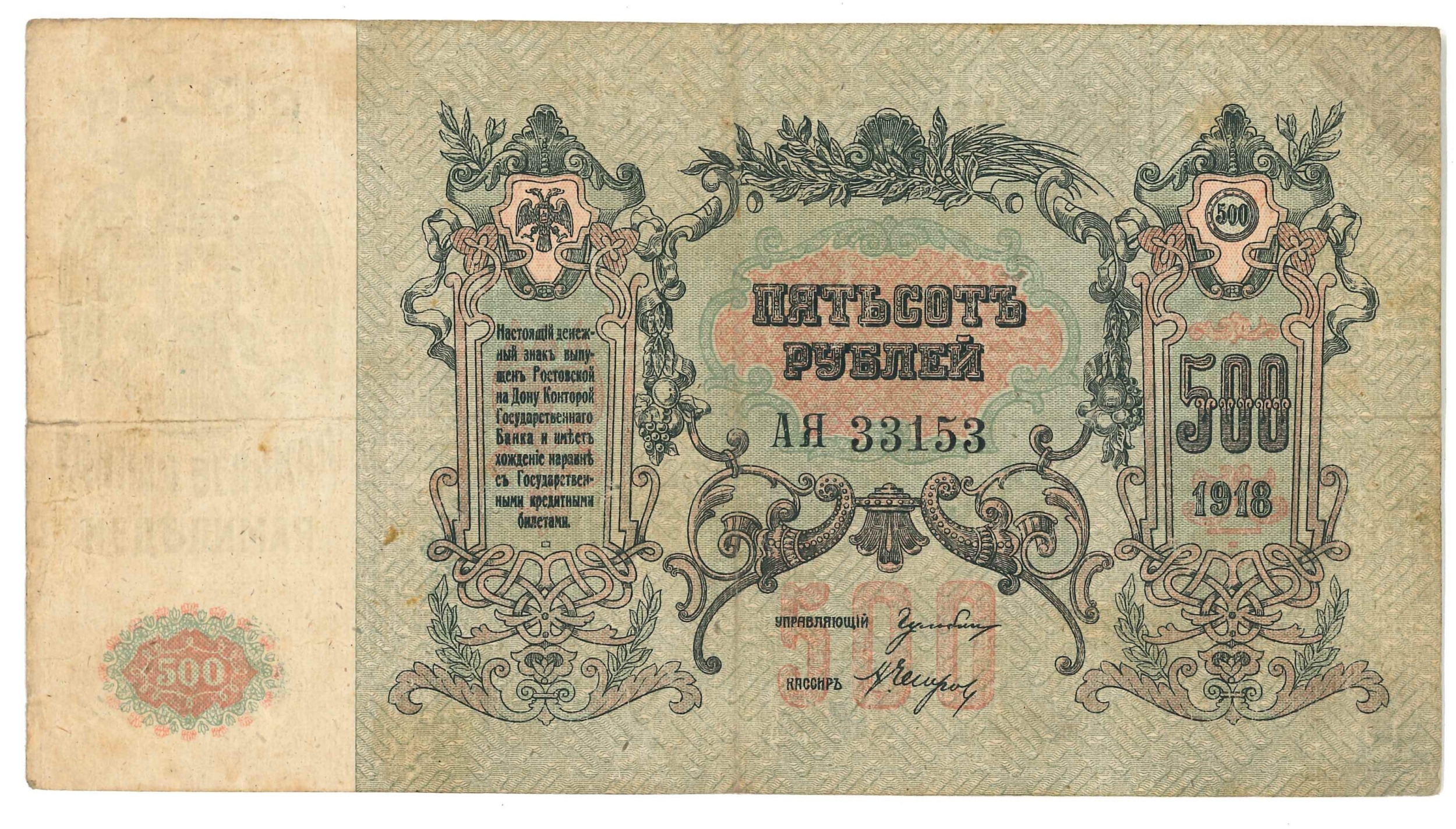 Banknotes; Russia; South Russia; 1918 500r with watermark, F/VF, Krause S415c.