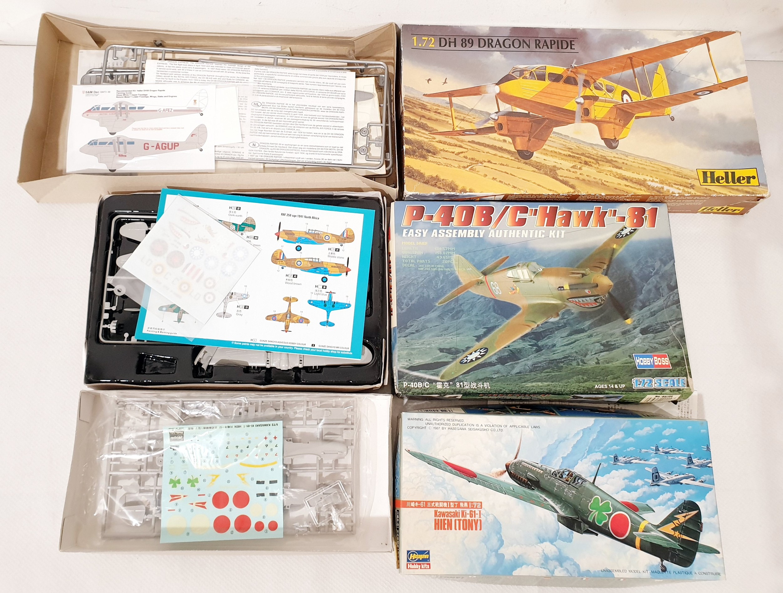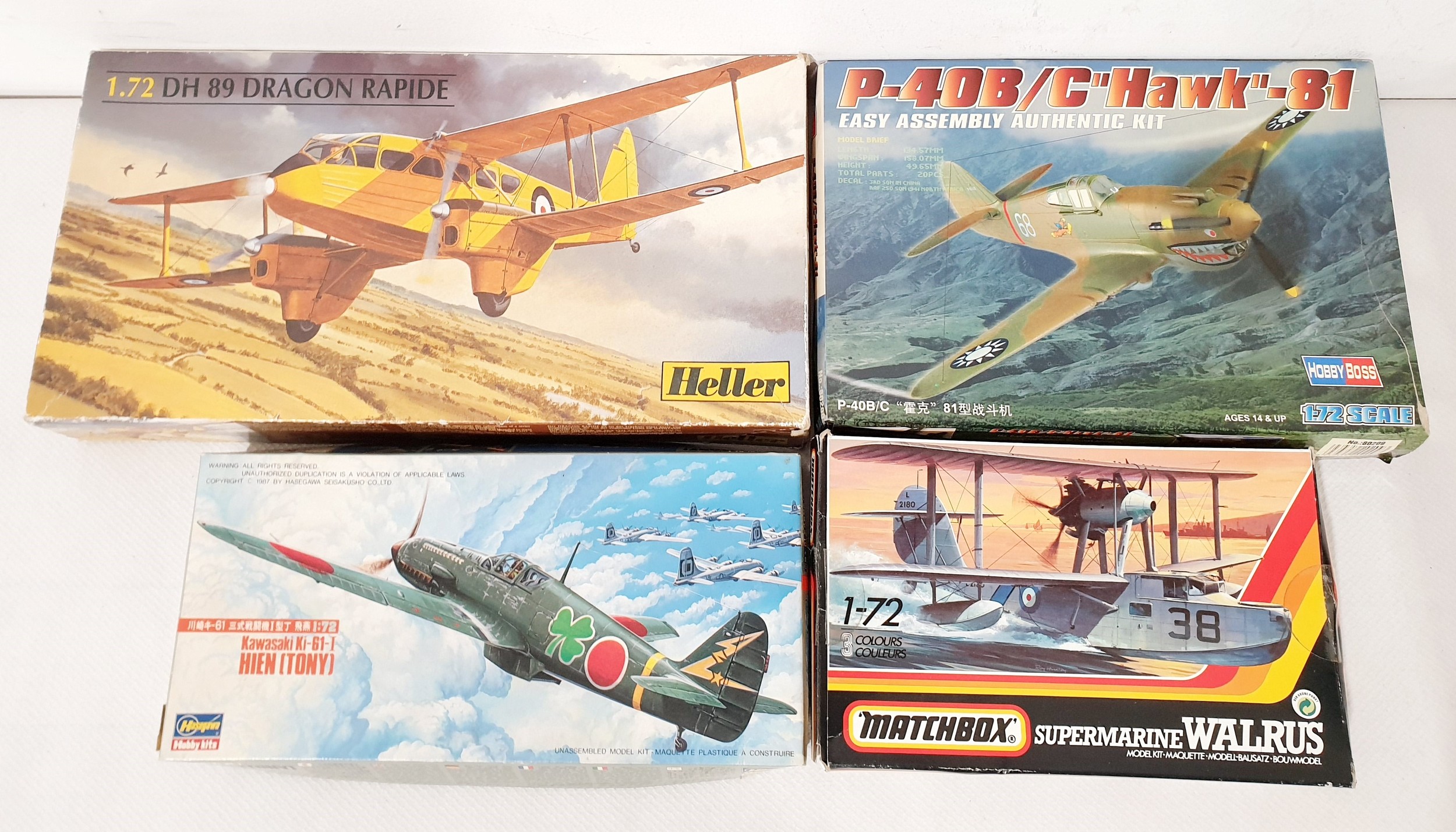 Four 1;48 scale model plane kits 'Submarine Walrus', 'Kawasaki Ki-61-I Hien (Tony)', 'P-40B/C Hawk 81' & a 'DH 89 Dragon Rapide'.