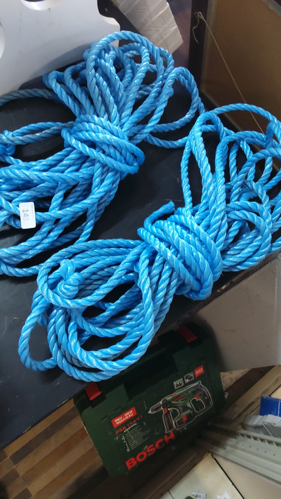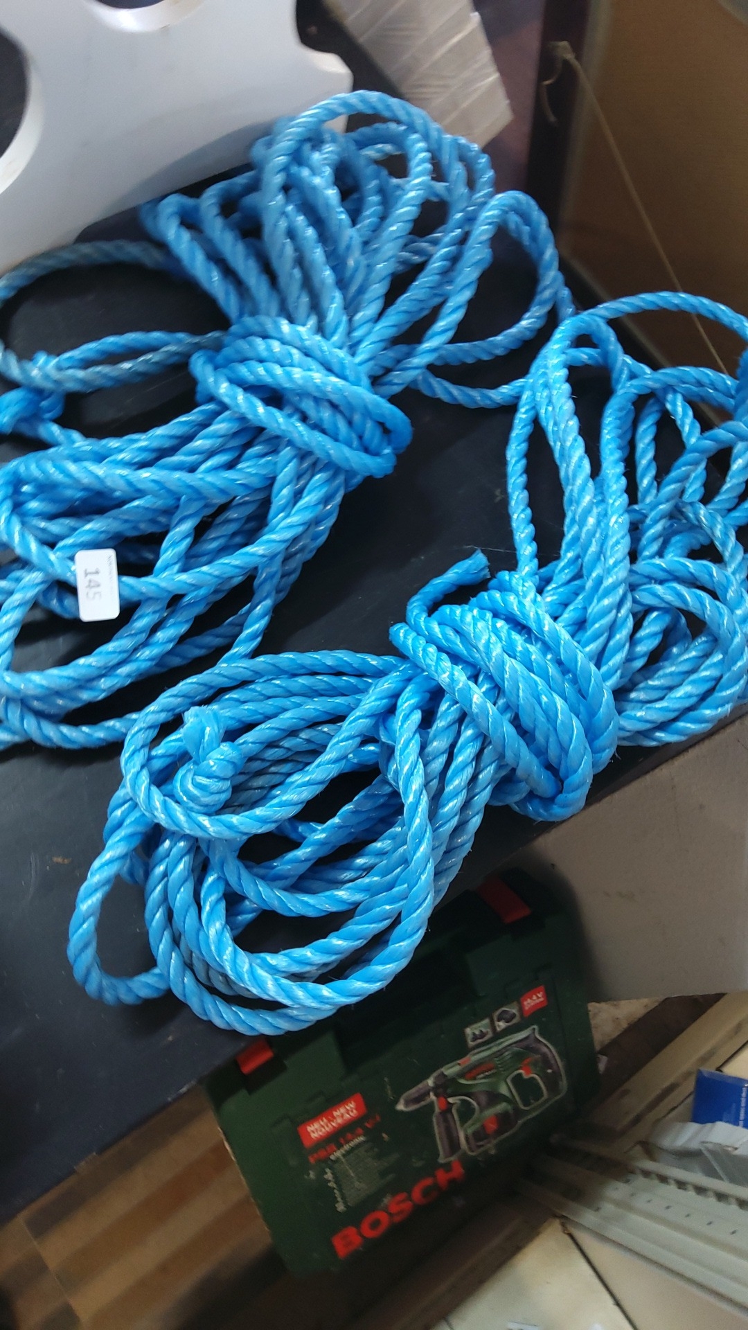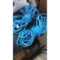 A group of bright blue synthetic rope coils, three-strand twisted construction, suitable for marine or general utility use; presented in two bundled lengths.