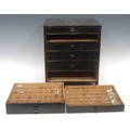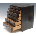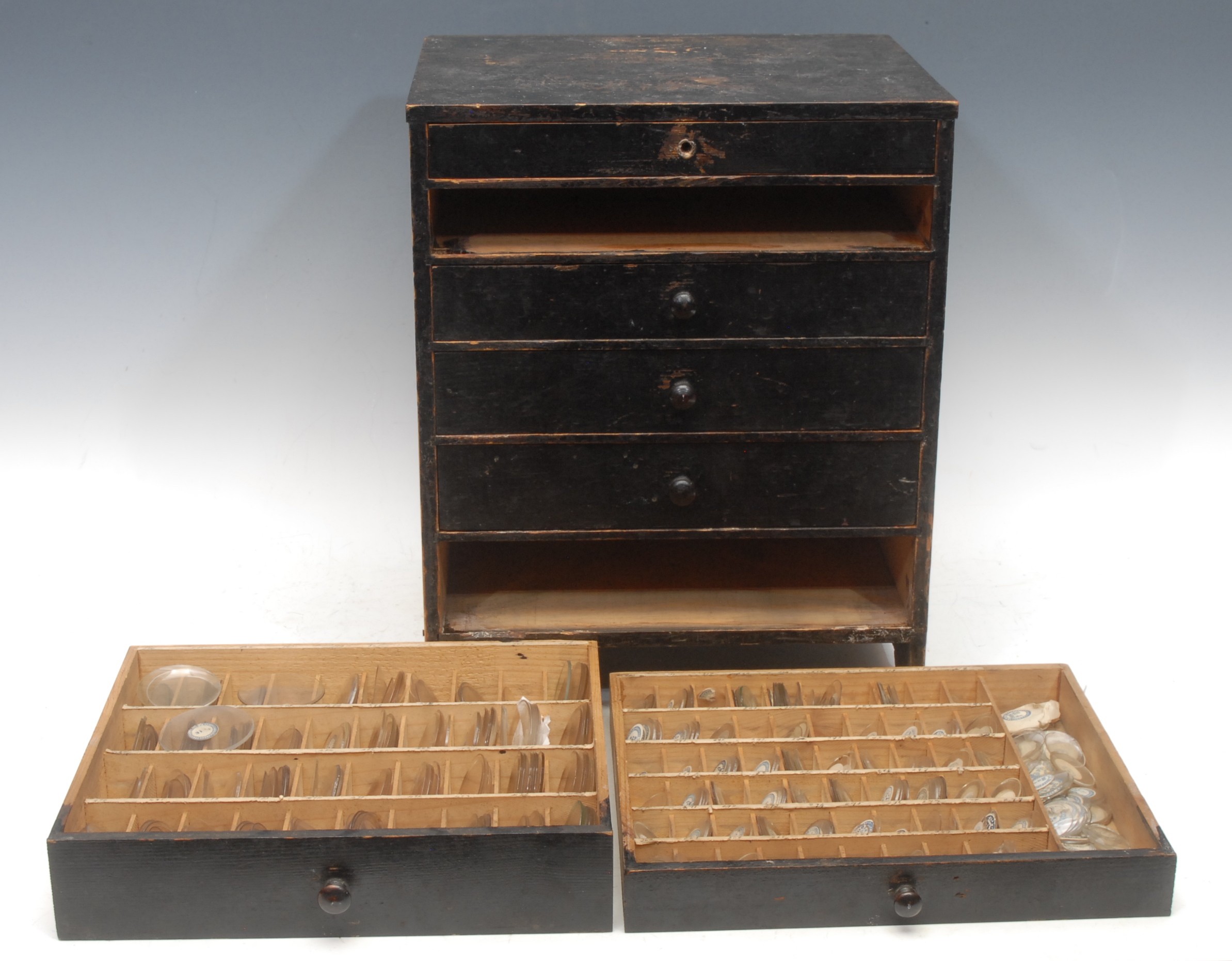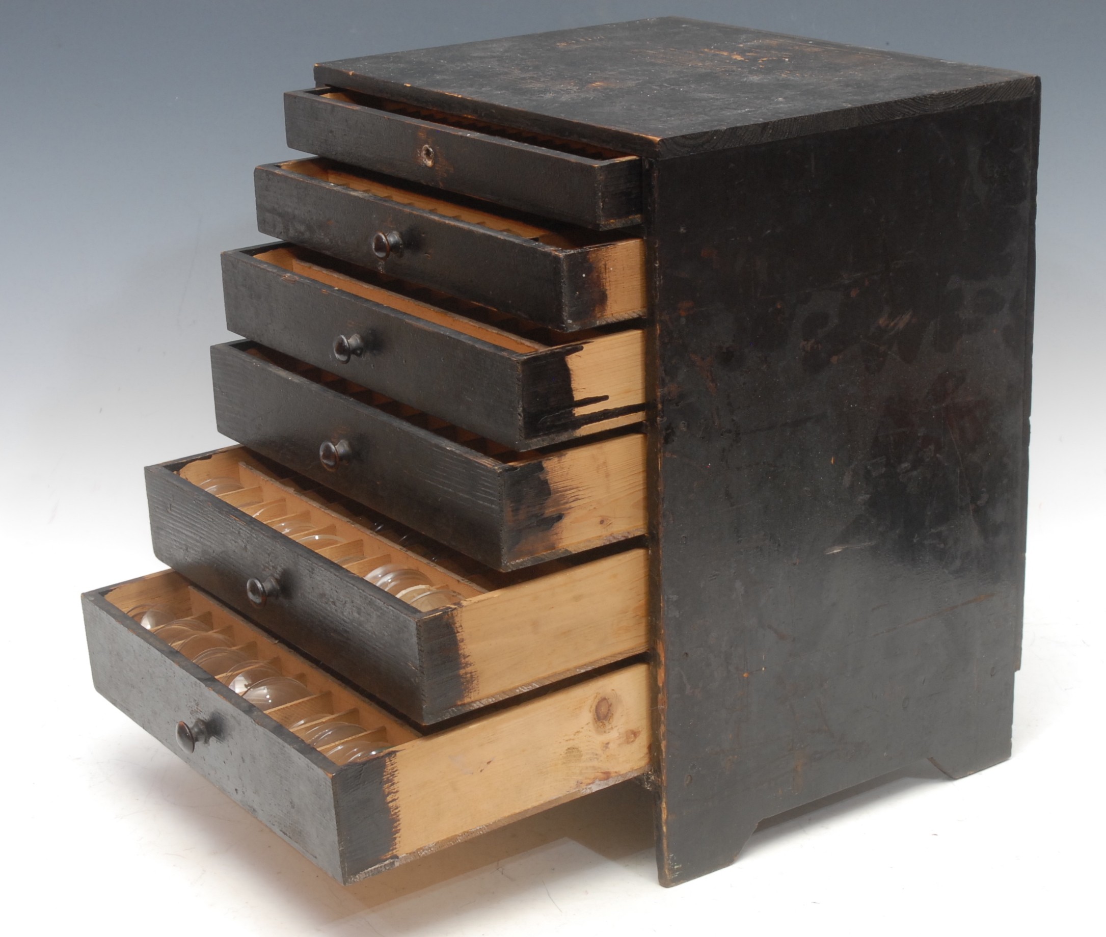 Horological Spares - a miniature table or workbench top black painted pine graduated six drawer chest, 36.7cm x 29.5cm x 24cm, each drawer fitted with numbered compartments containing over 500 glass watch crystals and pocket watch glasses, from approx 20mm to 51mm diameter, assorted makers include VTF (Verrerie de Trois Fontaines), J & Cie, etc qty