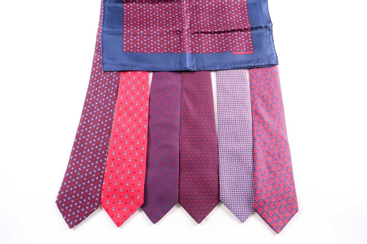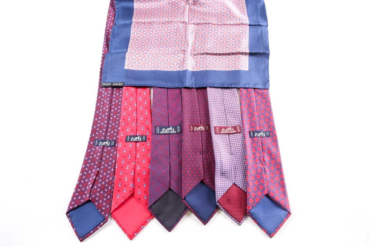 A group of seven Hermes silk ties, various designs, and a silk hankerchief.
