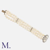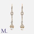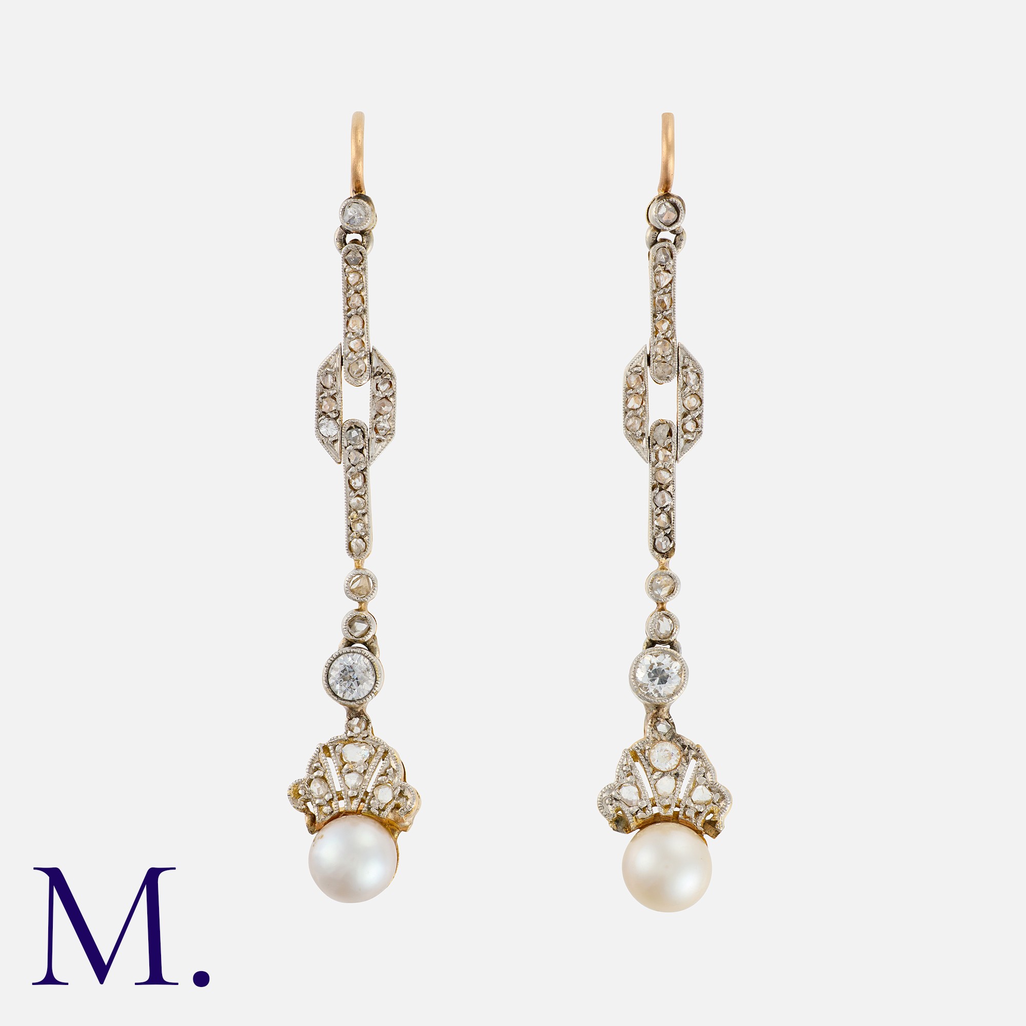 A Pair Of Pearl And Diamond Earrings in yellow gold, each comprising a series of articulated links, set with round and rose cut diamonds, terminating in a pearl of approximately 0.5mm. Unmarked, tests indicate 15 carat gold.