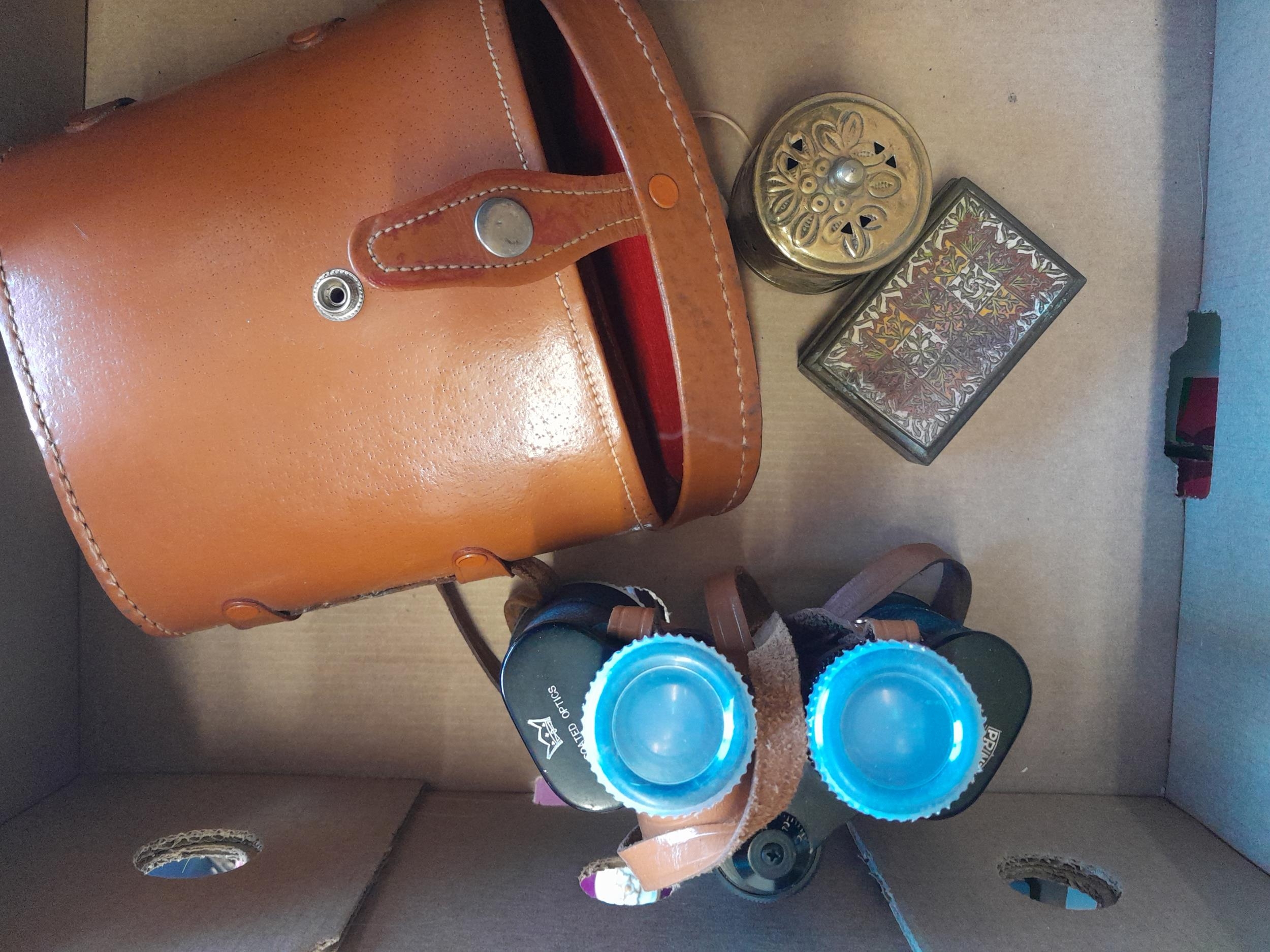 Box of oddments : Prinz binoculars, brassware, stamps First ...