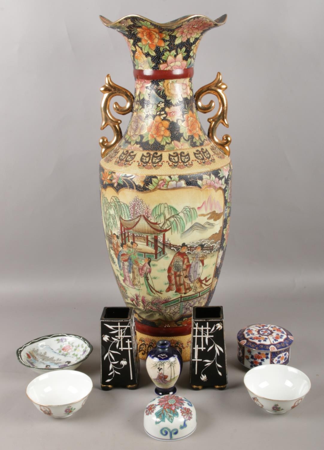 A collection of oriental ceramics, to include large decorative vase, lidded trinket dish and a pair of cuboid black glass vases