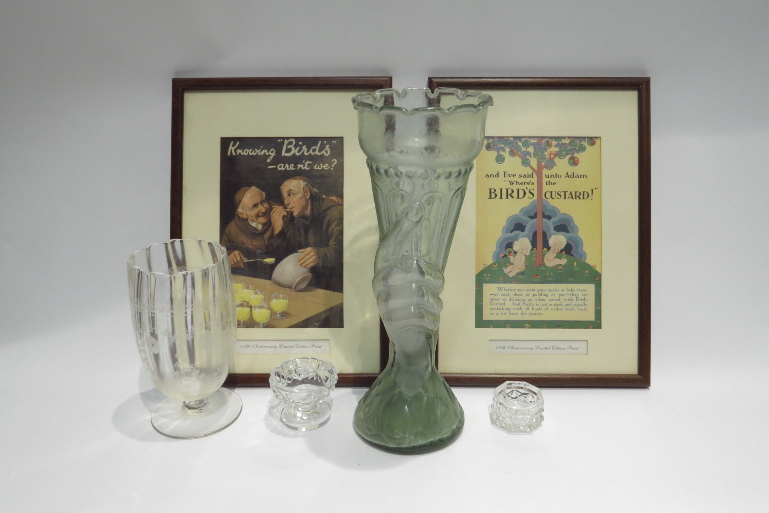 A pair of Bird's custard advertising prints, framed and glazed, an Edwardian etched celery glass, glass vase as a hand holding Olympic torch etc. (6)