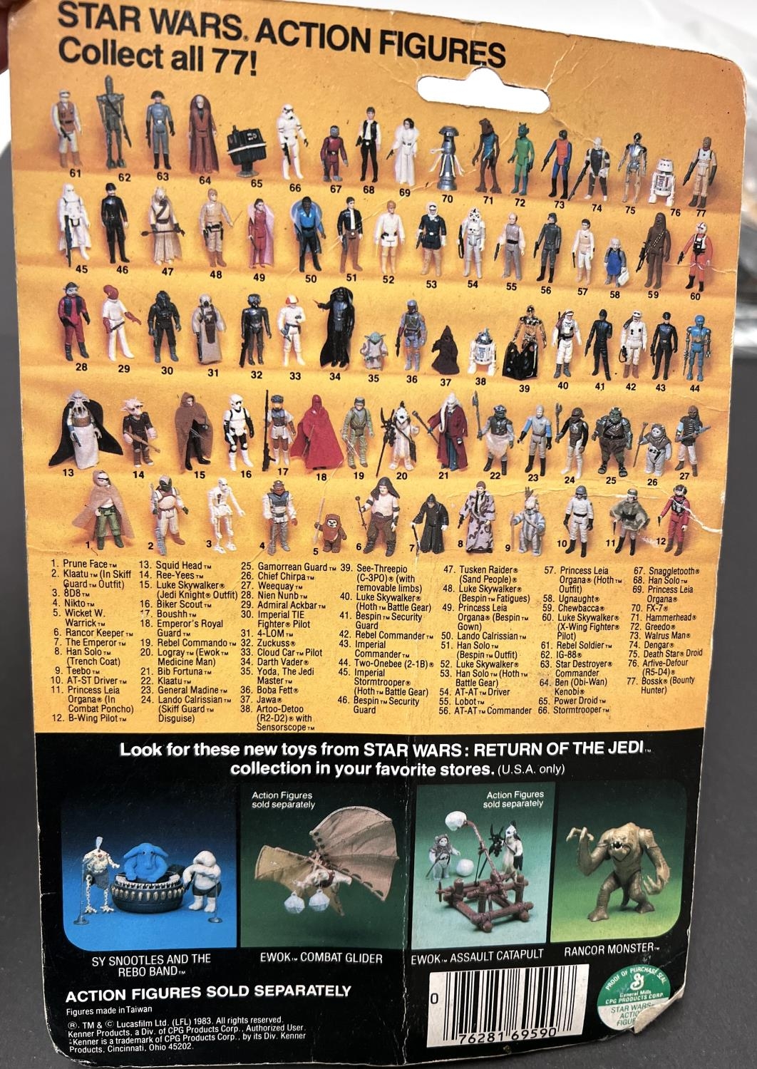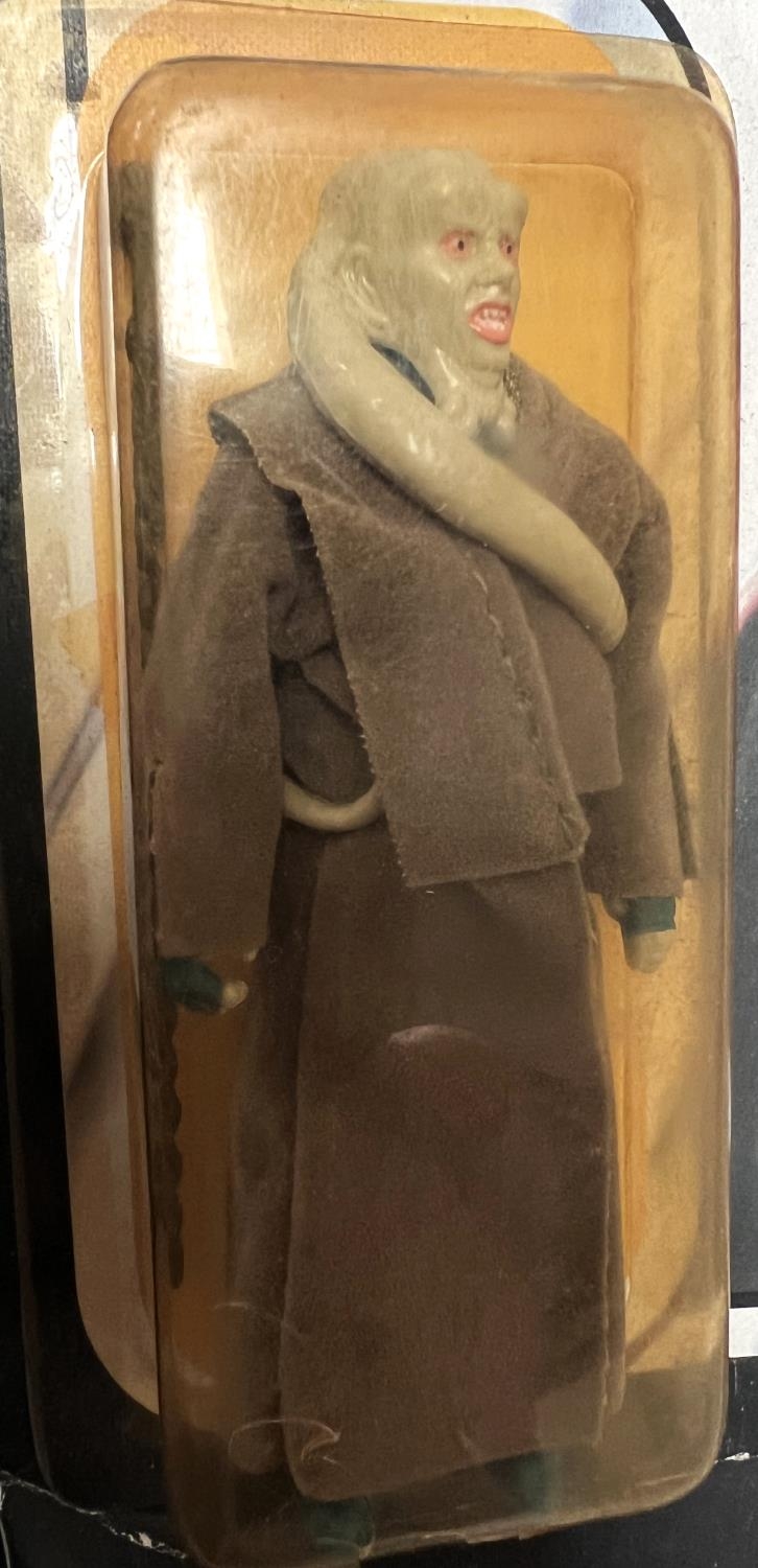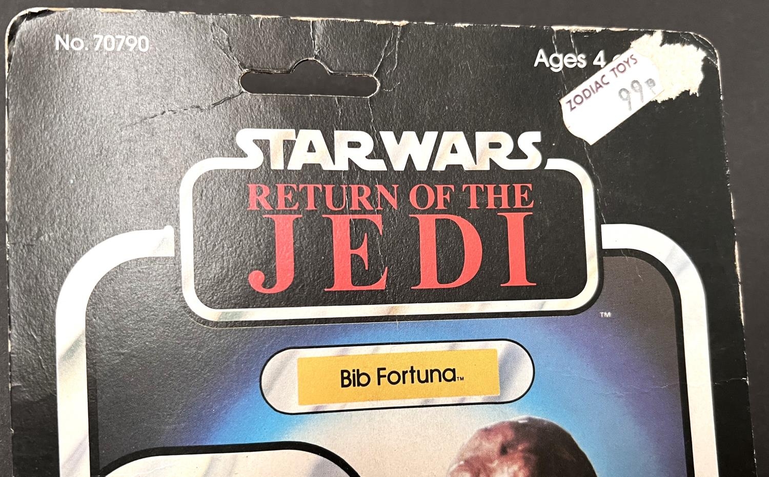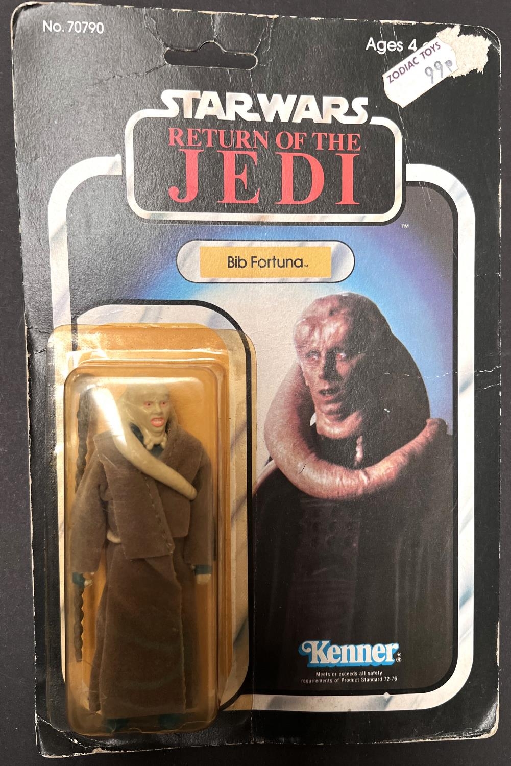 A Kenner Return of the Jedi figure on 77 card: Bib Fortuna, 3.75", slightly yellowed blister pack, car slightly worn, toyshop sticker and rip to top right