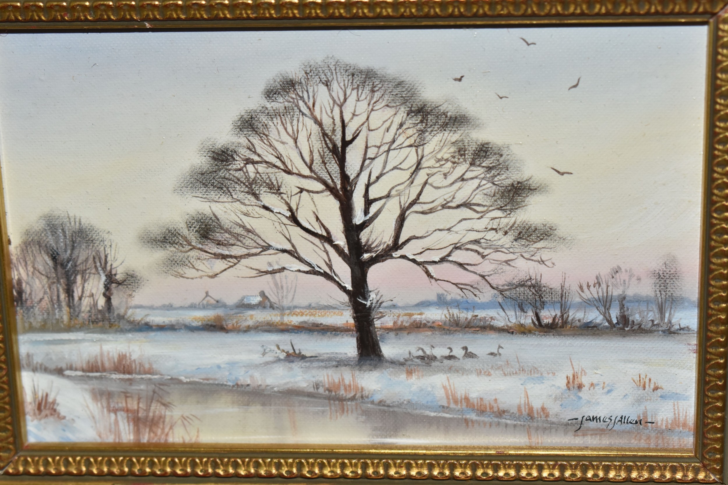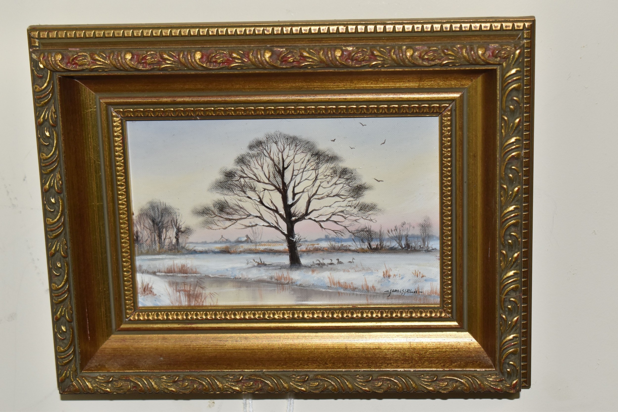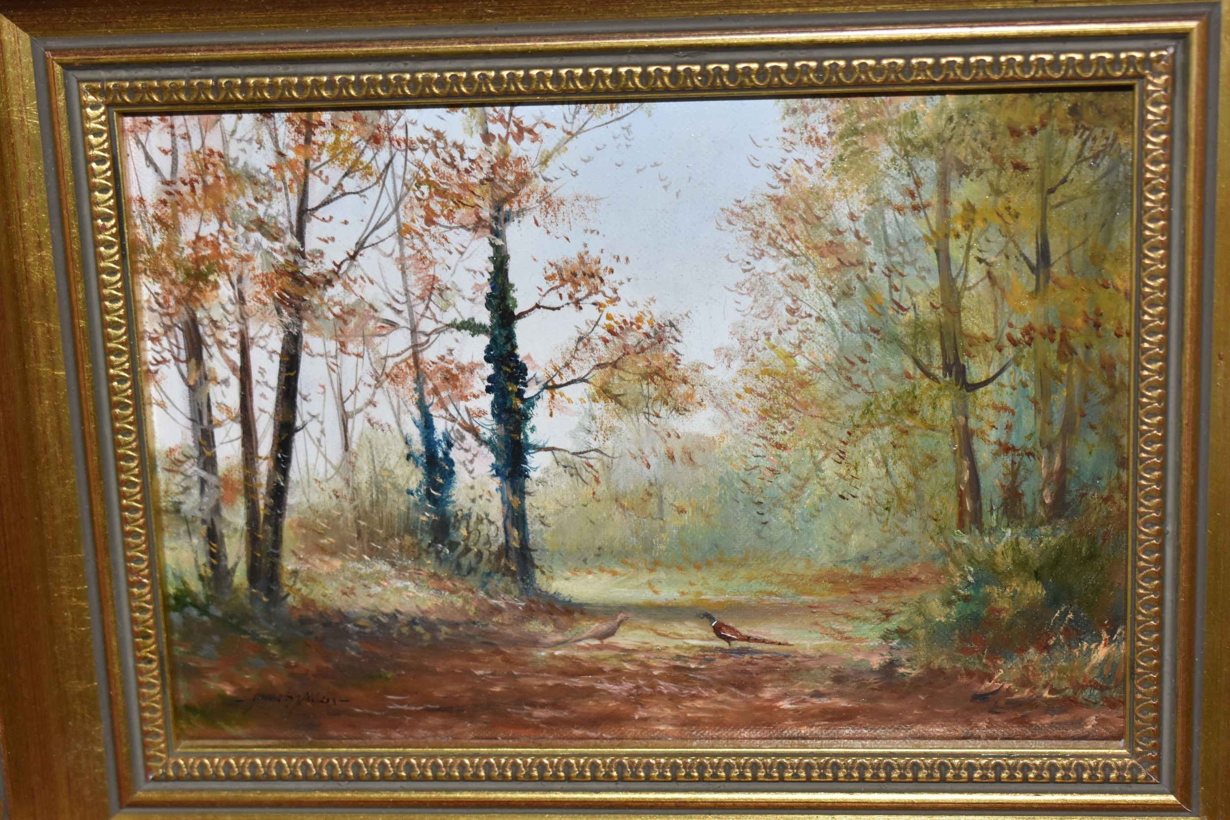 JAMES ALLEN (CONTEMPORARY) 'AUTUMN NEAR FRAMLINGTON, SUFFOLK', a woodland landscape with pheasants, signed bottom left, titled with artist label verso, oil on board, approximate size 11.5cm x 16.5cm, together with 'Winter near Southwold' a winter landscape by the same hand, approximate size 9cm x 14cm, Condition Report: both in good condition