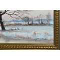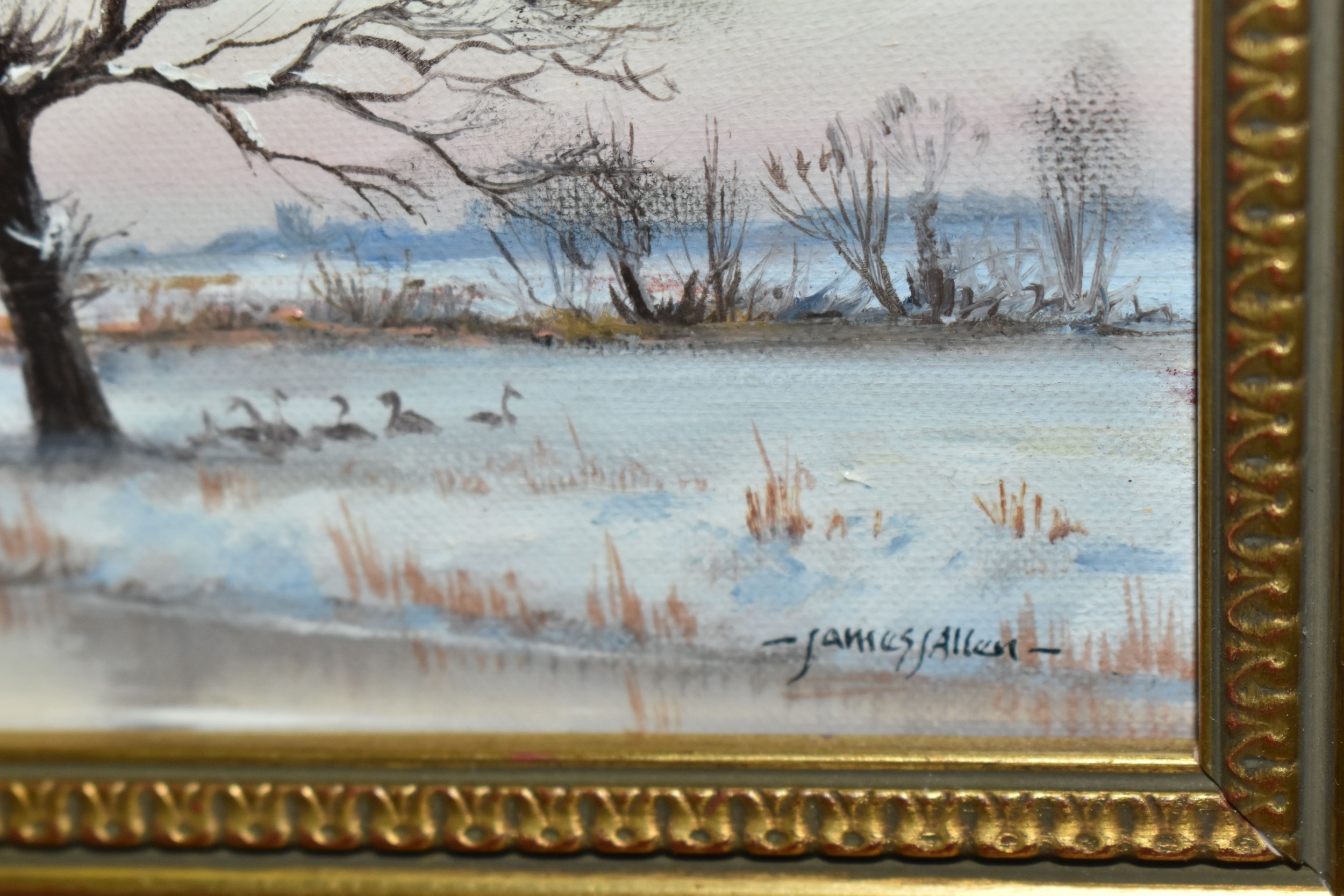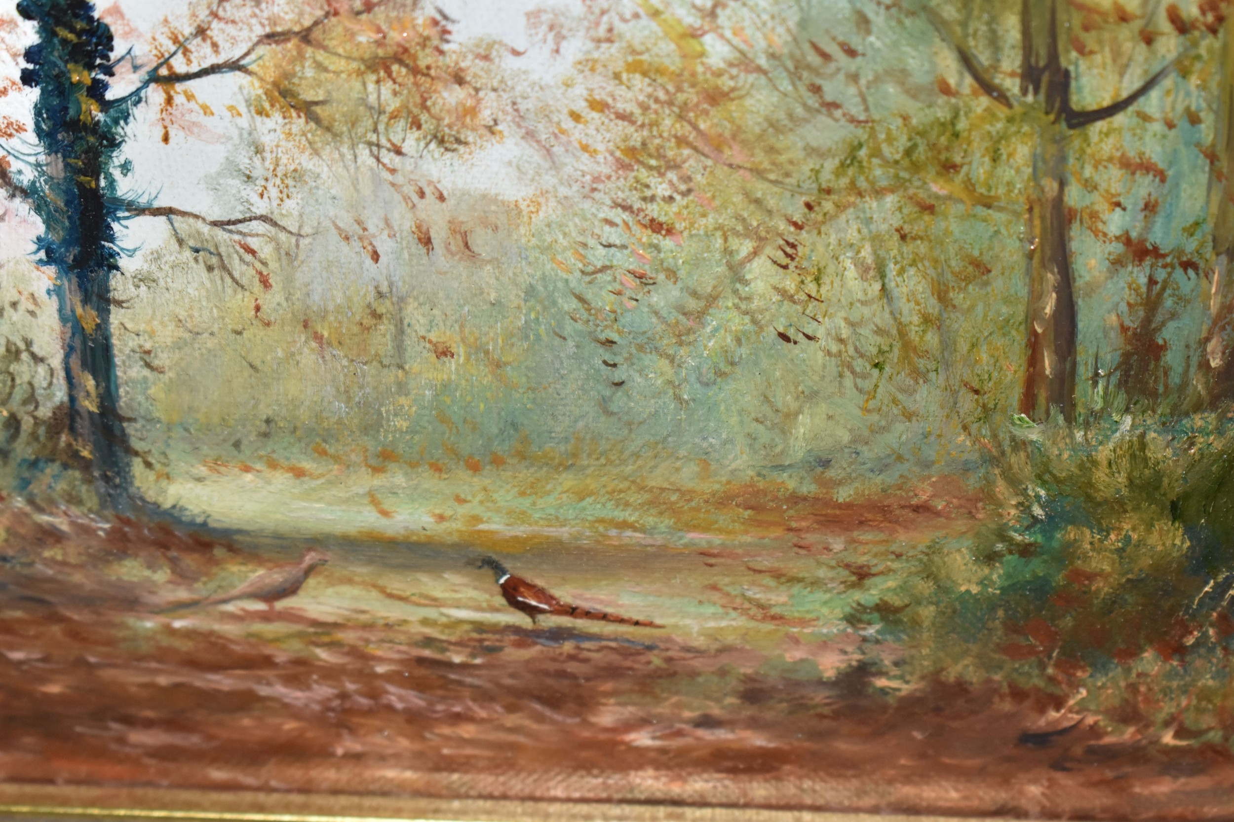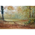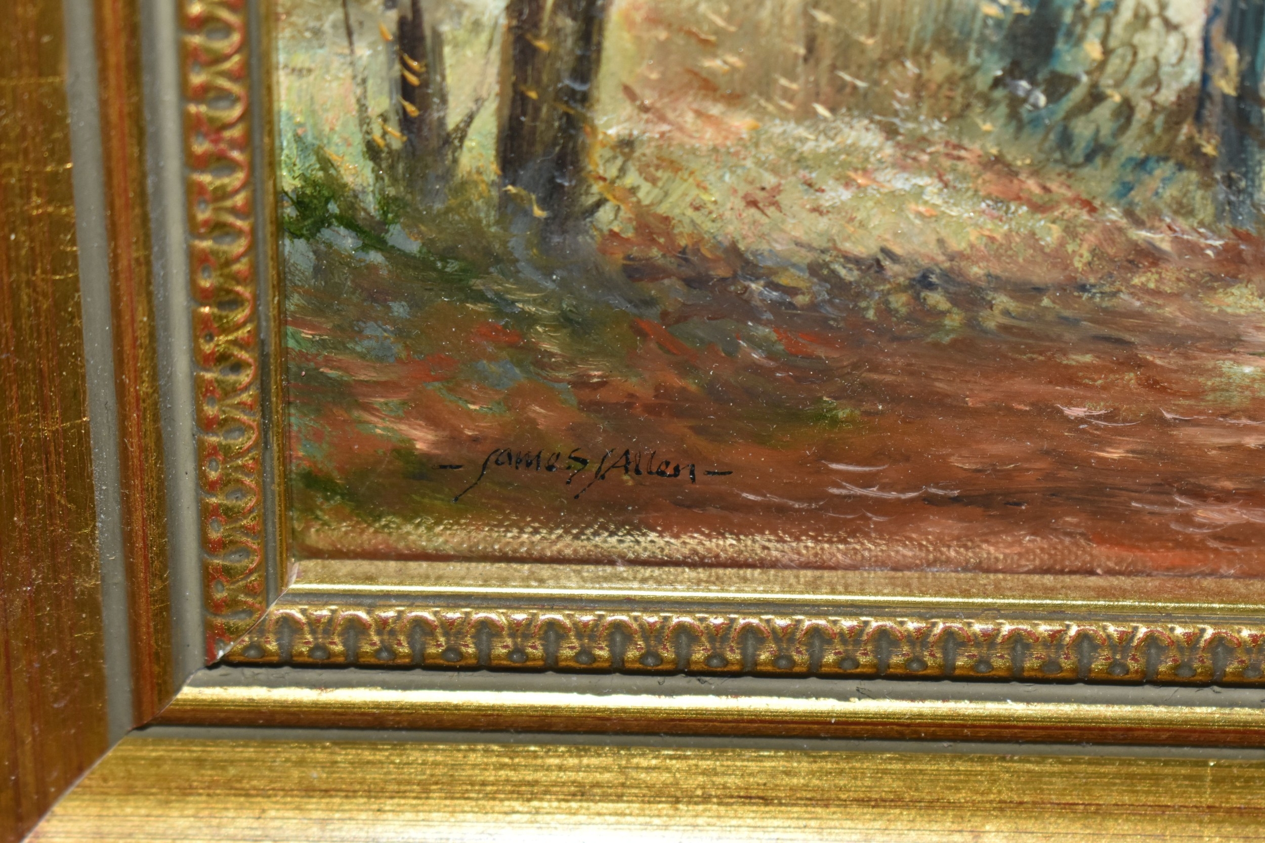 JAMES ALLEN (CONTEMPORARY) 'AUTUMN NEAR FRAMLINGTON, SUFFOLK', a woodland landscape with pheasants, signed bottom left, titled with artist label verso, oil on board, approximate size 11.5cm x 16.5cm, together with 'Winter near Southwold' a winter landscape by the same hand, approximate size 9cm x 14cm, Condition Report: both in good condition
