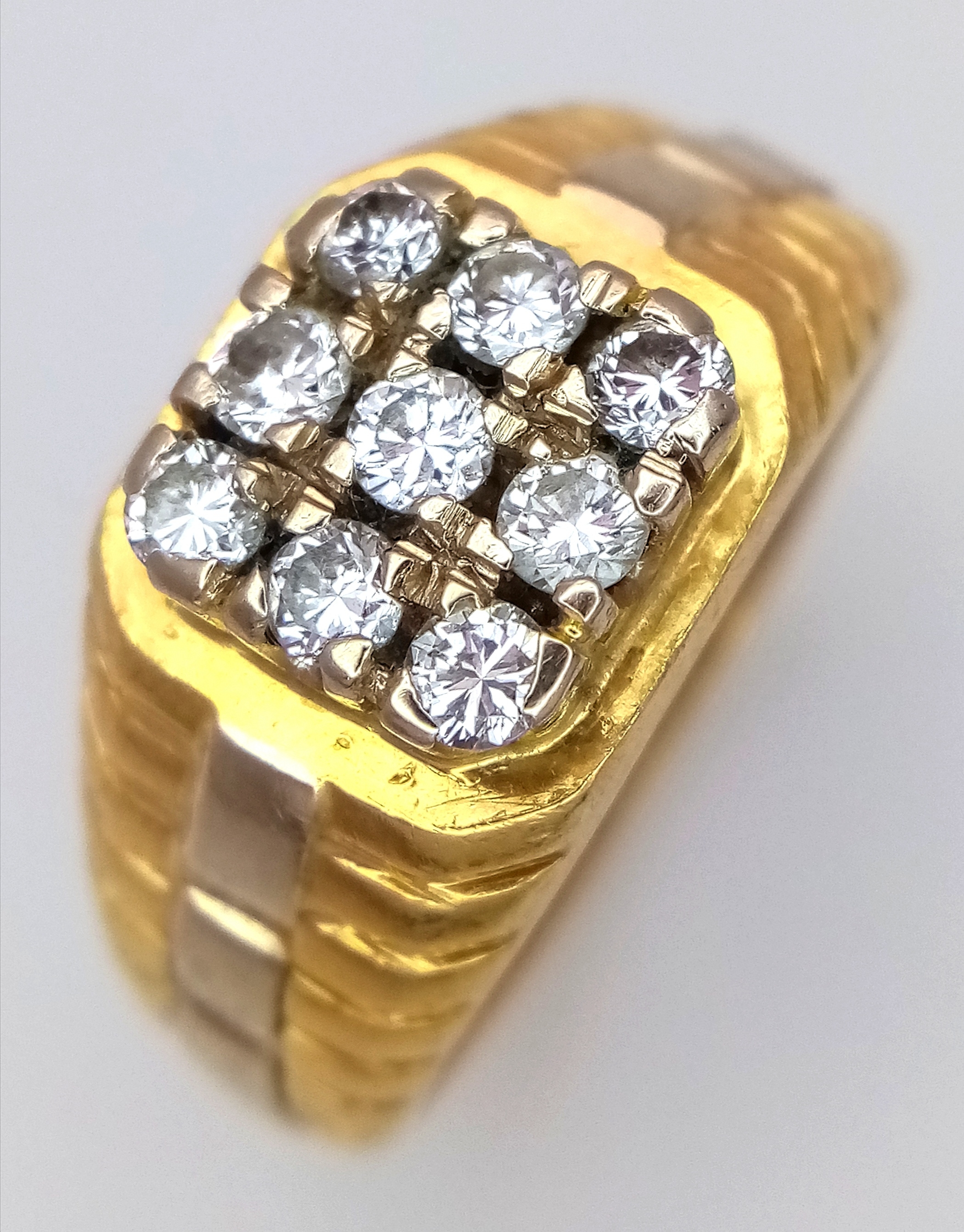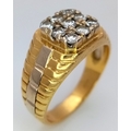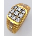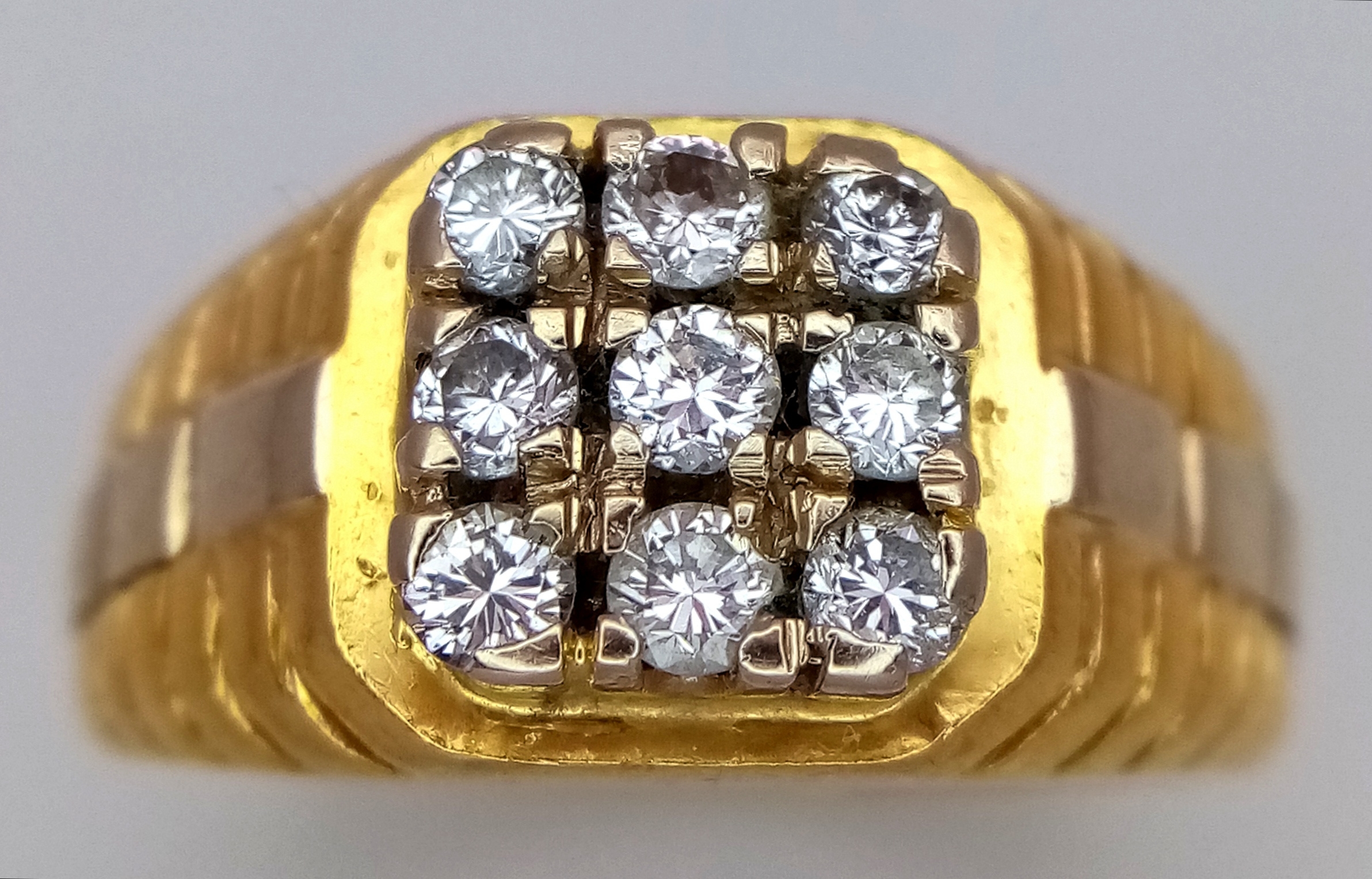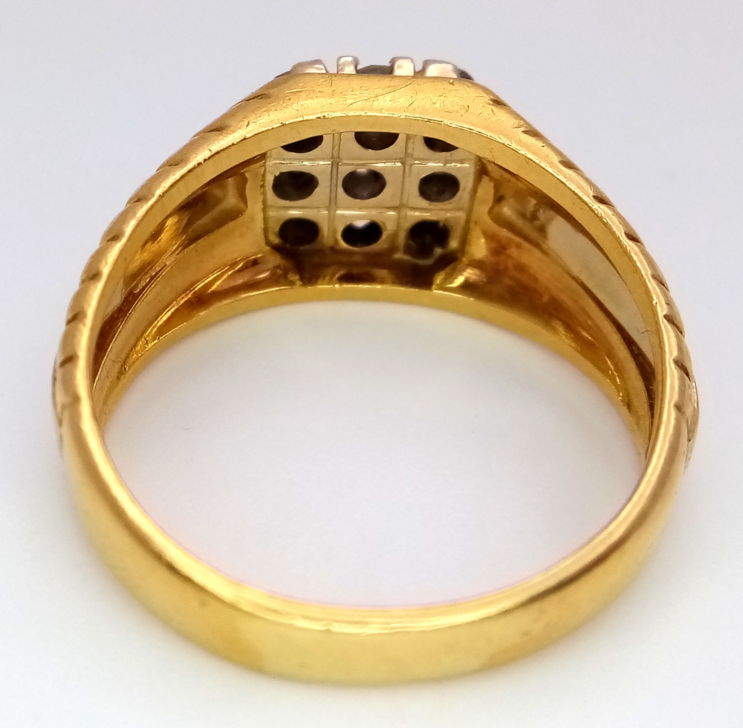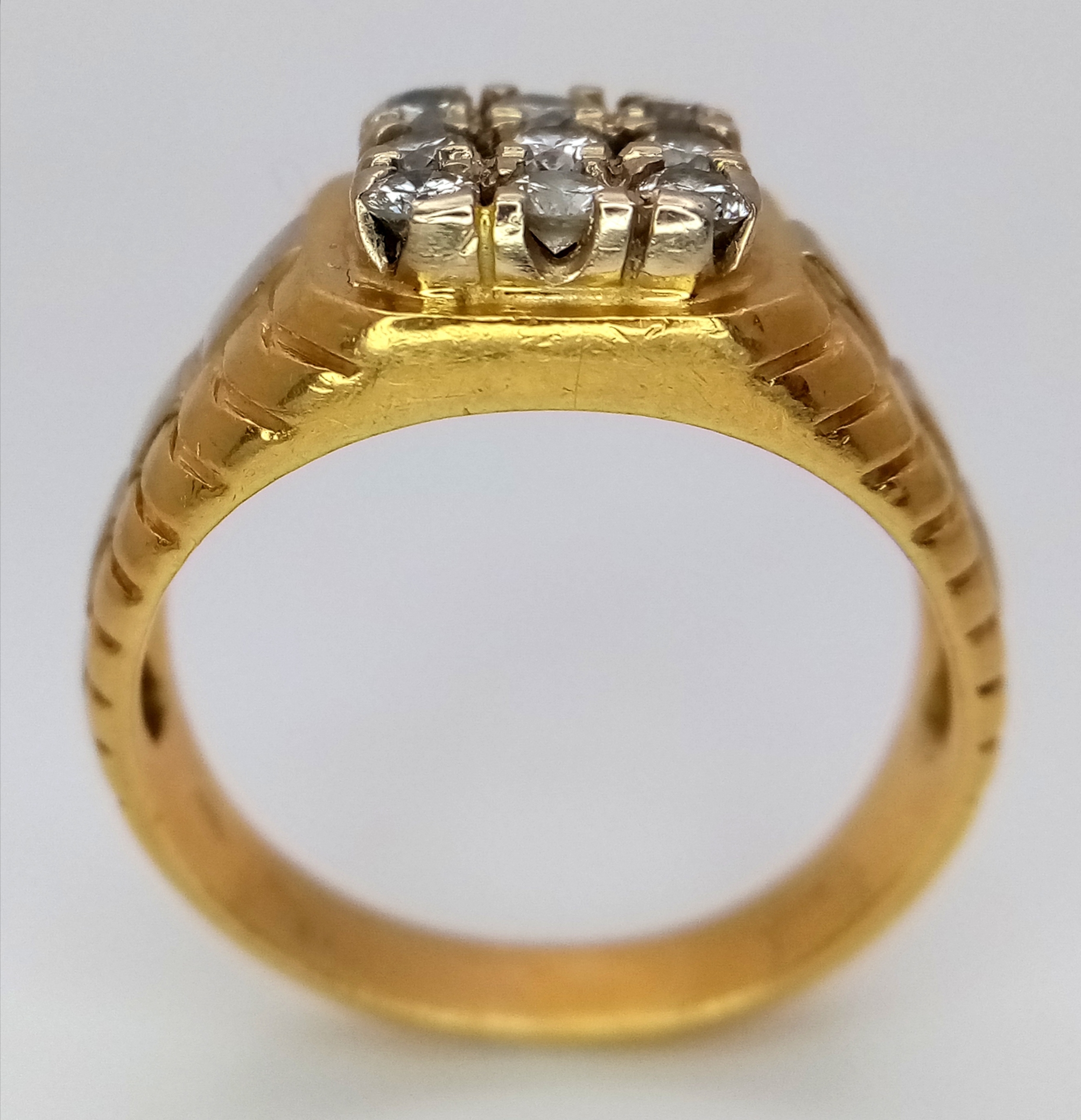 AN 18K YELLOW GOLD DIAMOND SET RING. NINE ROUND BRILLIANT CUT DIAMONDS - 0.40CTW. 9G. SIZE T. SPSA-1019.
