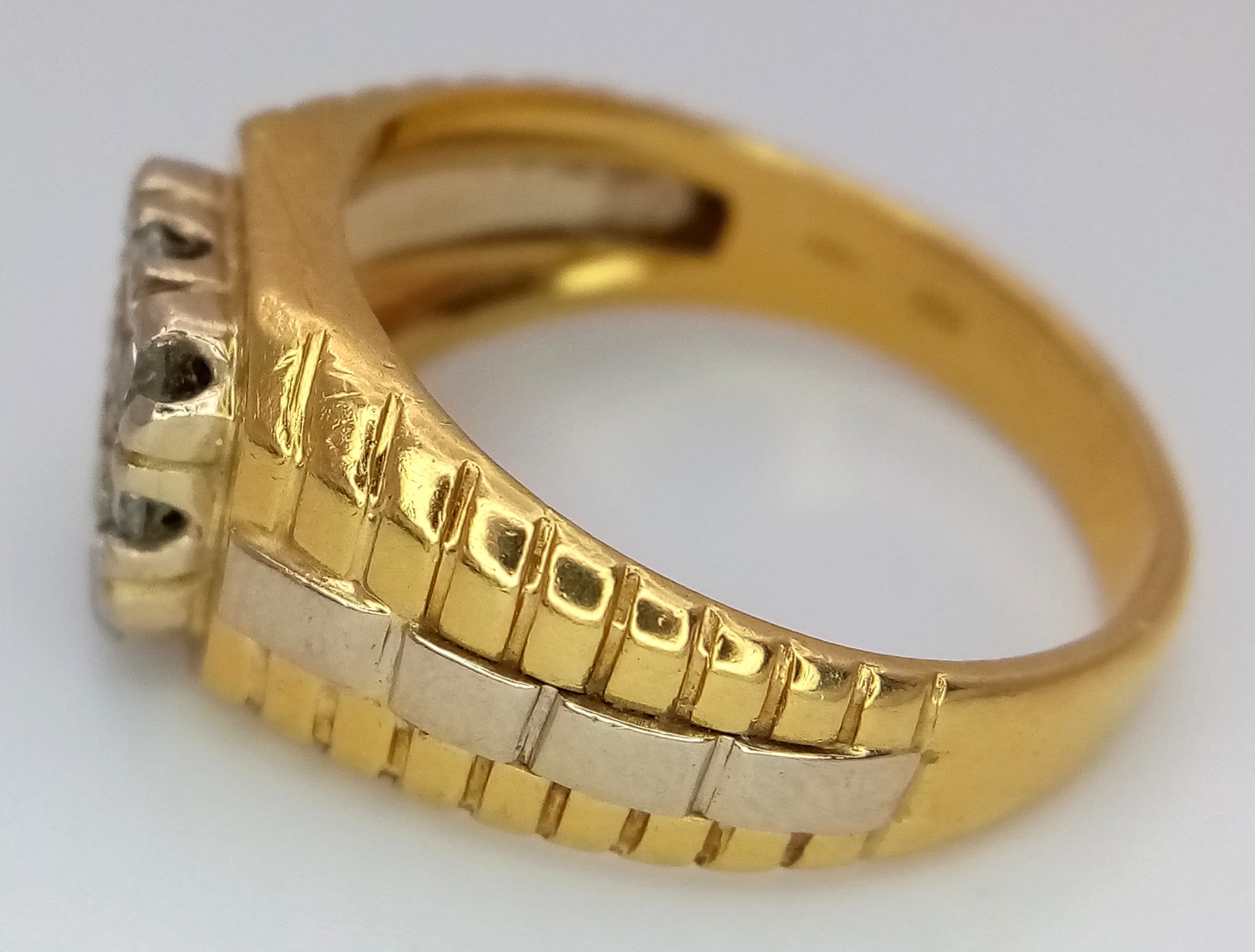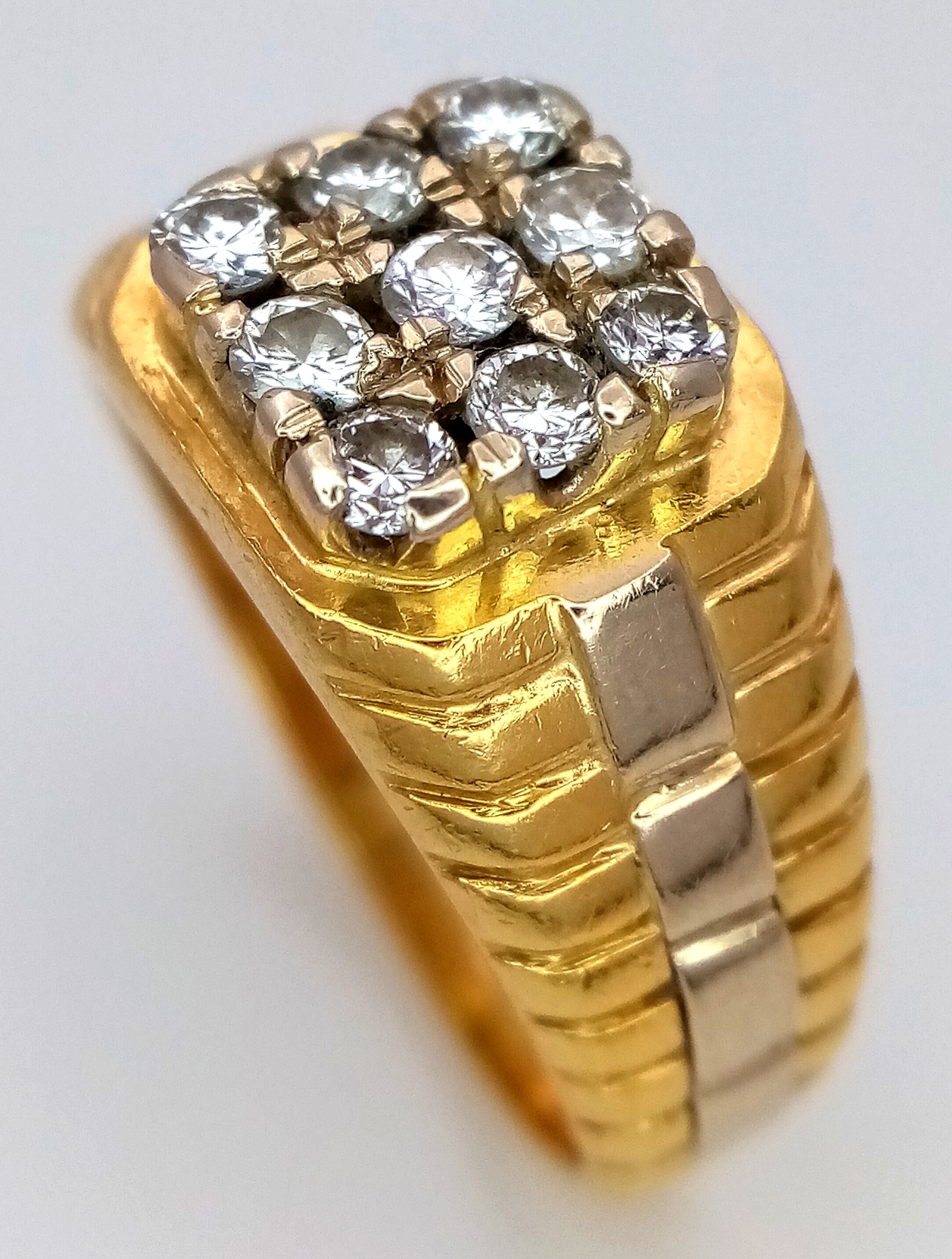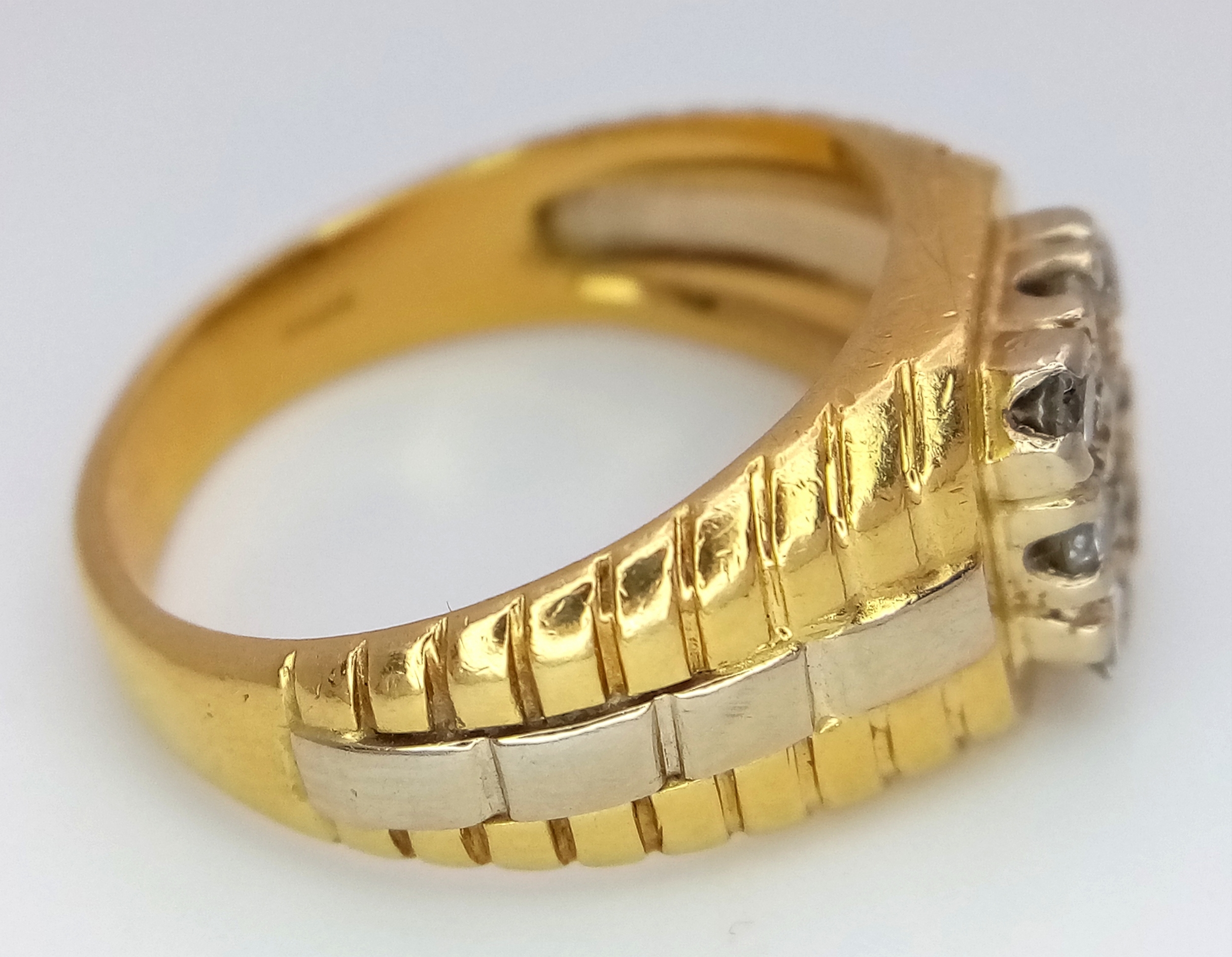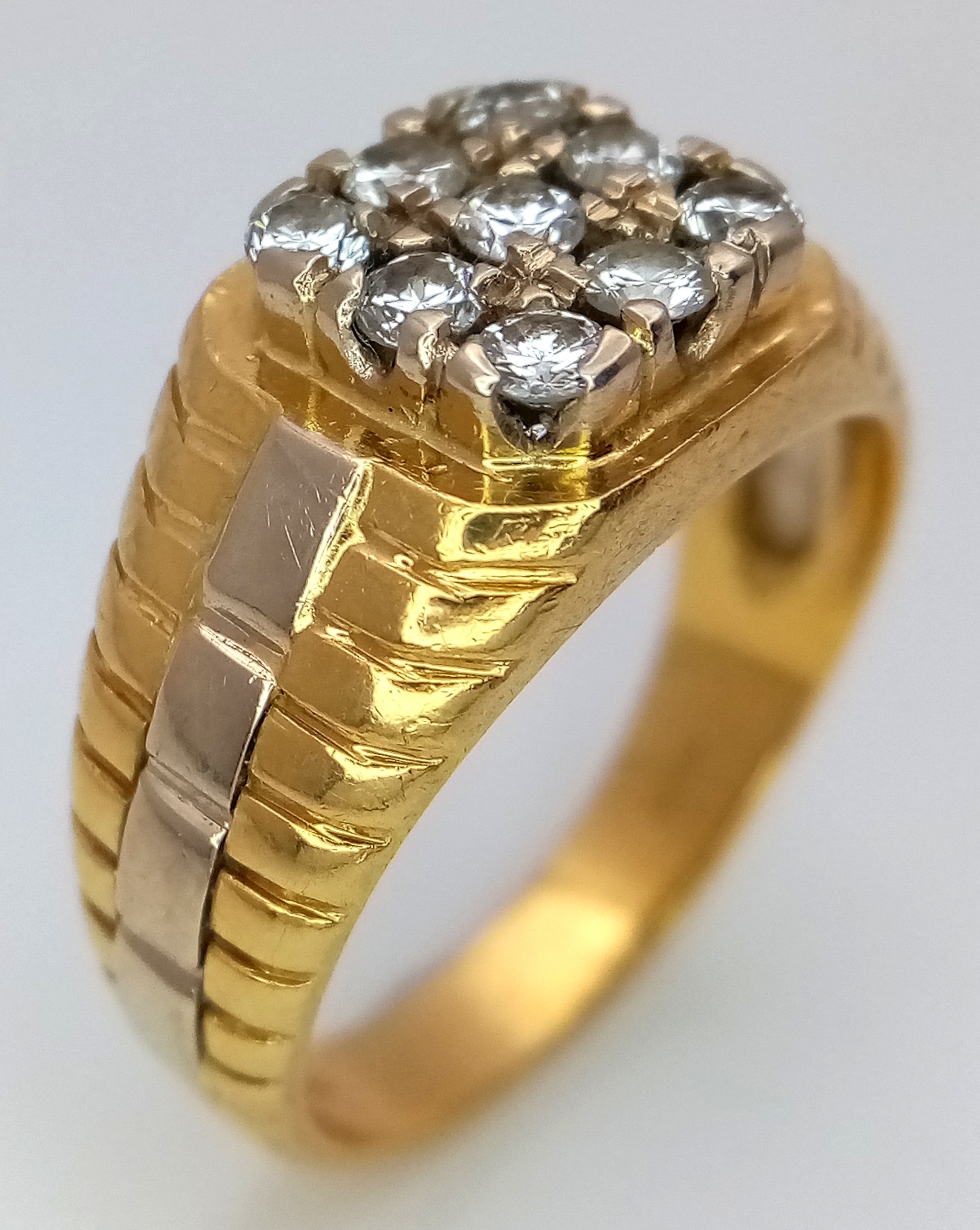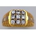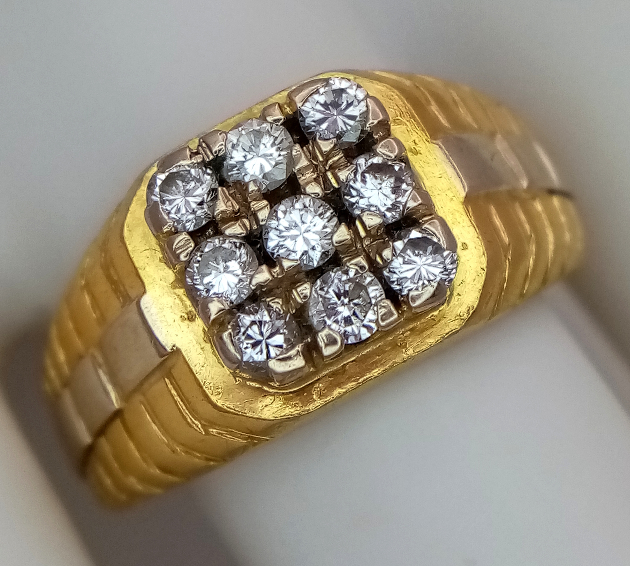 AN 18K YELLOW GOLD DIAMOND SET RING. NINE ROUND BRILLIANT CUT DIAMONDS - 0.40CTW. 9G. SIZE T. SPSA-1019.