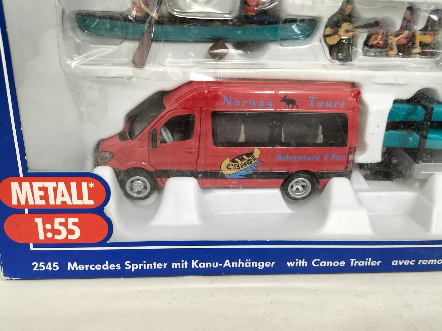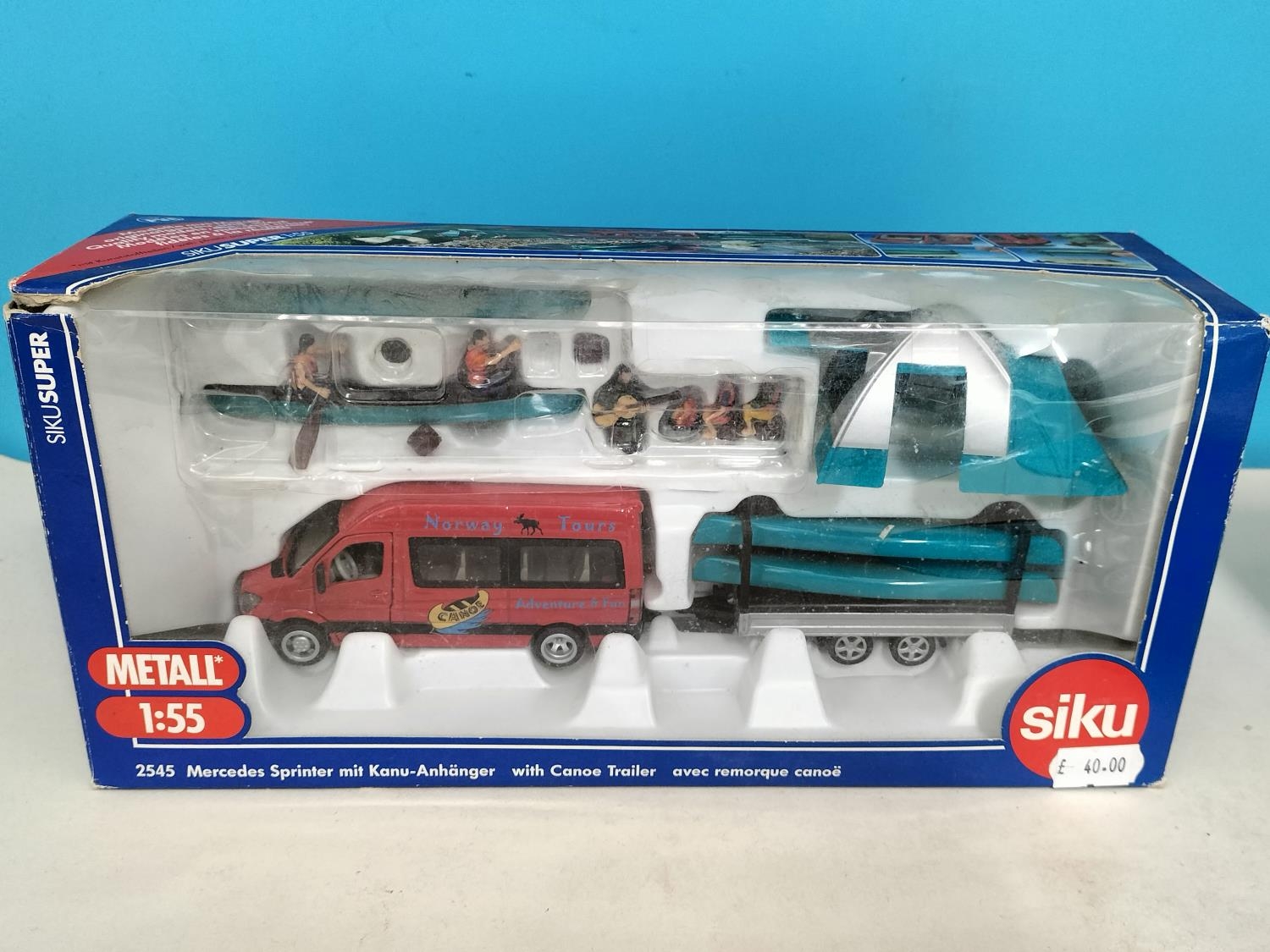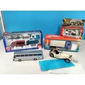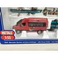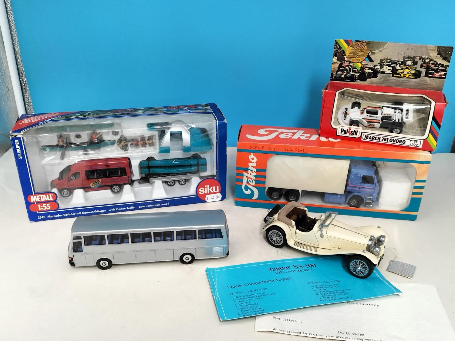 Collection of Die-Cast Vehicles (5) to include Boxed Siku 2545 Mercedes Sprinter with Canoe Trailer (Complete), Boxed Tekno Scanoa 143M Box Van, Cased Kassbohrer Setra Bus Type S, Boxed Polistil March 761 Ovoro F1 Car and a Boxed Franklin Mint 1938 Jaguar SS-100.