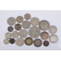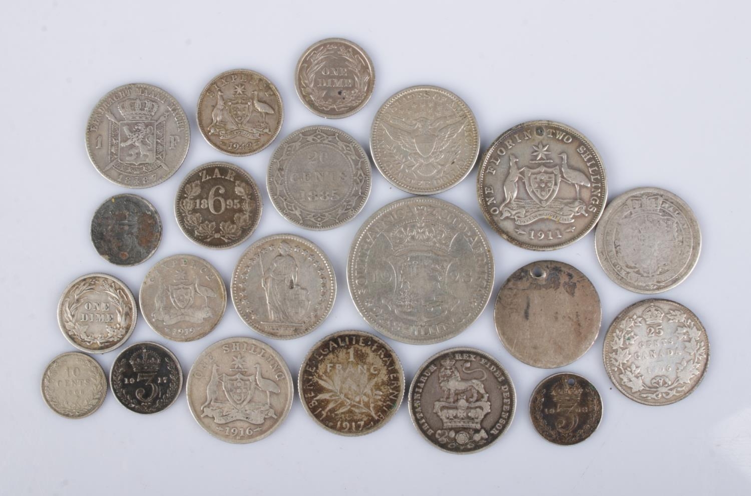 A quantity of silver coinage, consisting of 925 grade and others. Includes George III and IV shillings, 1911 Australian one florin and two shillings, 1906 quarter dollar, 1928 South African 2½ shillings and 1885 Newfoundland 20 cents. Total weight: 95.6g