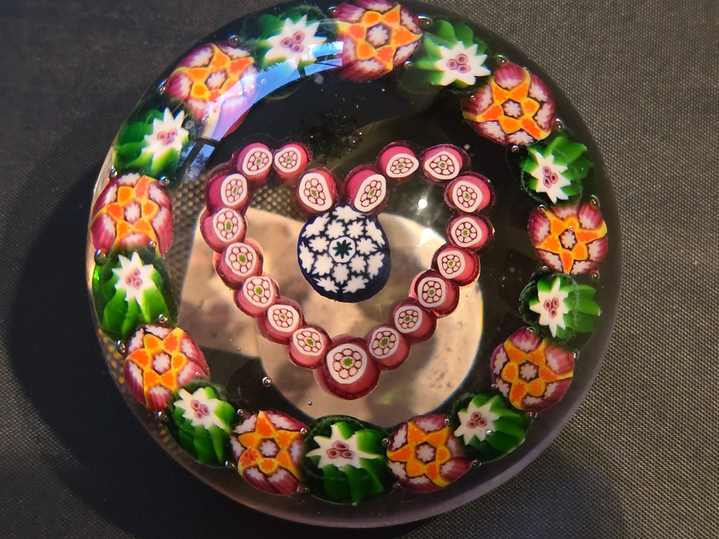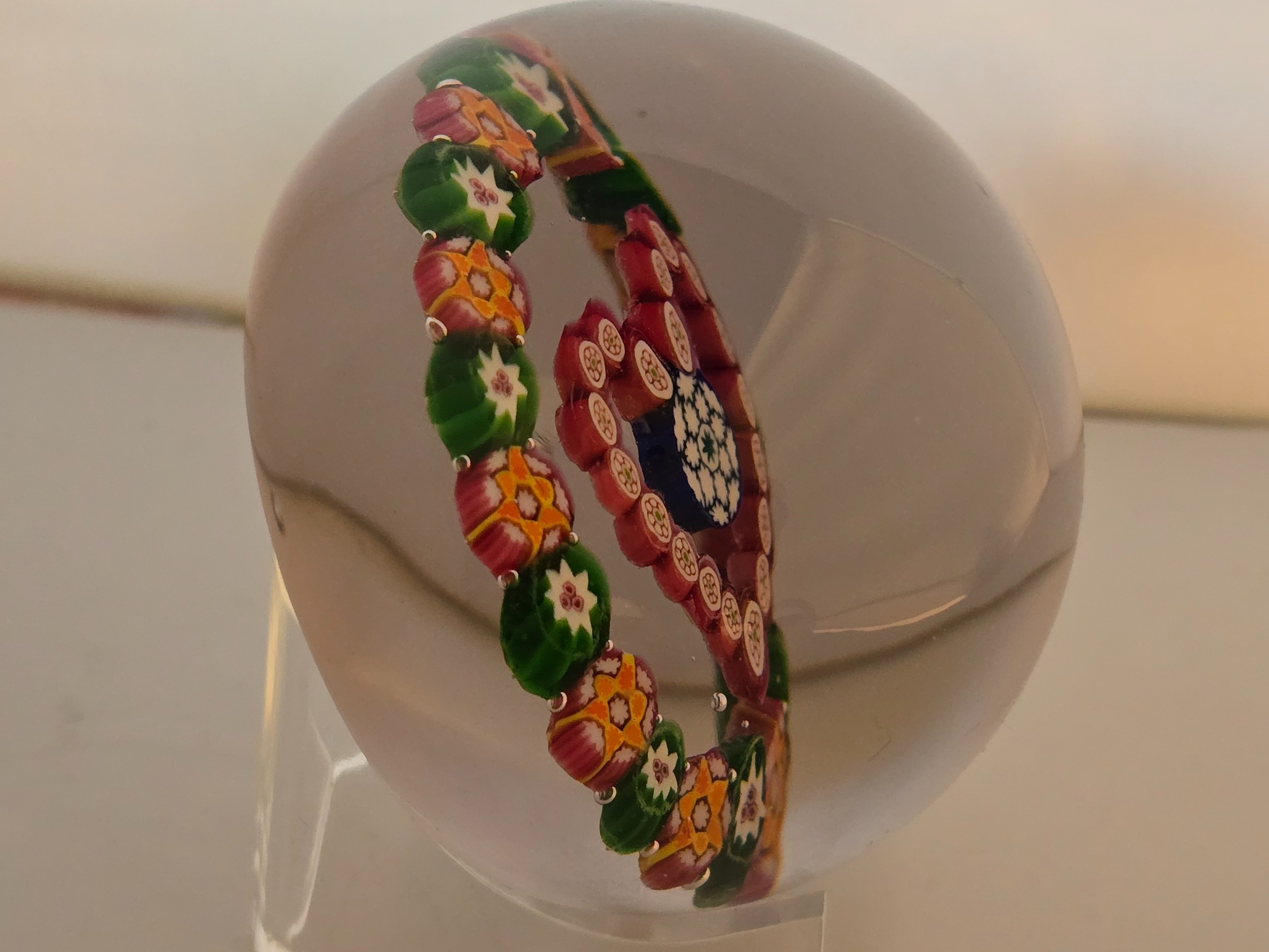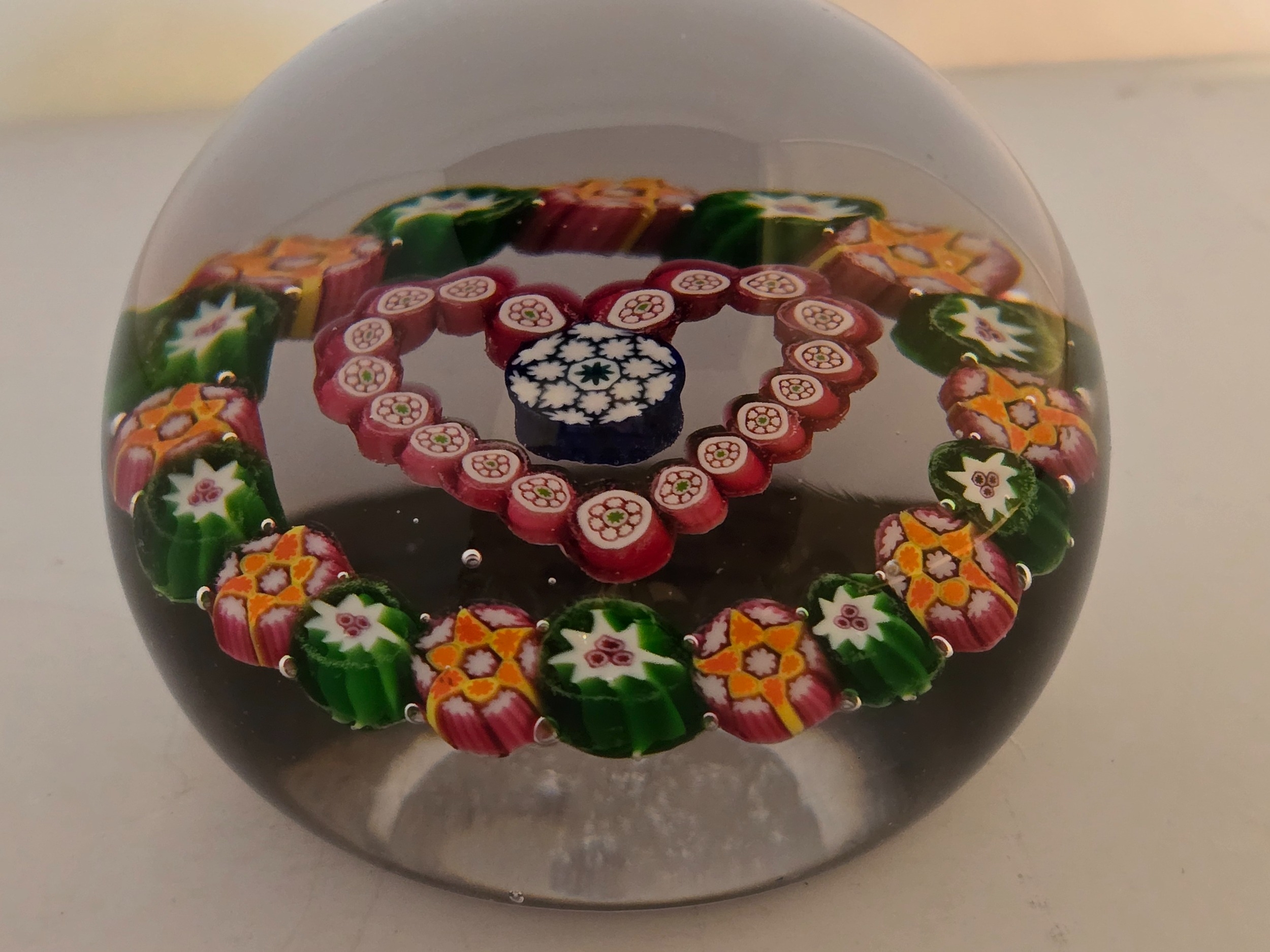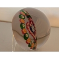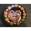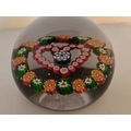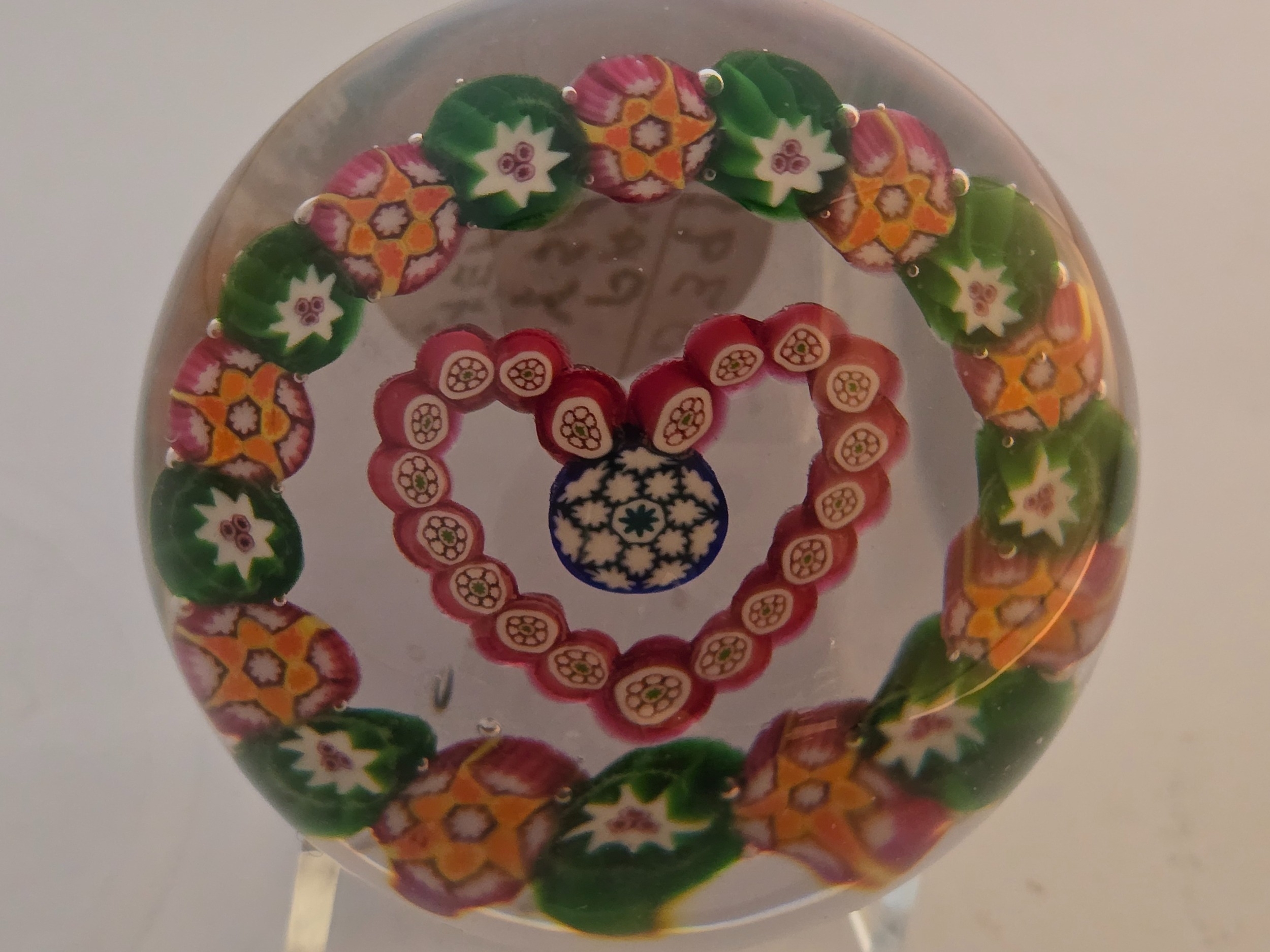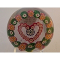 Valentines Gift; Paul Ysart paperweight - "Heart". Central complex cane enclosed in red millefiori heart. Outer garland of alternating green and orange complex canes. All on clear glass. Polished base. Diam: 75mm or just under 3inches (2 15/16th)
