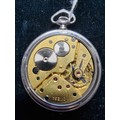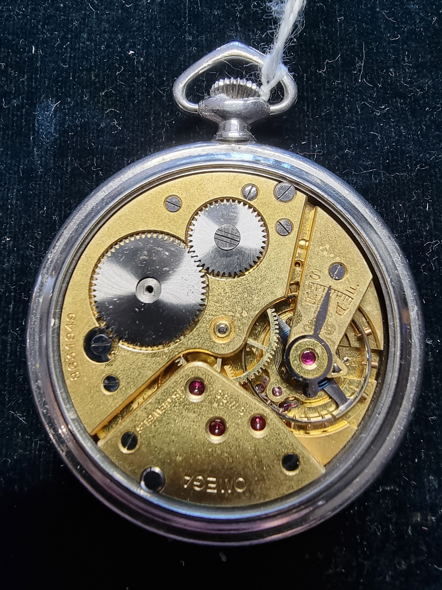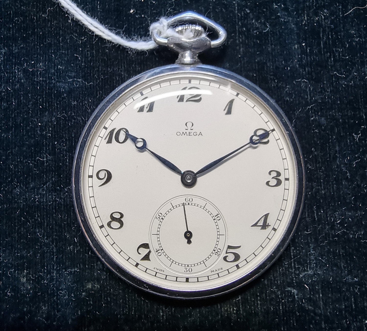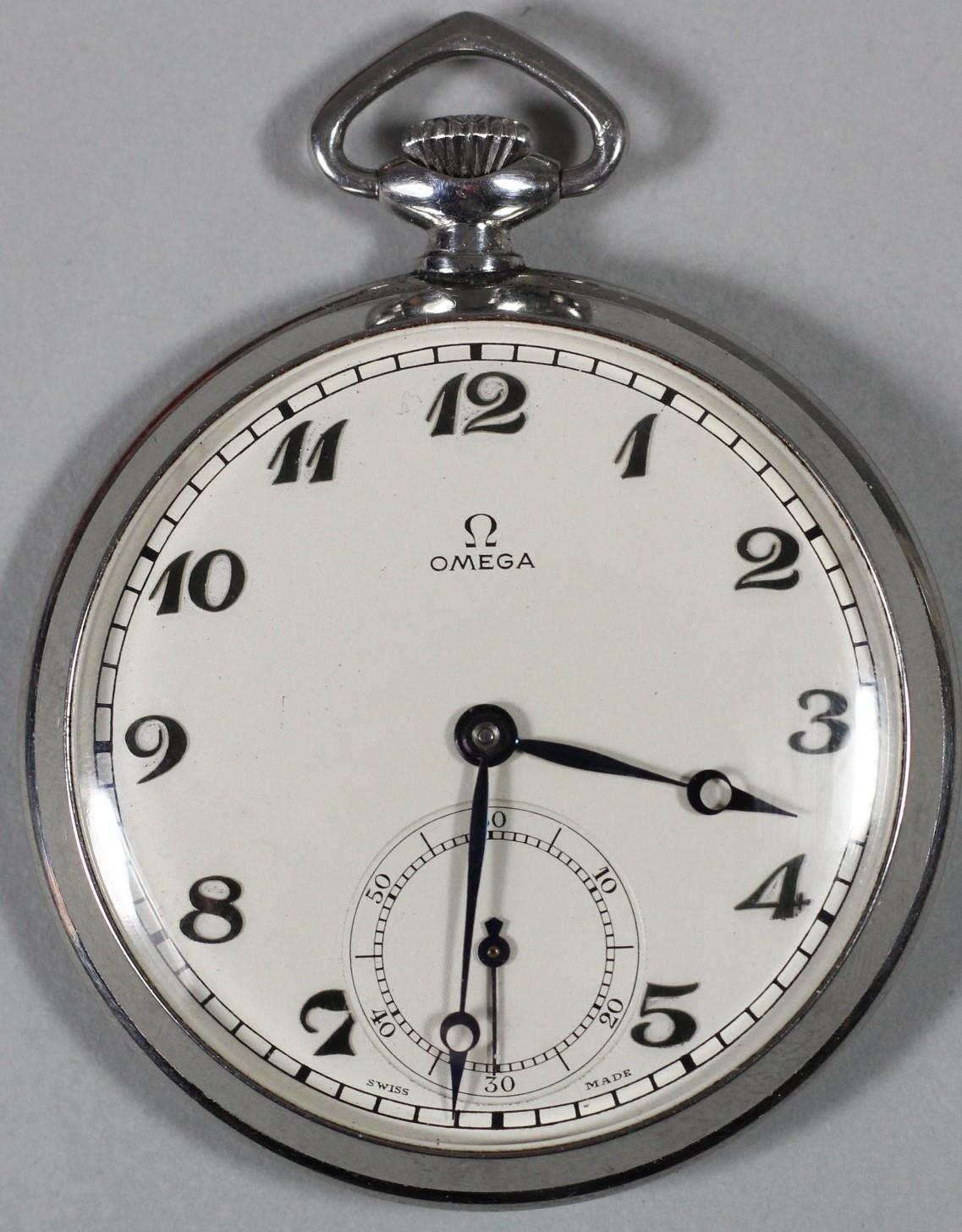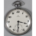 Omega, a stainless steel open face key less wind pocket watch, with subsidiary seconds dial, the signed movement numbered 8631949, c. 1936.