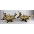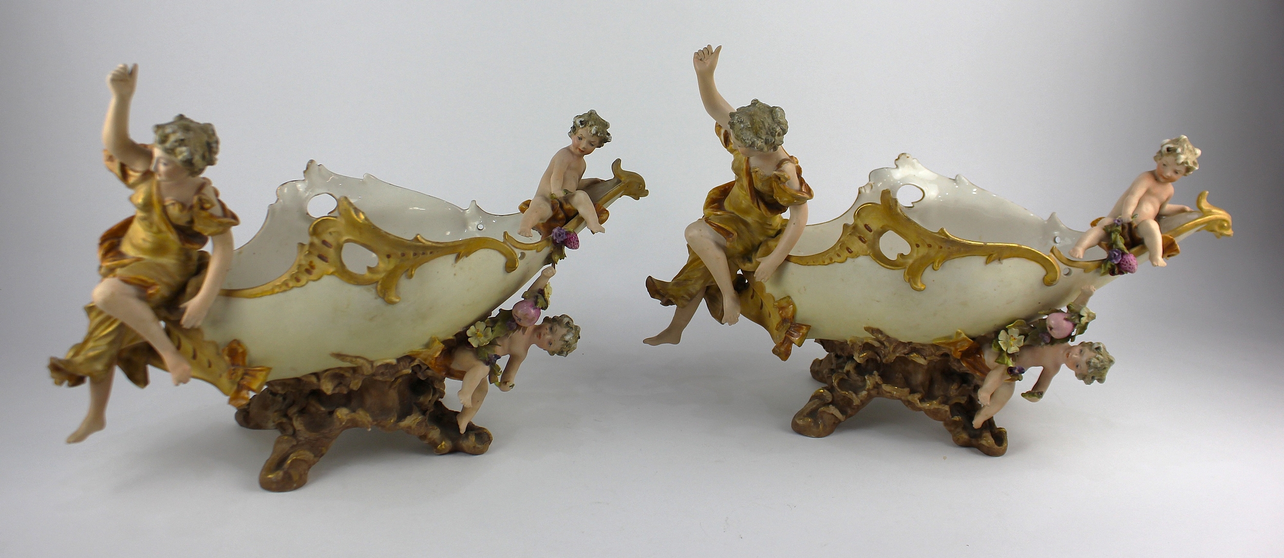 A pair of Ernst Wahliss style porcelain figural table centrepieces decorated with classical figures and cherubs, marked '4122' to base 26cm high, 39cm long (a/f)