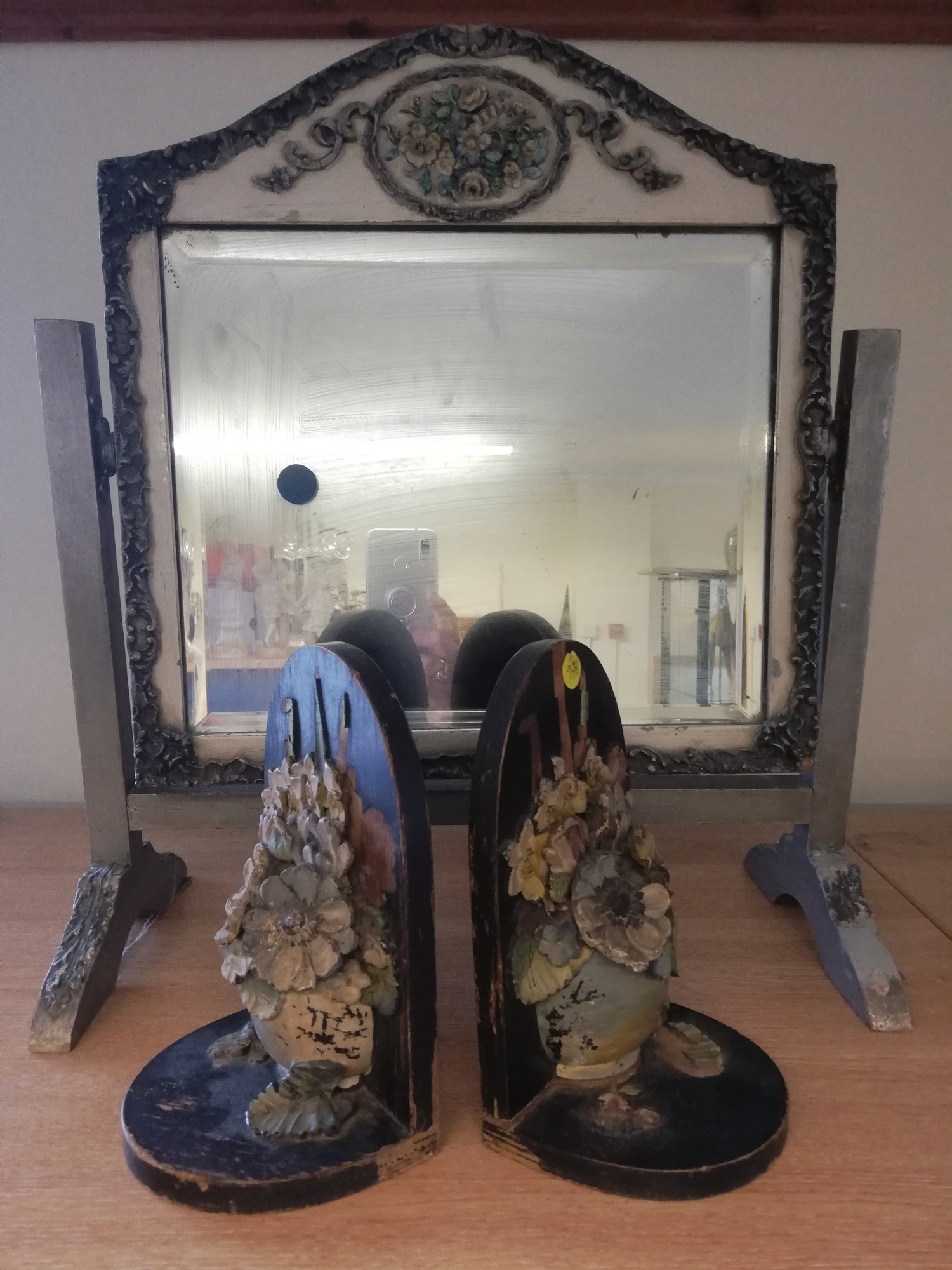 Barbola swing mirror t/w a pair of 1920's flower encrusted book ends
