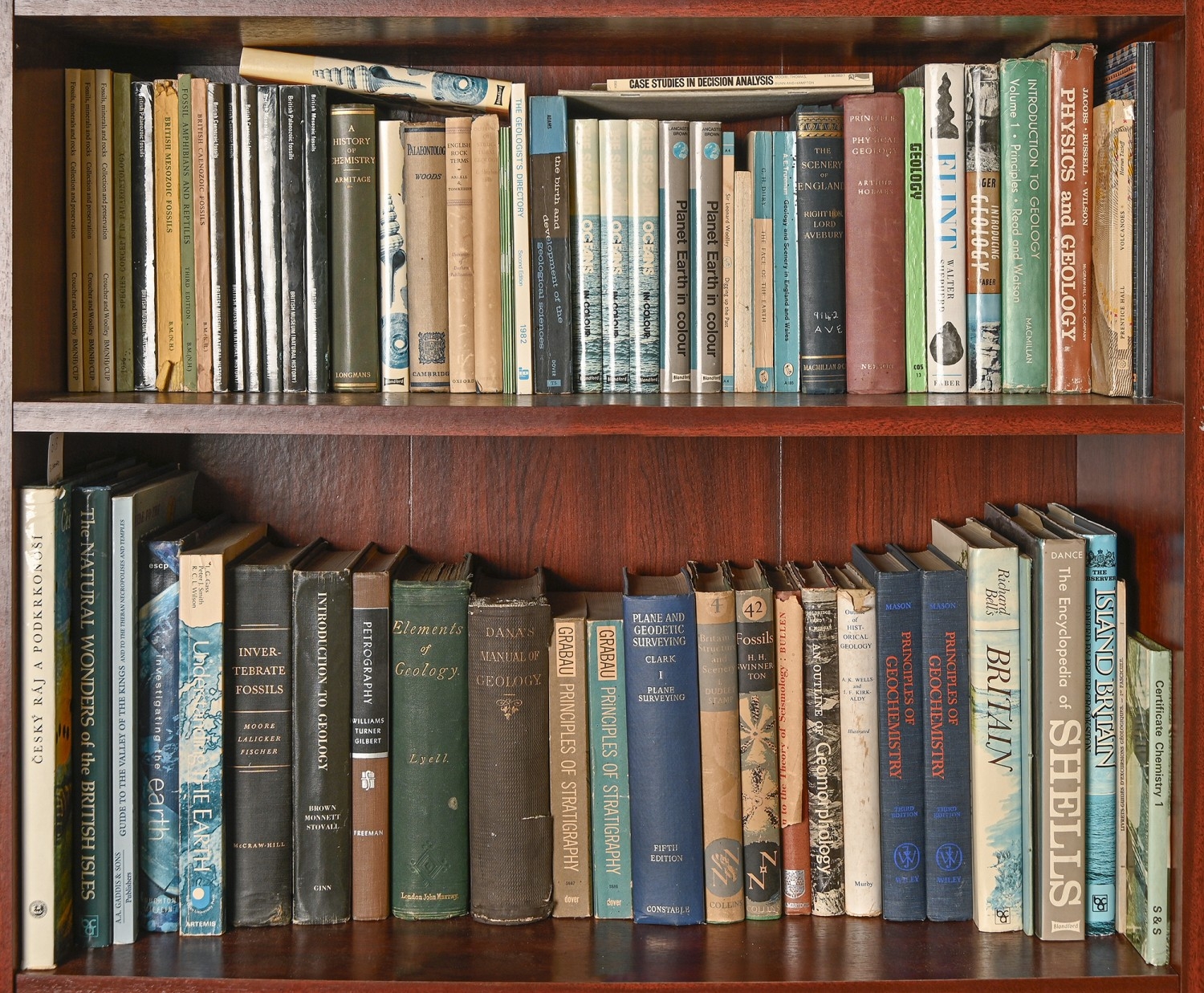Geology. Two shelves, 19th c and later, including, Dana (James D.), Manual of Geology, first edition, Philadelphia: Theodore Bliss & Co., 1863, in-text illustrations, original cloth, 8vo; Lyell's Elements of Geology, sixth edition, John Murray, 1865, original green cloth, 8vo; two New Naturalist monographs, including first edition of Swinnerton's Fossils, 1960, both with their original pictorial dustjackets over green cloth, 8vo; further palaeontology; academics imprints; pamphlets; etc