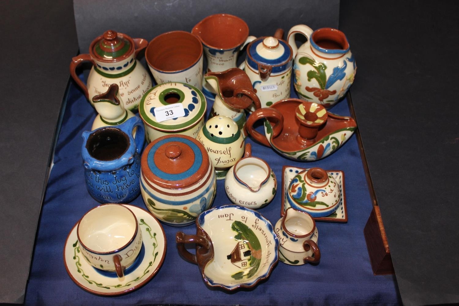 Torquay ware to include cups and saucers, jugs, beakers, vases, and others.