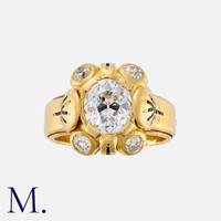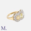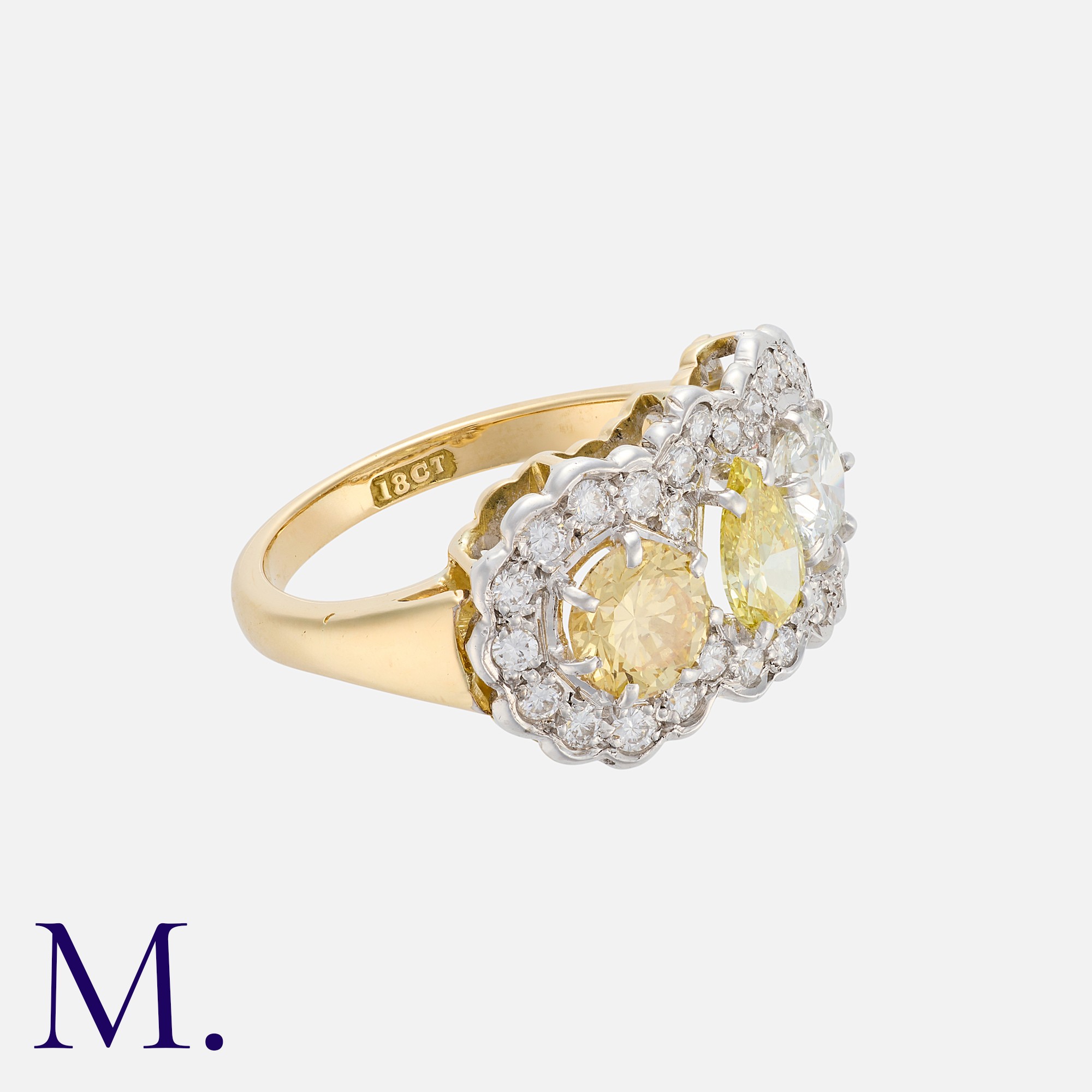 A Coloured Diamond Ring in 18k yellow and white gold, set with a round cut white diamond of 0.46ct, a round brilliant orange coloured diamond of approximately 0.60ct and a pear shaped yellow diamond of approximately 0.31ct, all within a border of round cut white diamonds. Marked 18ct.