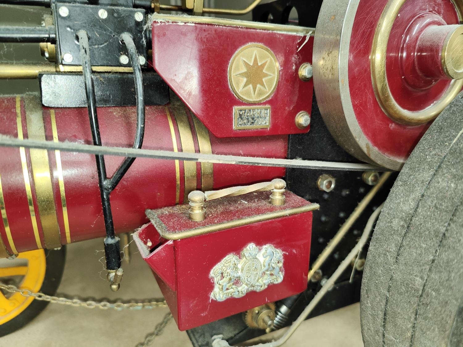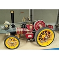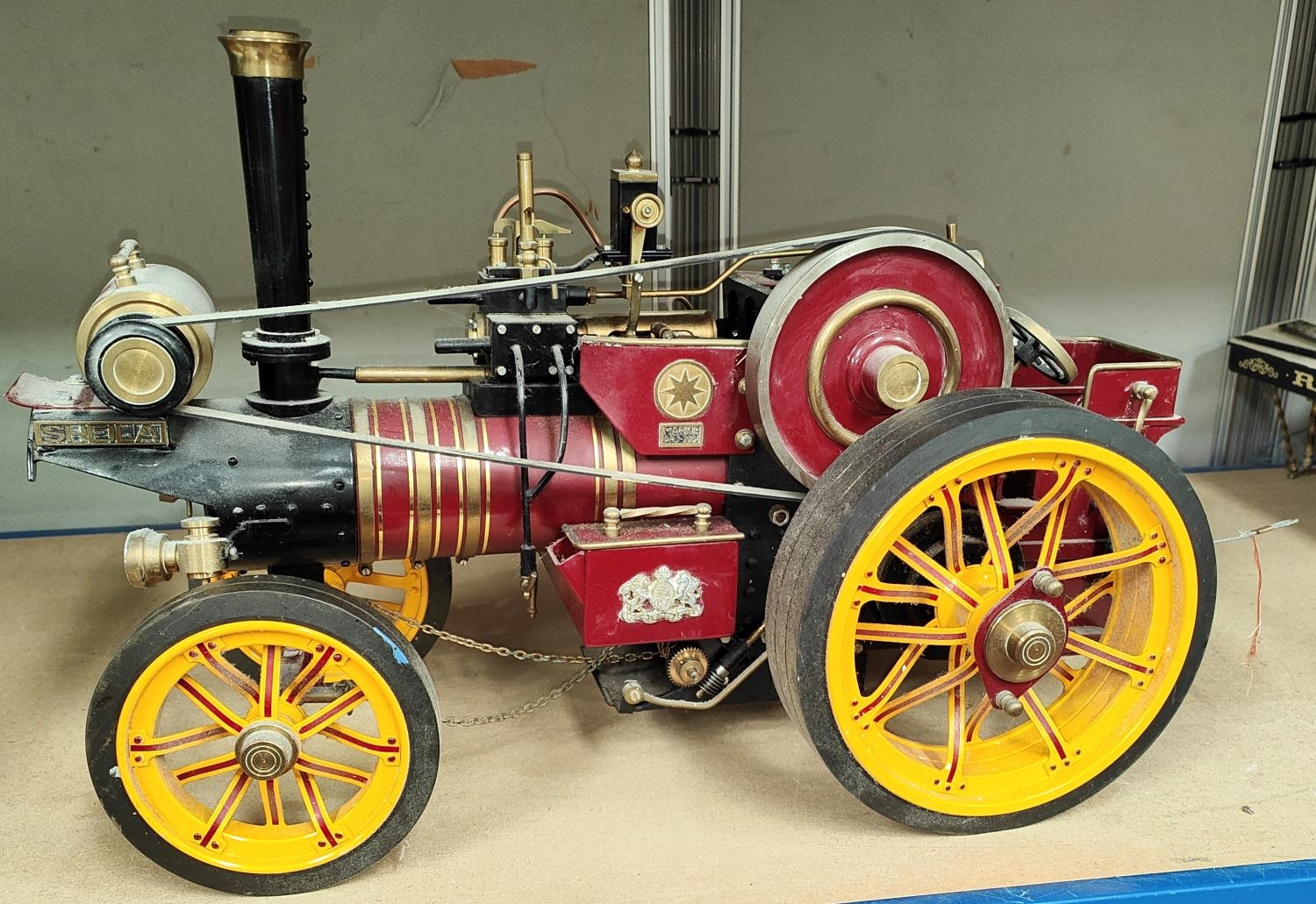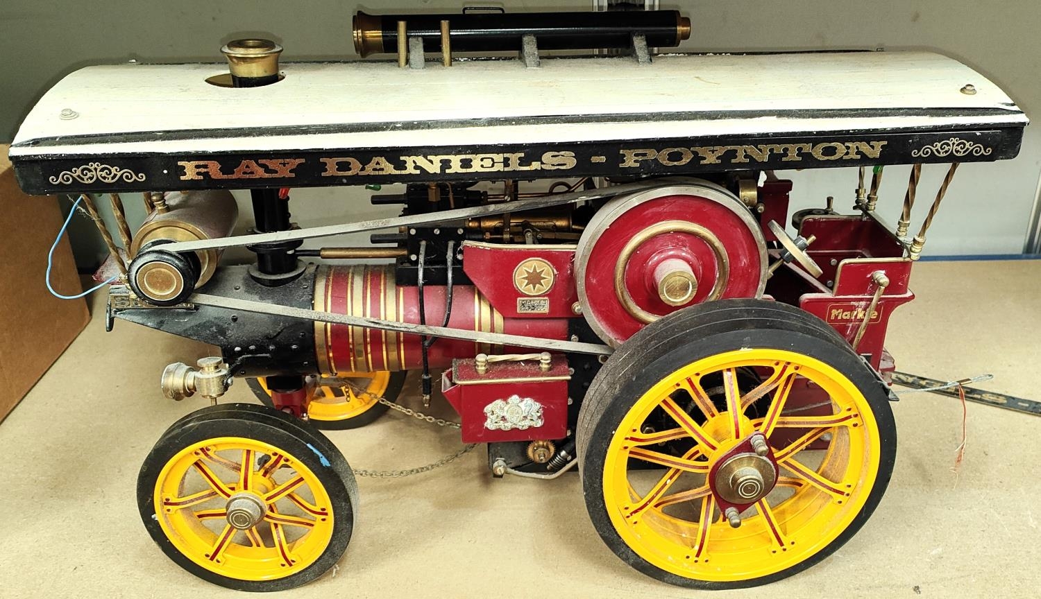 Markie Models: 1/10th scale live steam model of a Burrell Showman's engine No. Arj-2064, name plate Sheila, with spare chimney and roof, 'Ray Daniels Poynton' in maroon livery, yellow wheels, length 55cm (from deceased's estate - not known when last used, no box or papers)