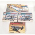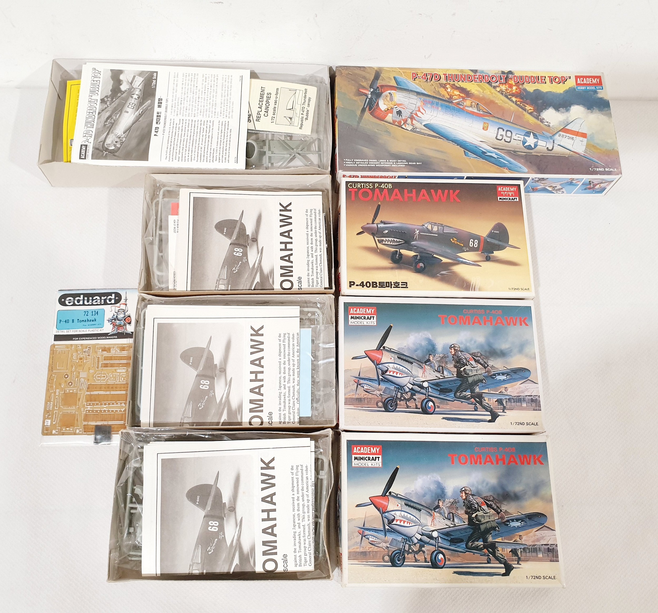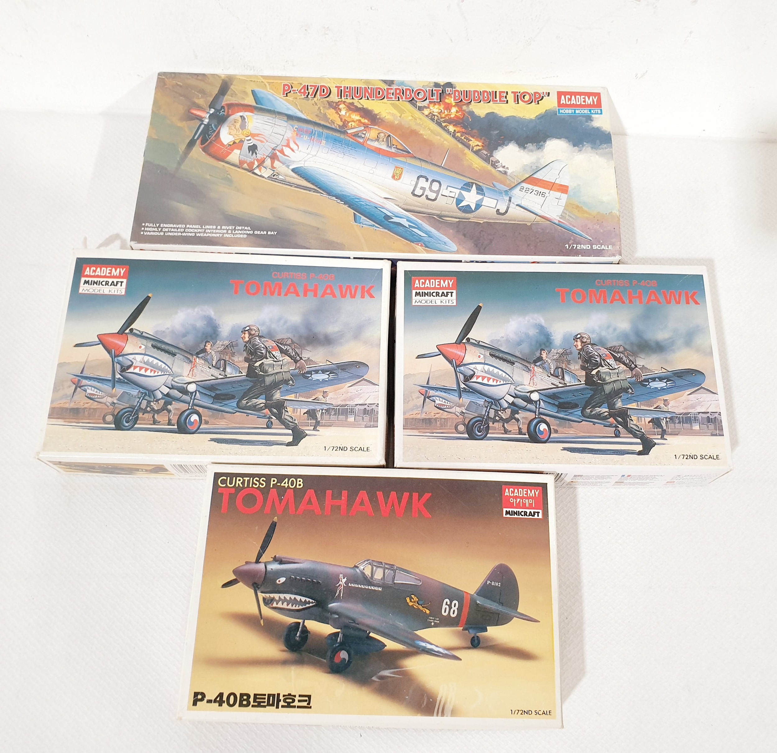 Four Academy Minicraft 1:72 scale model plane kits 'Curtiss p40b Tomahawk' (x3) & 'P-47D Thunderbolt 'Bubble Top''.