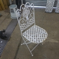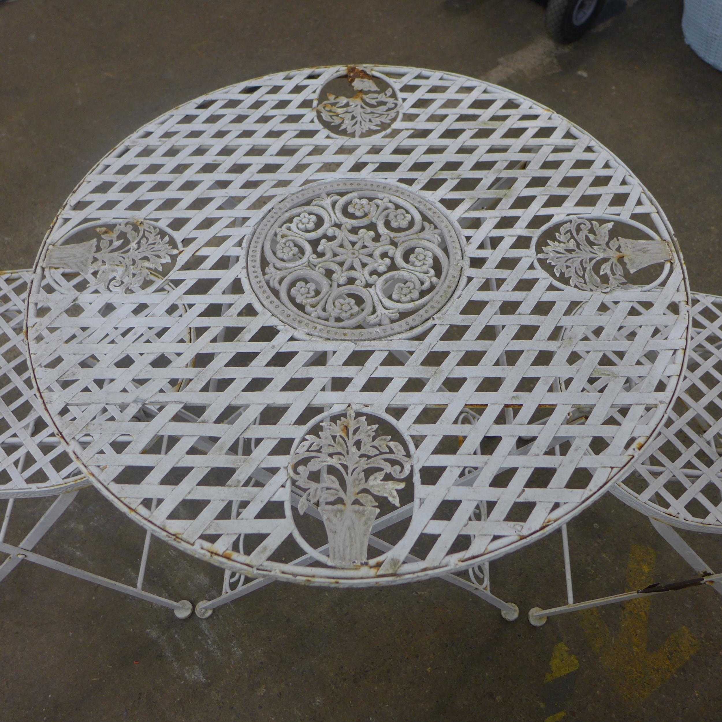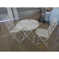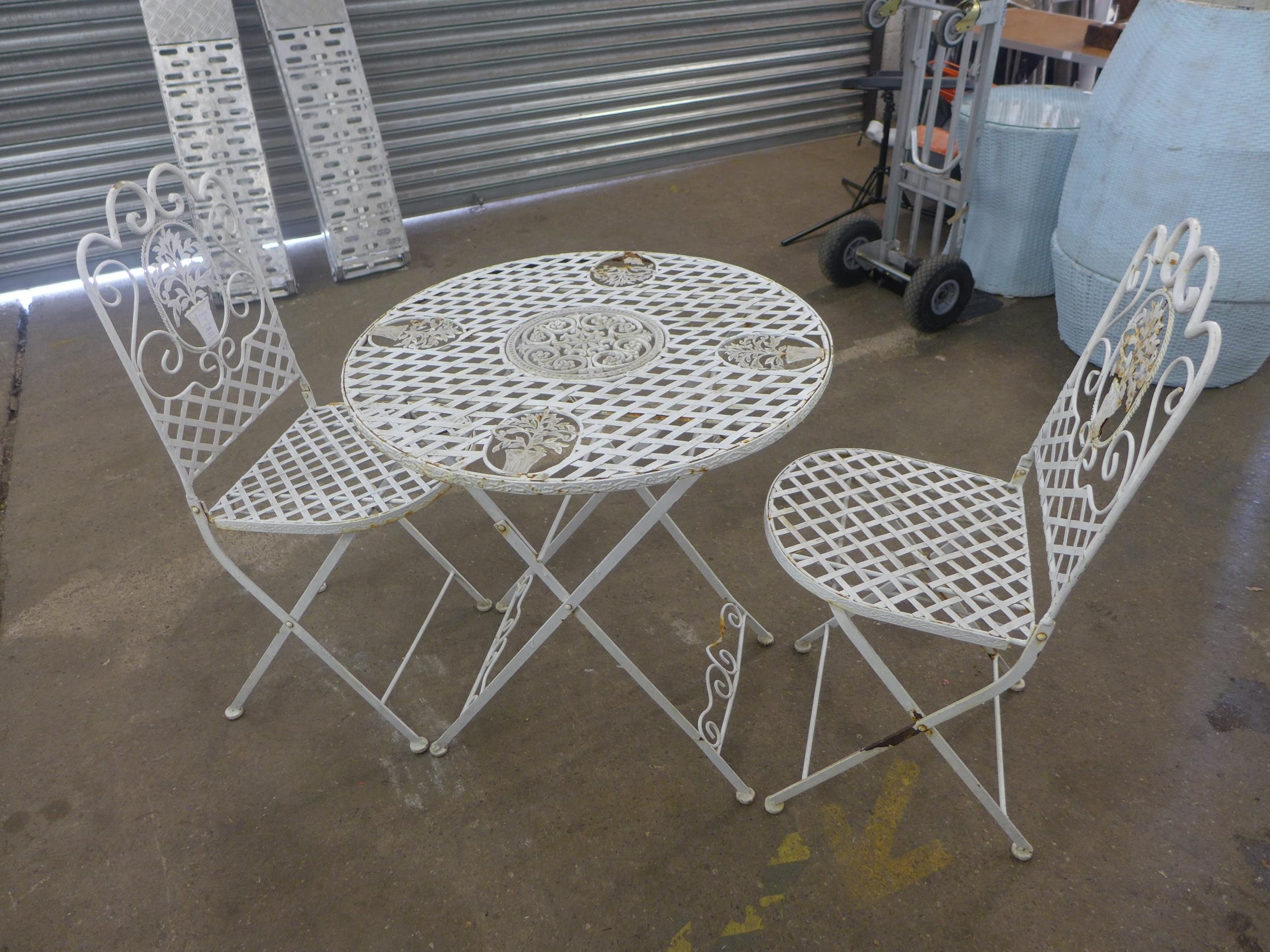 A white metal garden table and two chairs