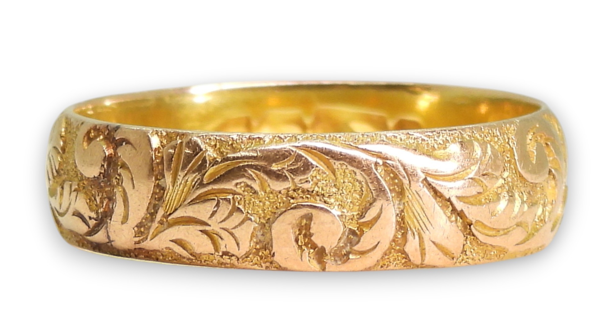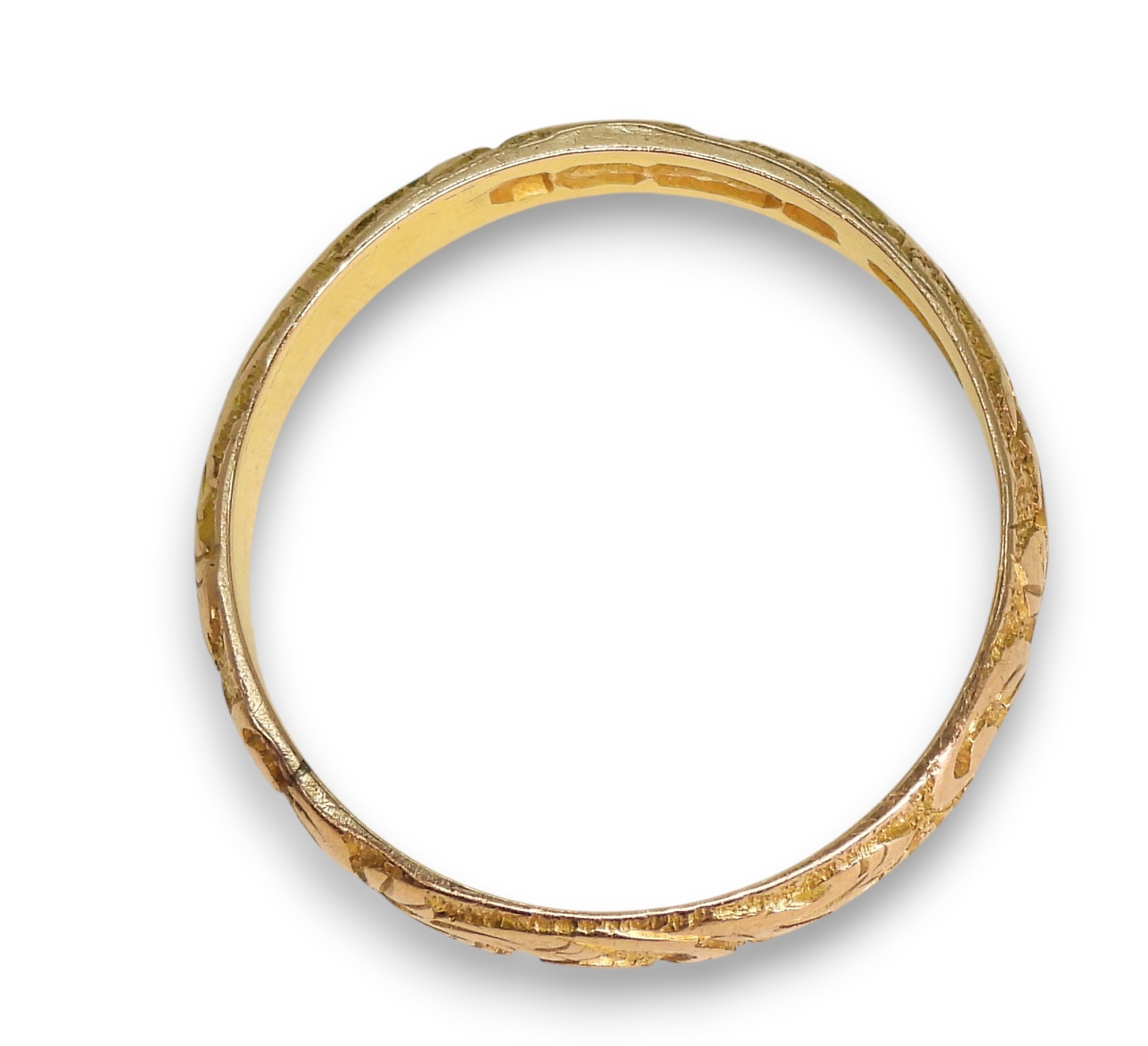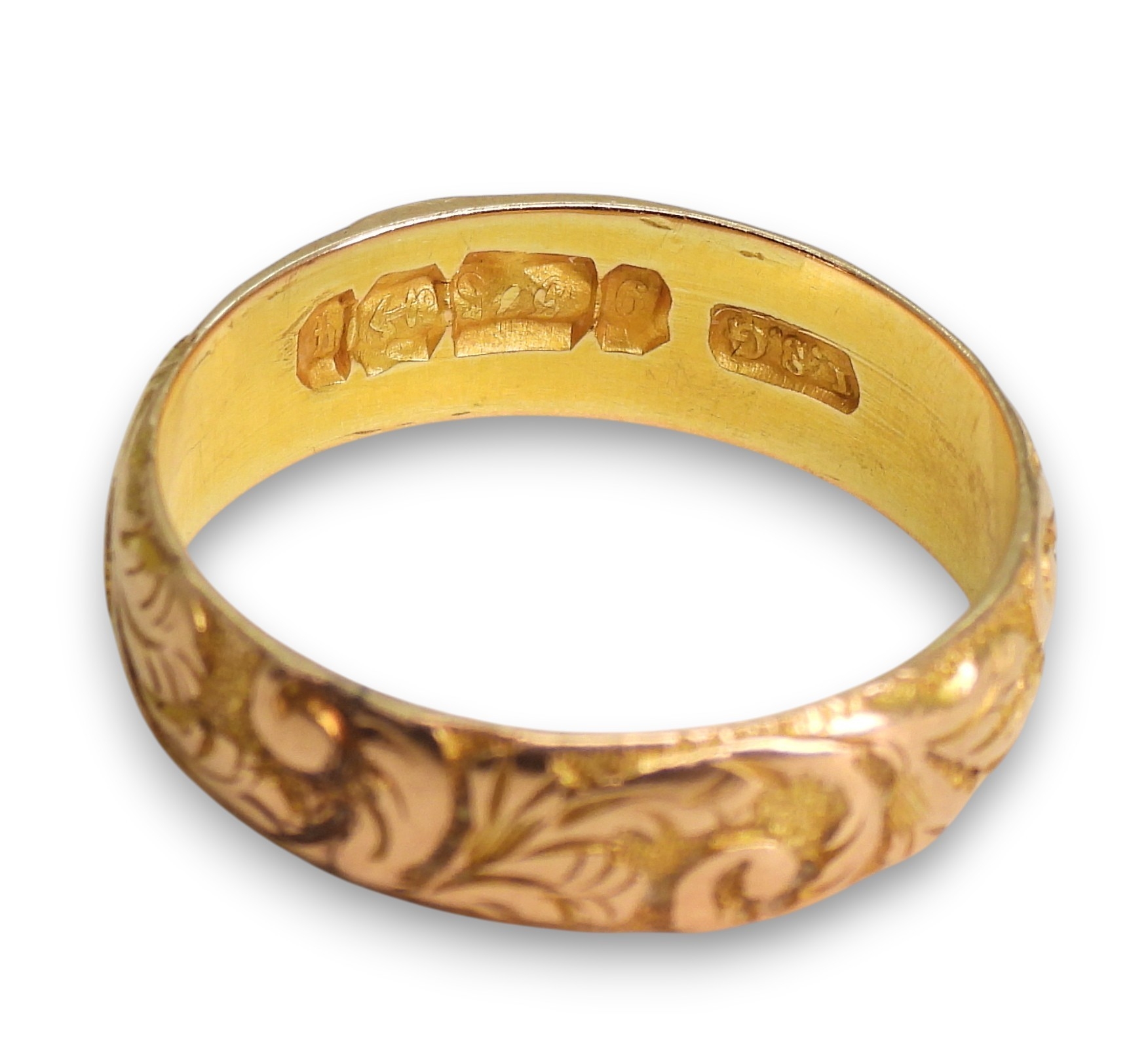 A 9ct rose gold foliate engraved wedding ring, with Birmingham hallmarks for 1890, size R, weight 3.4gms
