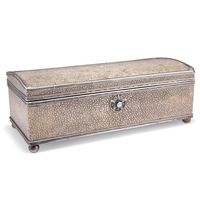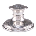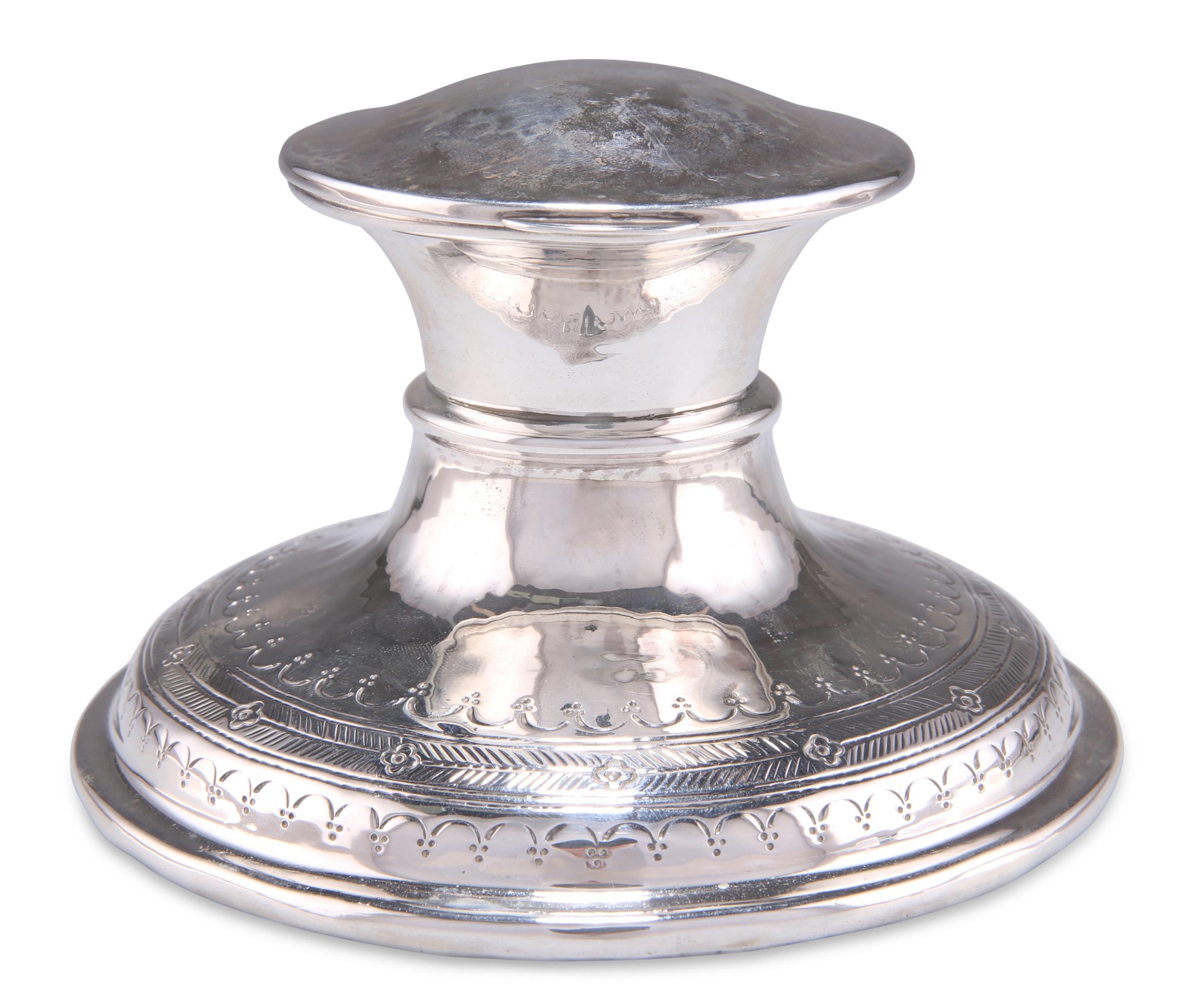 AN ARTS AND CRAFTS SILVER CAPSTAN INKWELL, byÊWilliam Hair Haseler, Birmingham 1919, of characteristic form, the spot-hammered ground engraved with flowerheads, dots and dashes, weighted. 12.5cm diameter