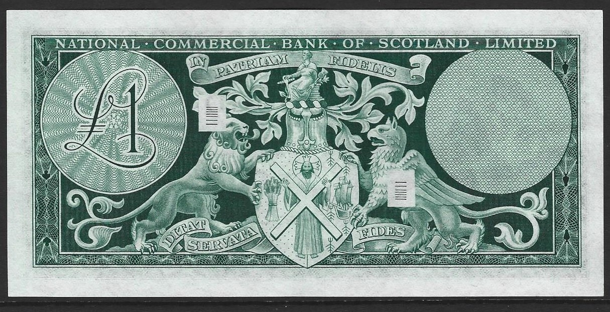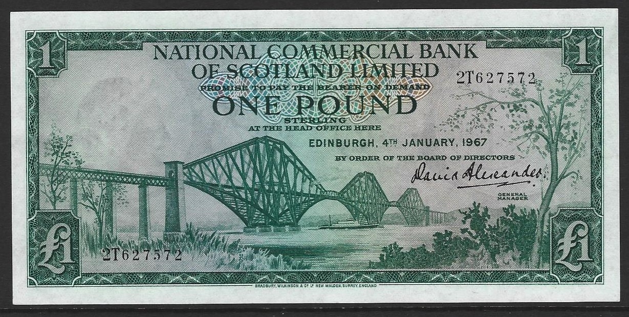 BANKNOTE. United Kingdom, Scotland, National Commercial Bank of Scotland, 1 Pound, 4.1.1967, sign. David Alexander, NC7 (SC602b, P-271a), last prefix, serial number 2T 62757, EF+