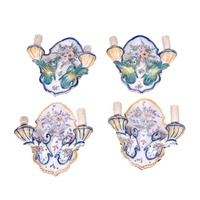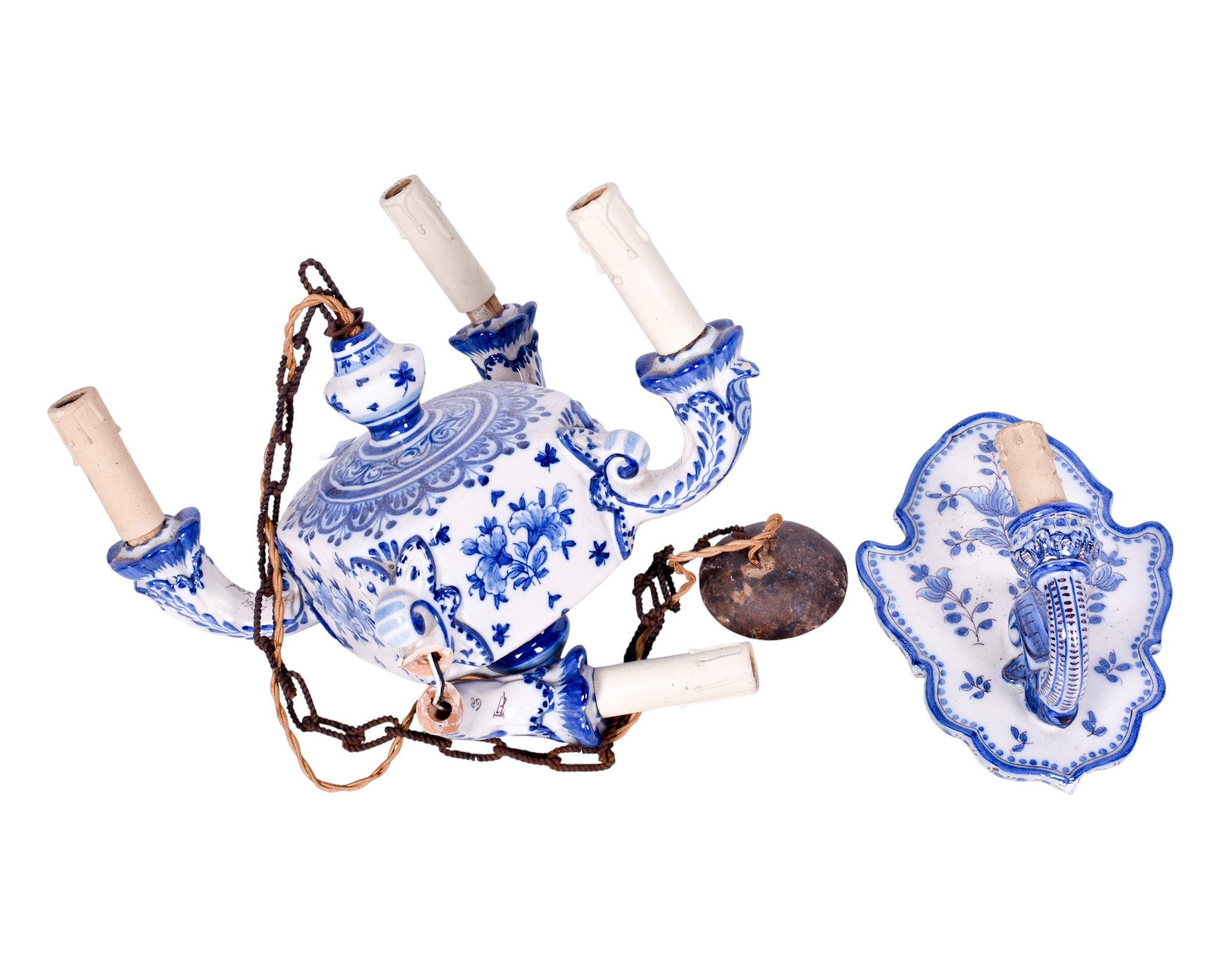A Portugese ceramic wall sconce and a four branch chandelier. Both glazed in white with blue decoration and faux candles, the sconce marked 'CTA ANNA Lisbon 1967', H26cm. The chandelier marked 'Anna 1967' (AF), H23cm (excluding fitting).