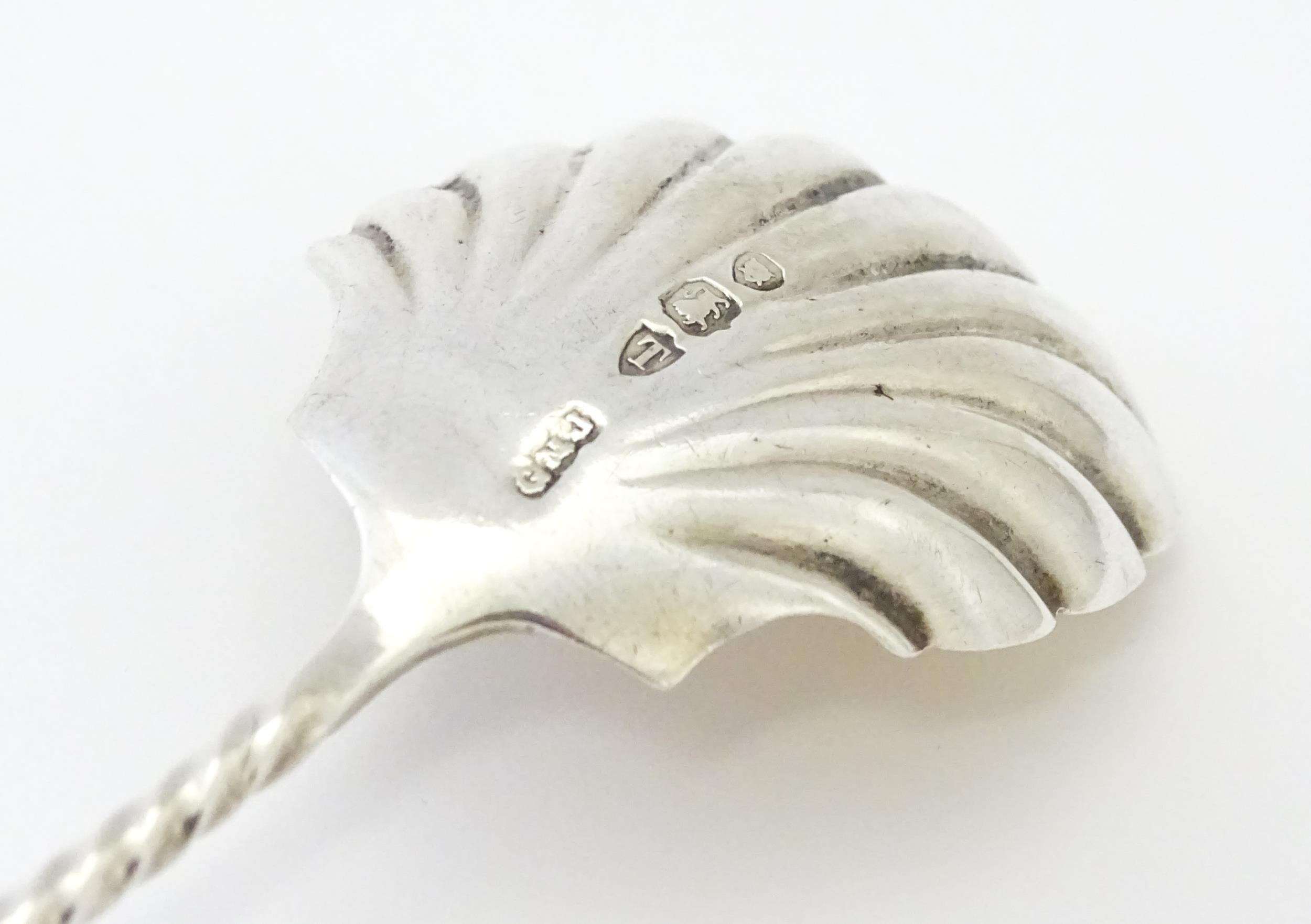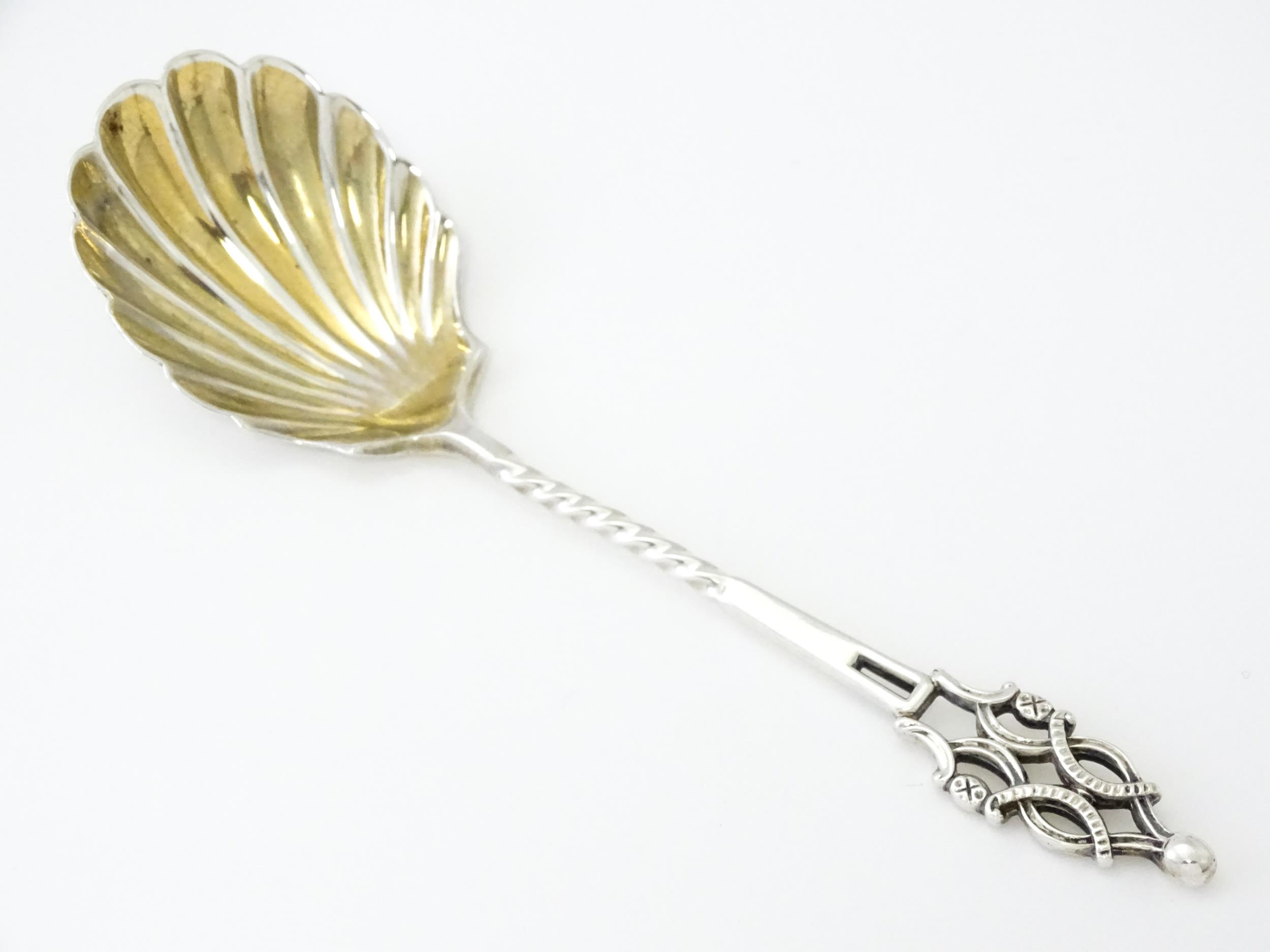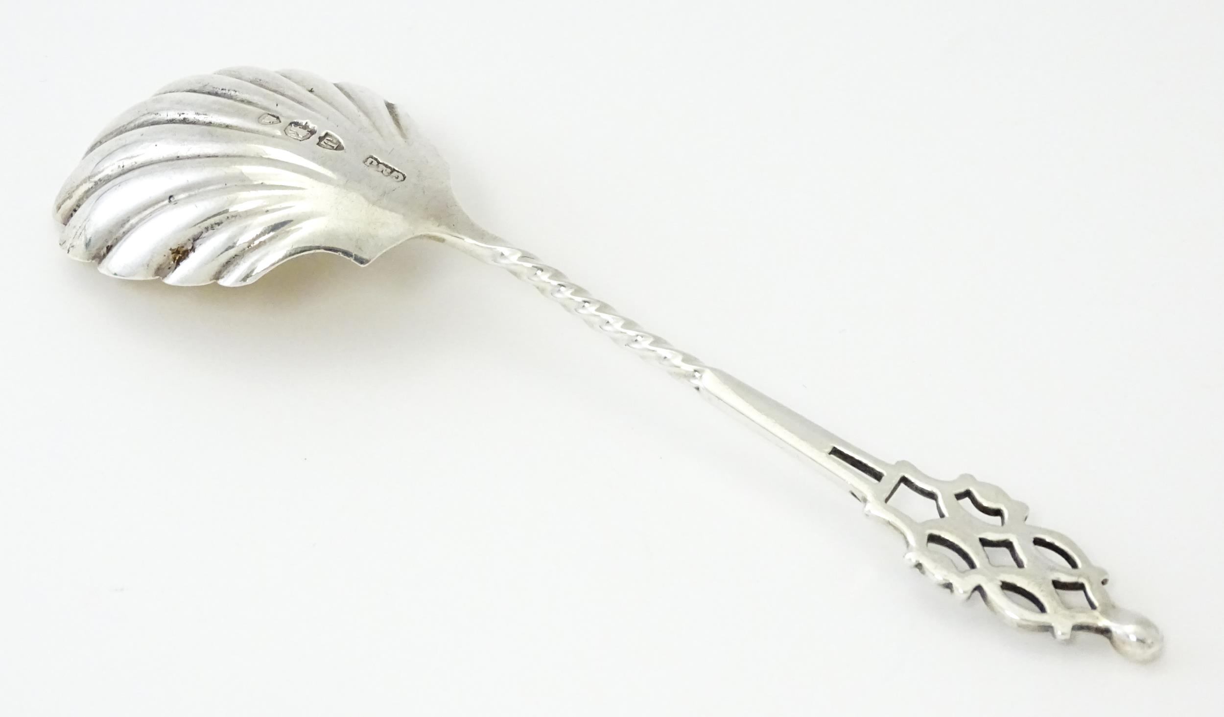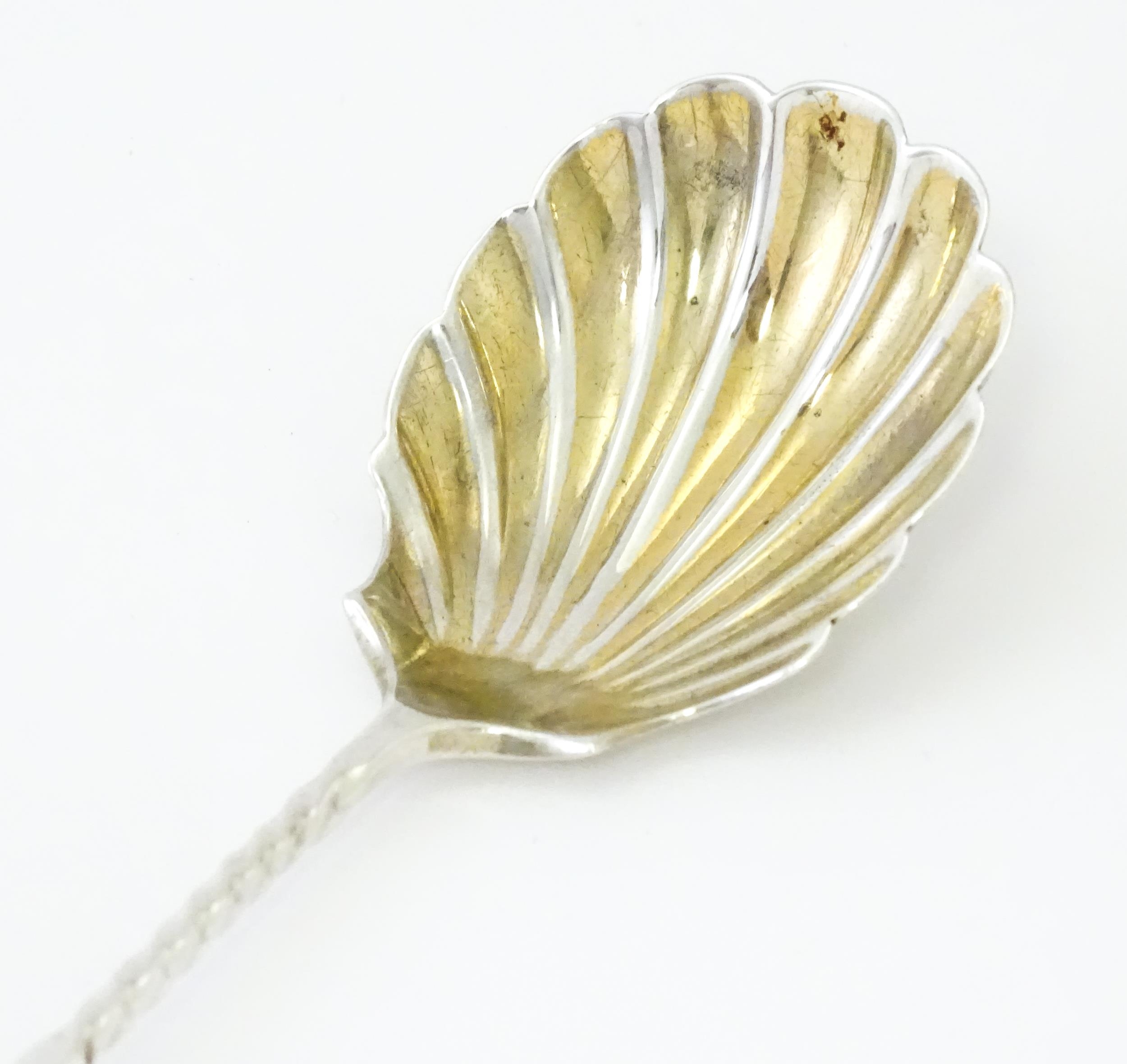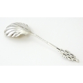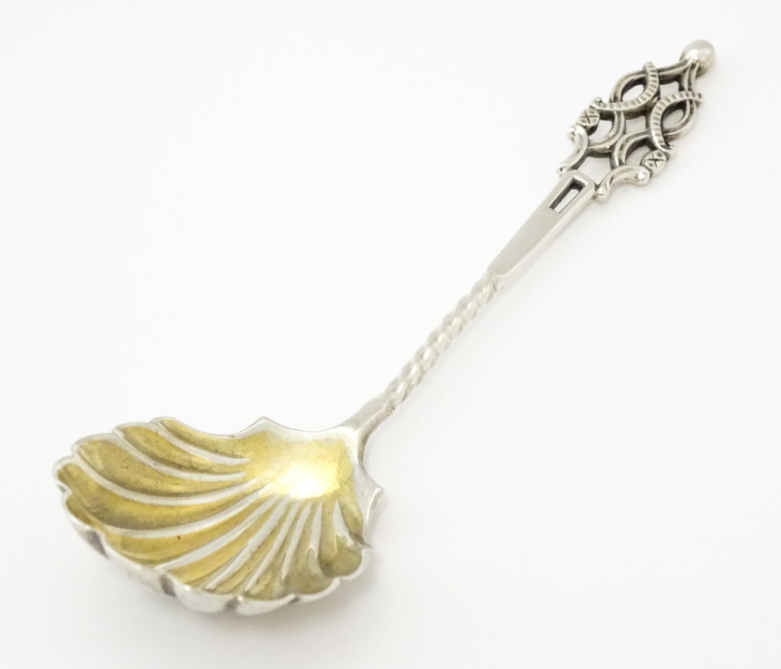 A Victorian silver sugar spoon with shell formed bowl and openwork detail, hallmarked London 1894, maker Josiah Williams & Co (George Maudsley Jackson). Approx. 5" long (Approx. 18.5g)