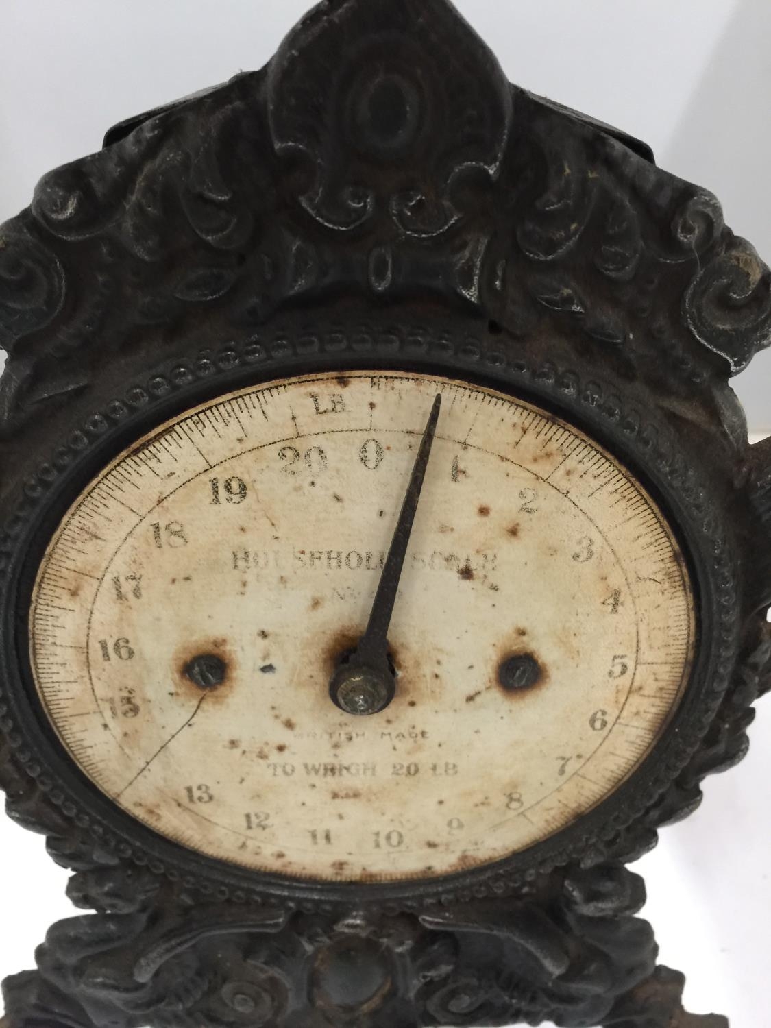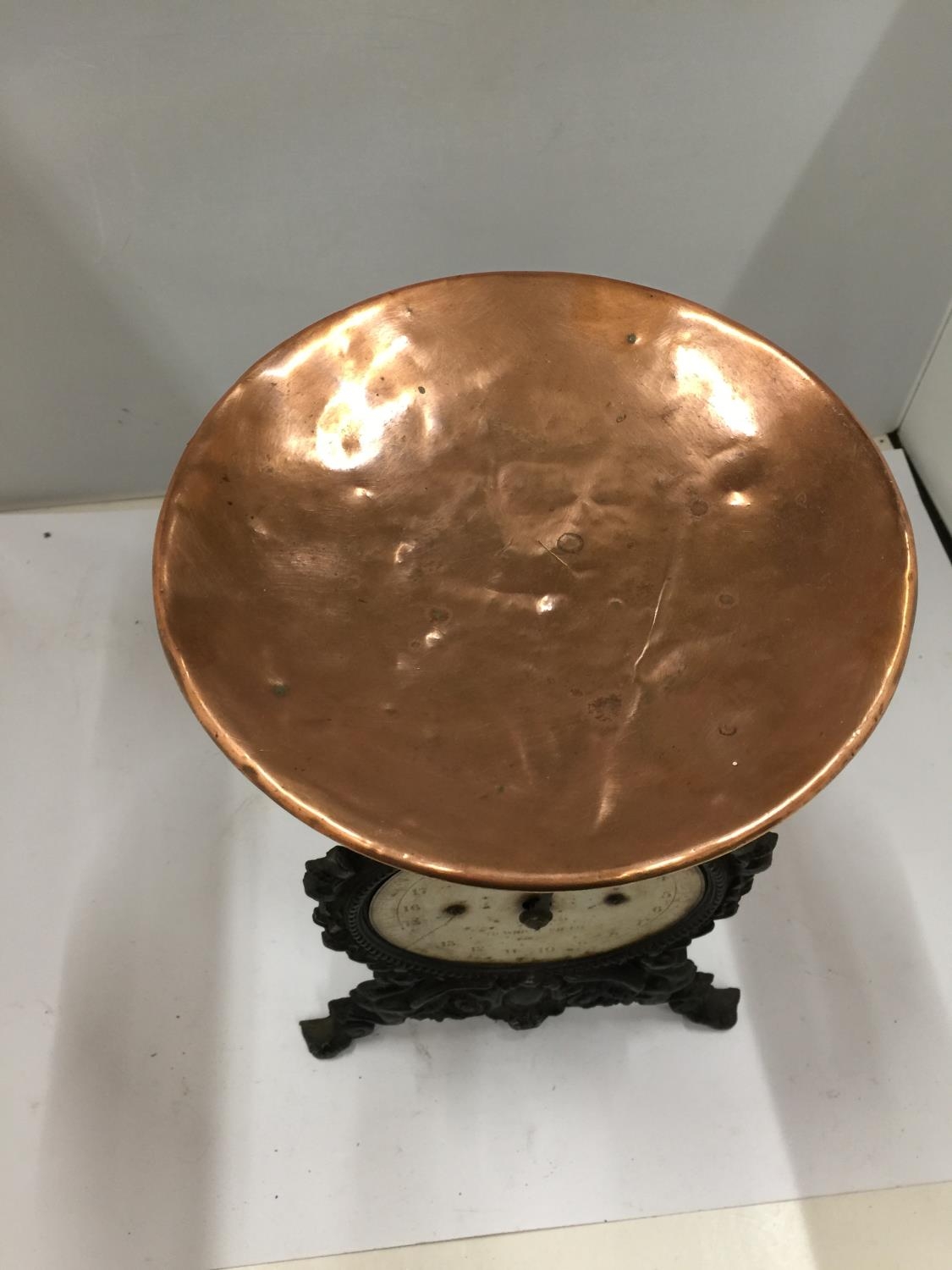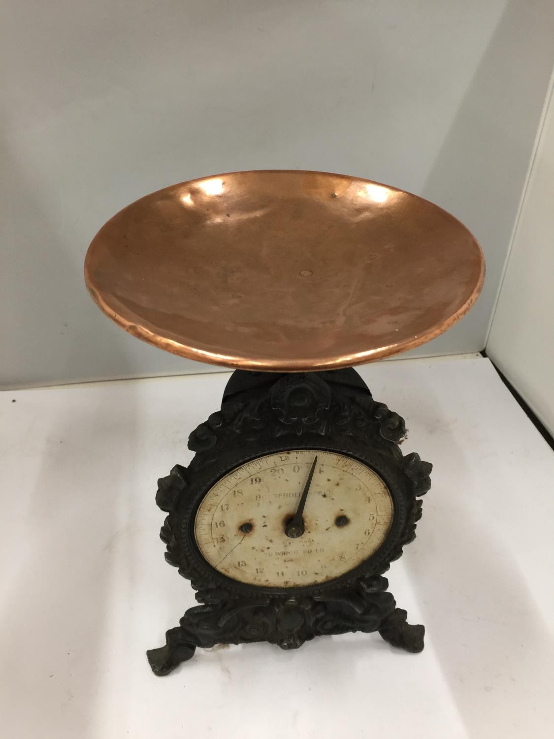 A HOUSEHOLD SPRING SCALE No 49 TO WEIGH 20lbs WITH COPPER DISH