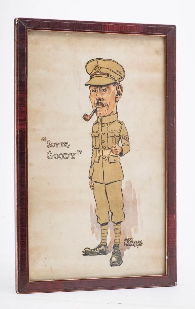 After Harry Fieldhouse (19th/20th Century British) 'Some Goody': caricature portrait print of a WWI Machine Gun Regiment Sargent, framed and glazed, 28 x 16.5cm.