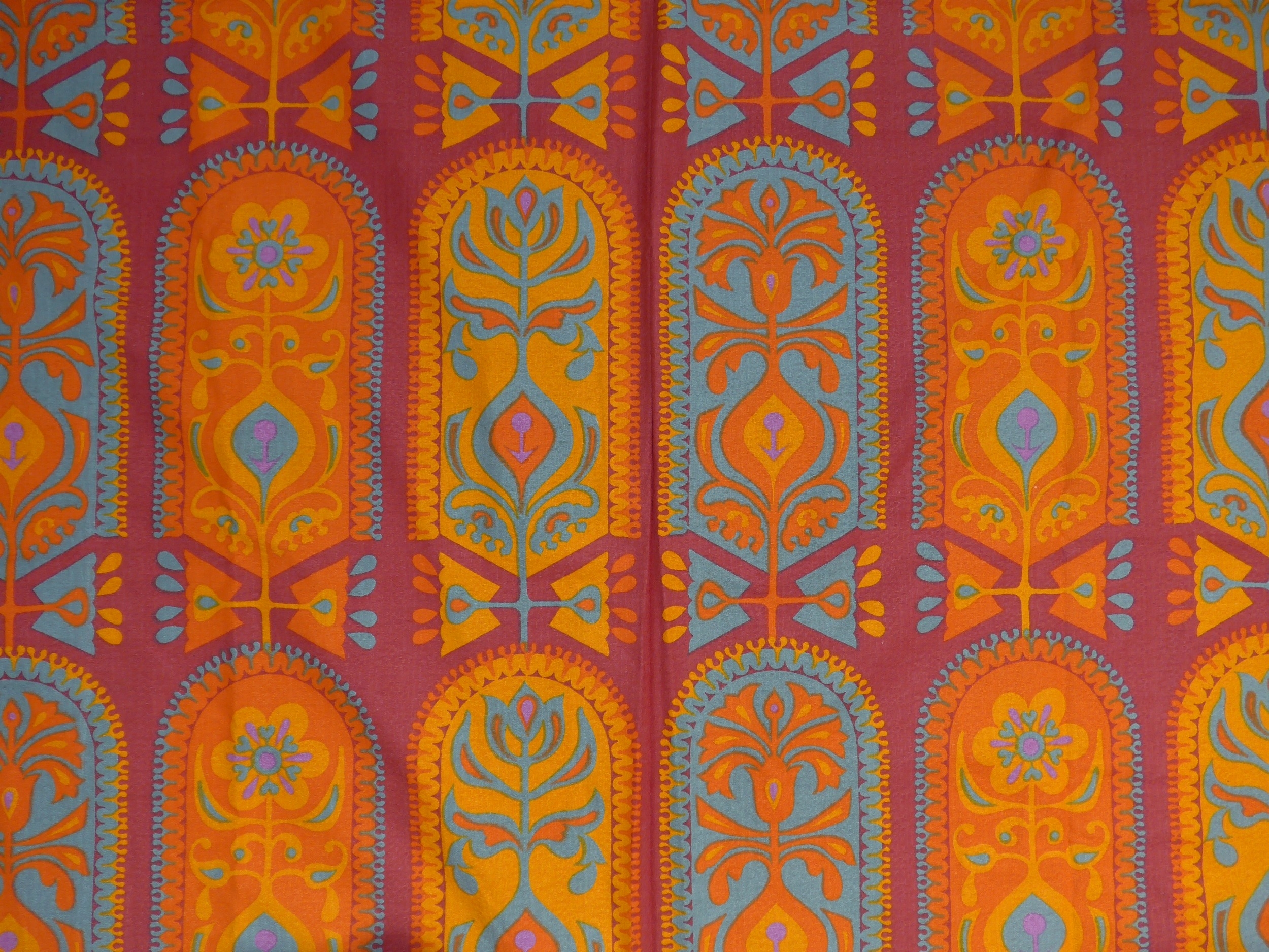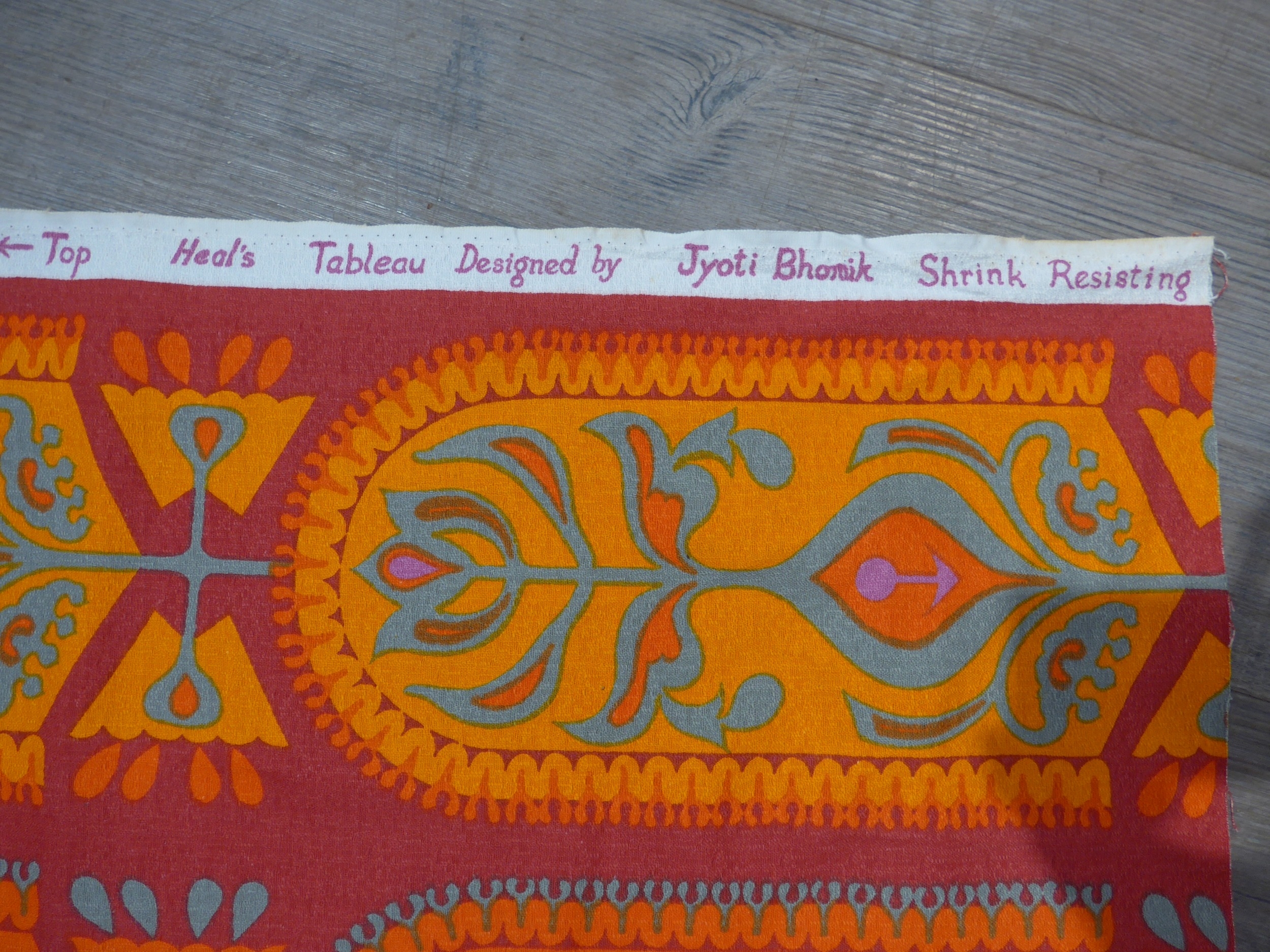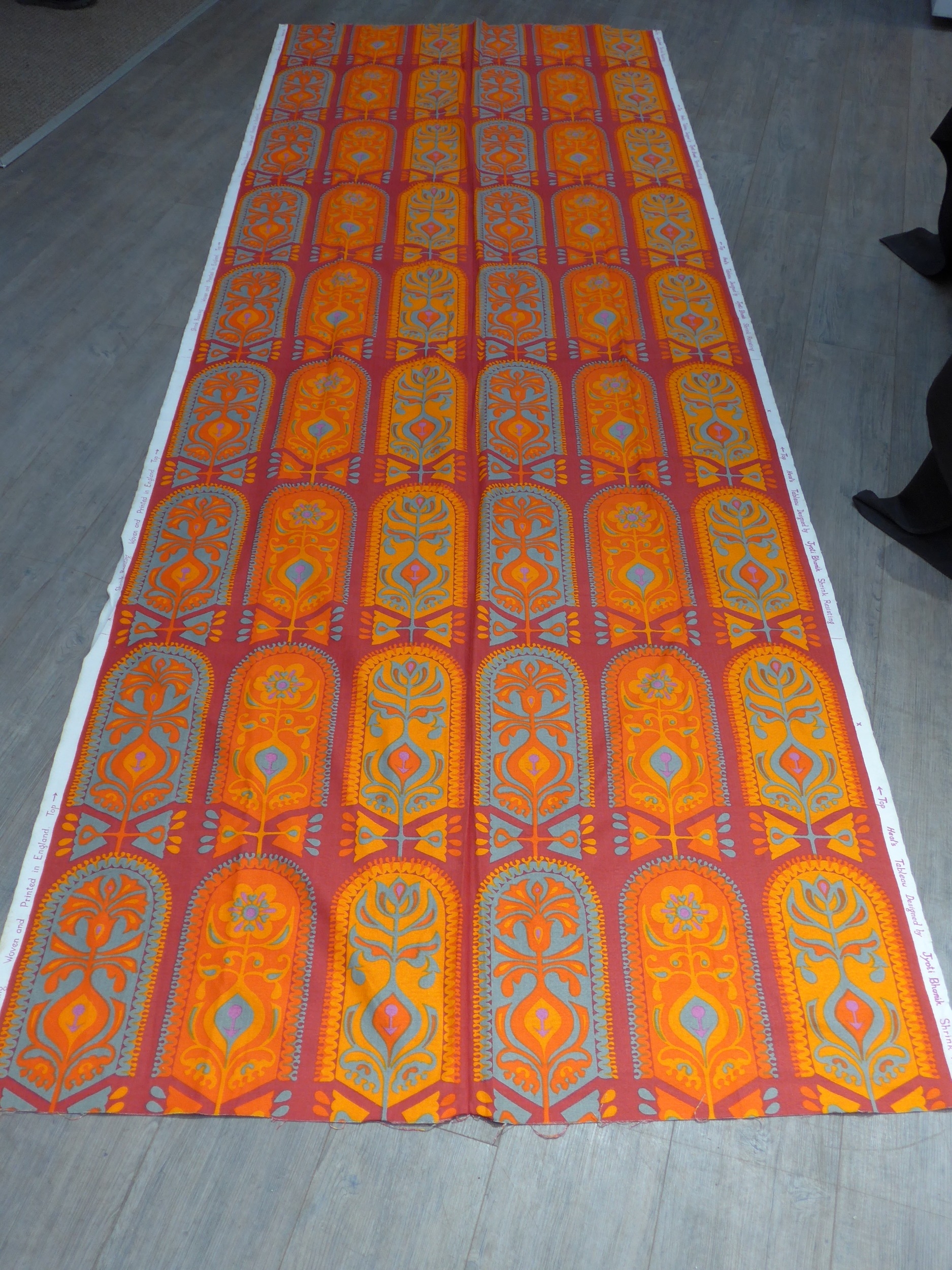 A length of Heals fabric, Tableau pattern by Jyoti Bhomik in ornage colourway. Approx 3 3/4 yards x 48" wide