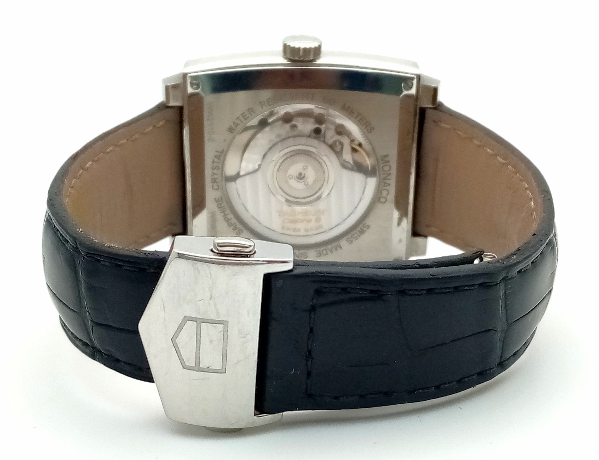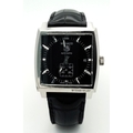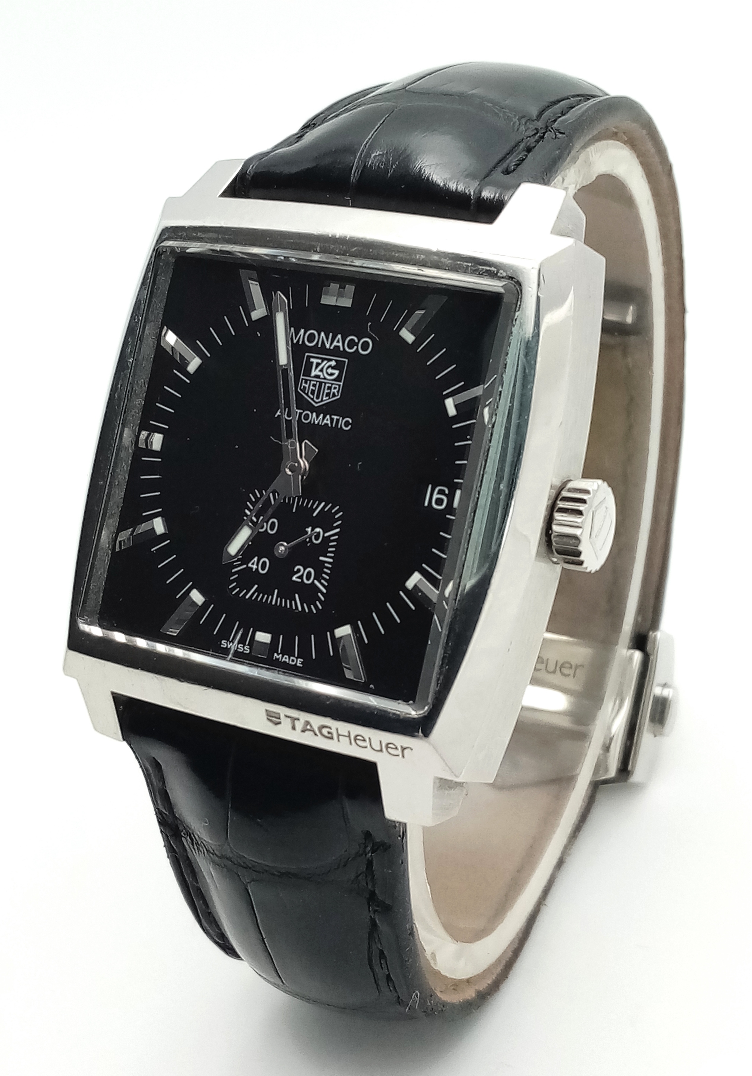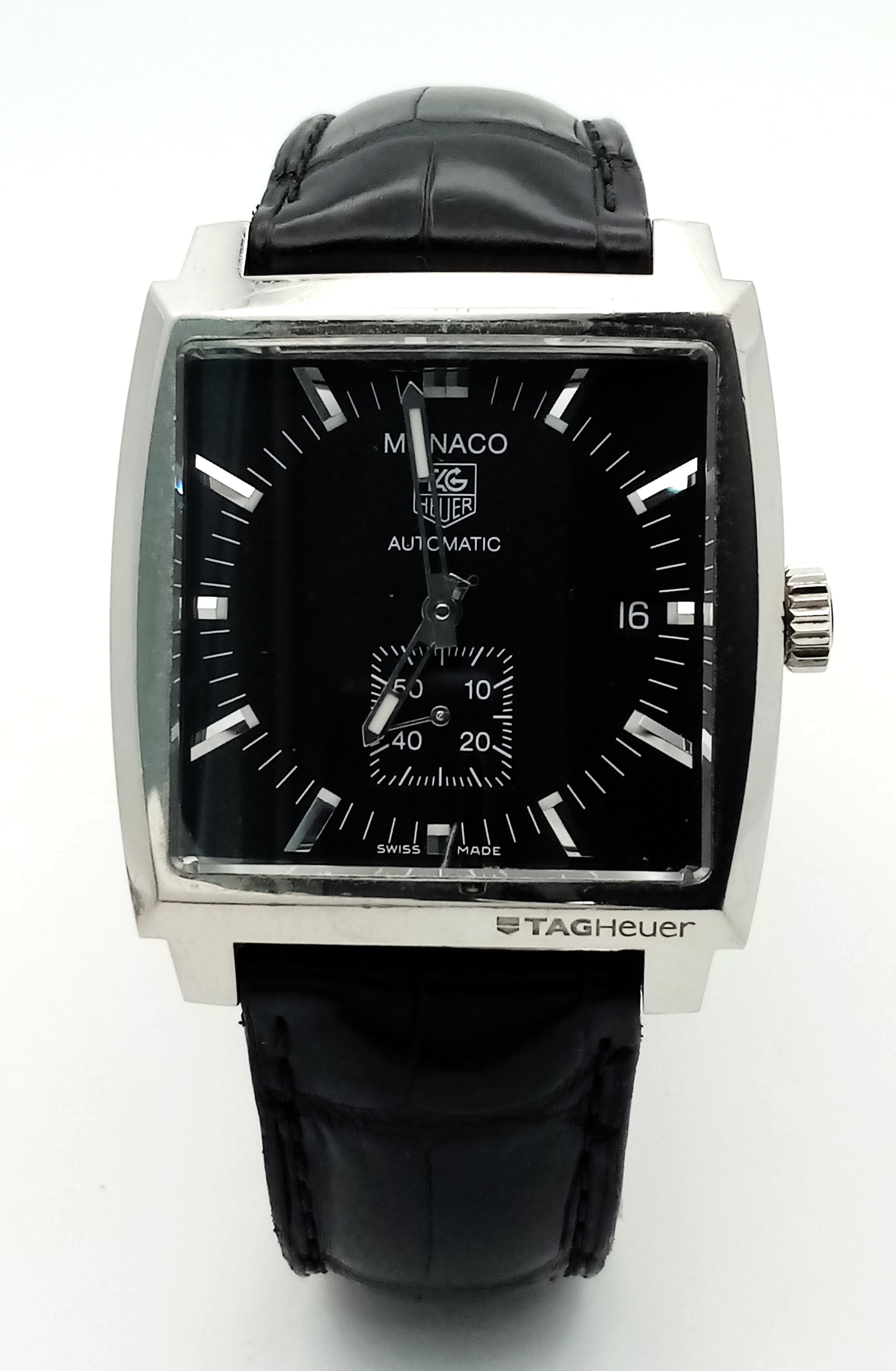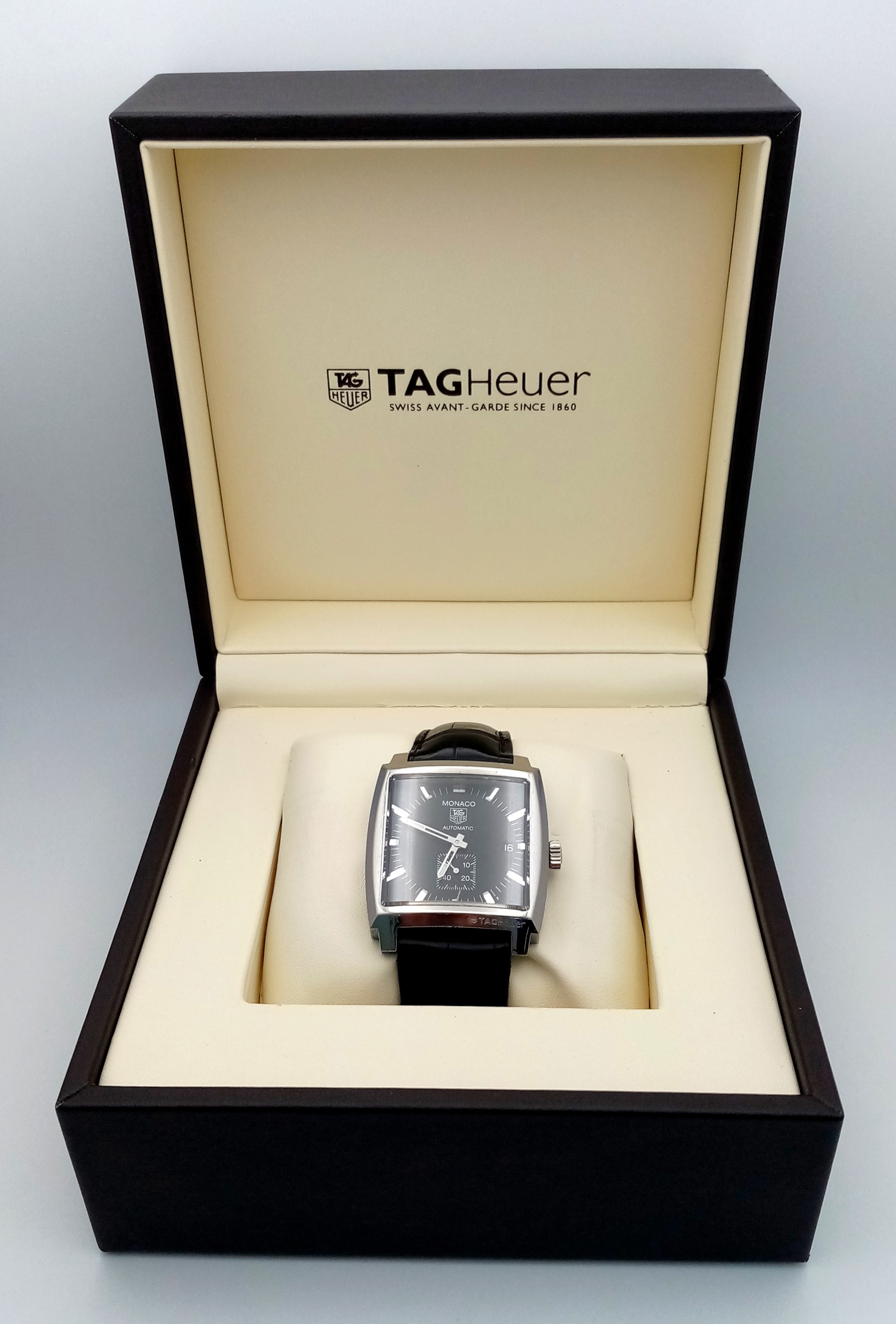 A Tag Heuer Monaco Automatic Gents Watch. Model WW2110-0. Black leather strap. Stainless steel case - 38mm. Black dial with second sub dial. Comes with box and papers. In good condition and working order. Ref: STK024221