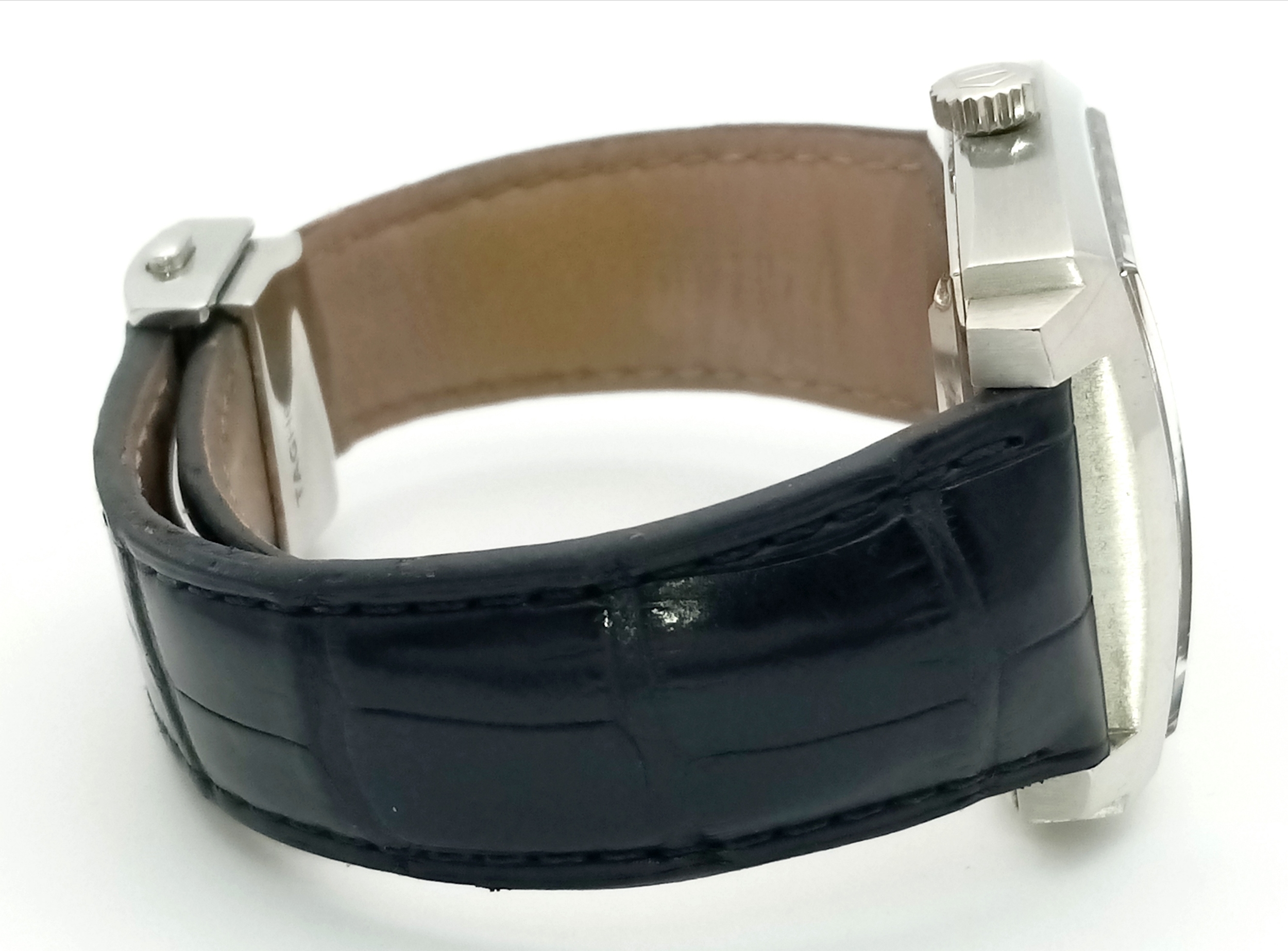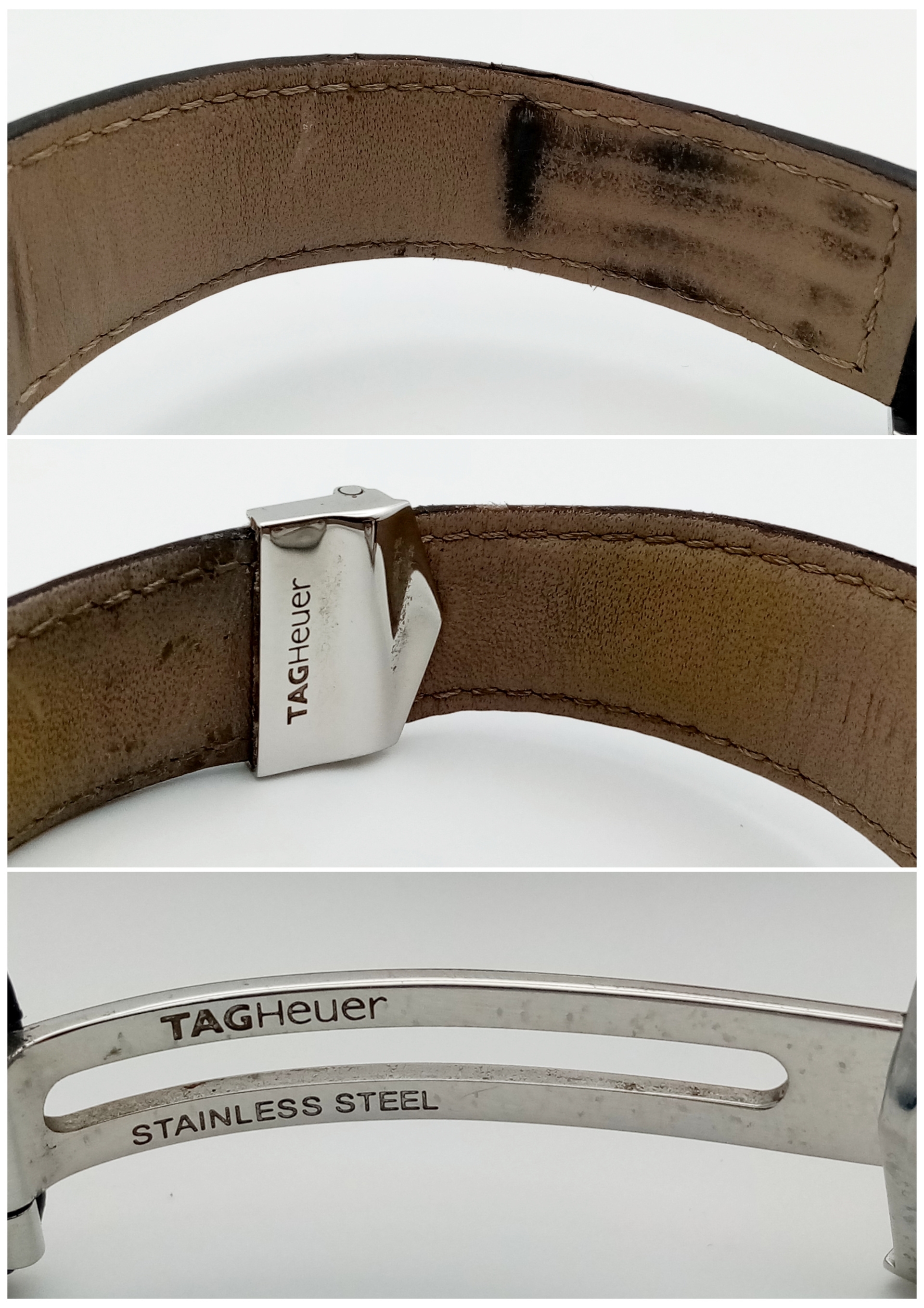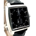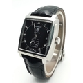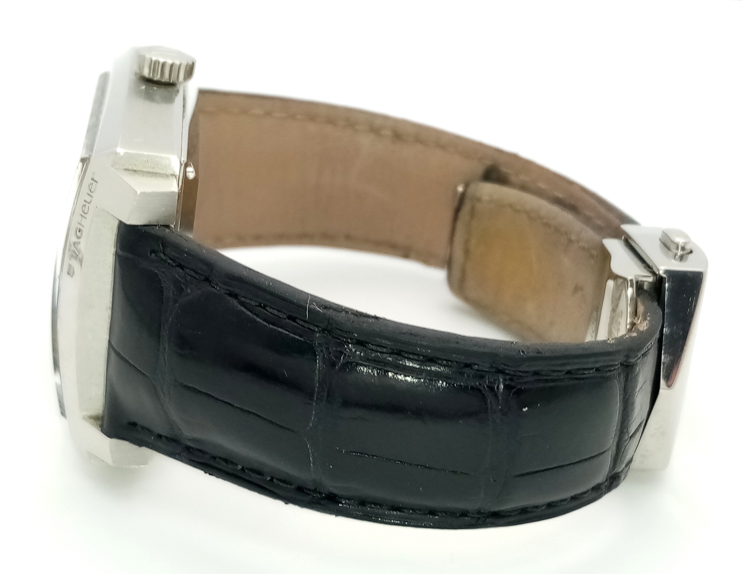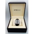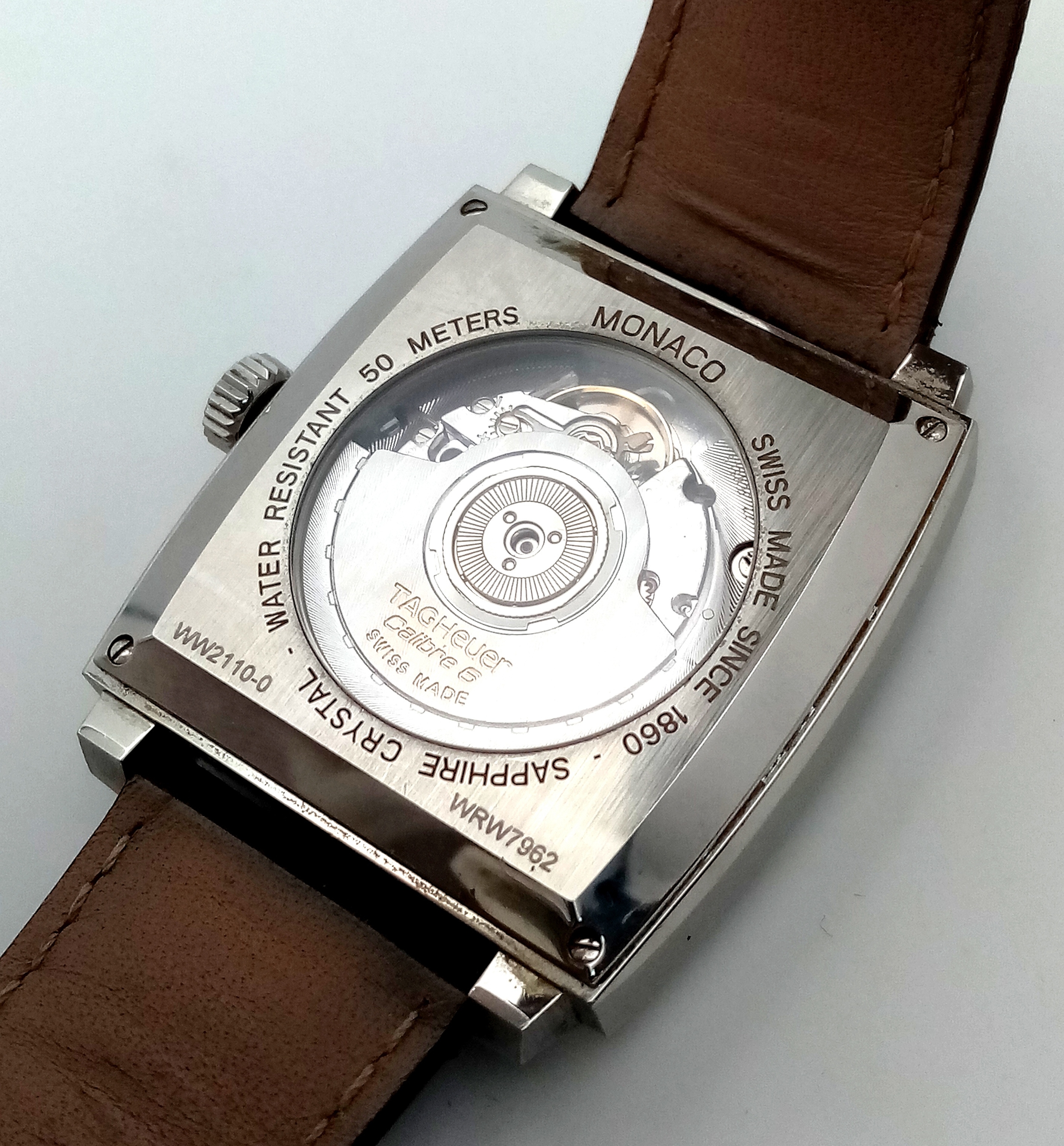 A Tag Heuer Monaco Automatic Gents Watch. Model WW2110-0. Black leather strap. Stainless steel case - 38mm. Black dial with second sub dial. Comes with box and papers. In good condition and working order. Ref: STK024221