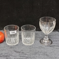 Three mid 19th century elegant antique crystal glasses including a pair of large tumblers with starburst cut to base, along with a goblet with a bubble stem. In super condition.
