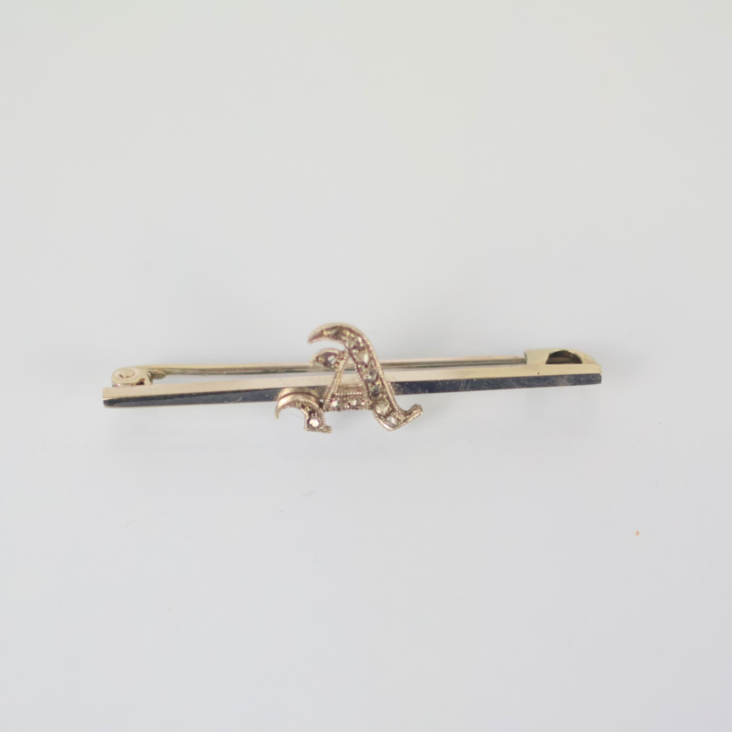 An early 20th century diamond brooch, the 'A' initial set with rose cut diamonds, upon a plain polished white metal bar with hinge pin to reverse, marked '9ct' 4cm long, 1.2gms