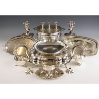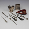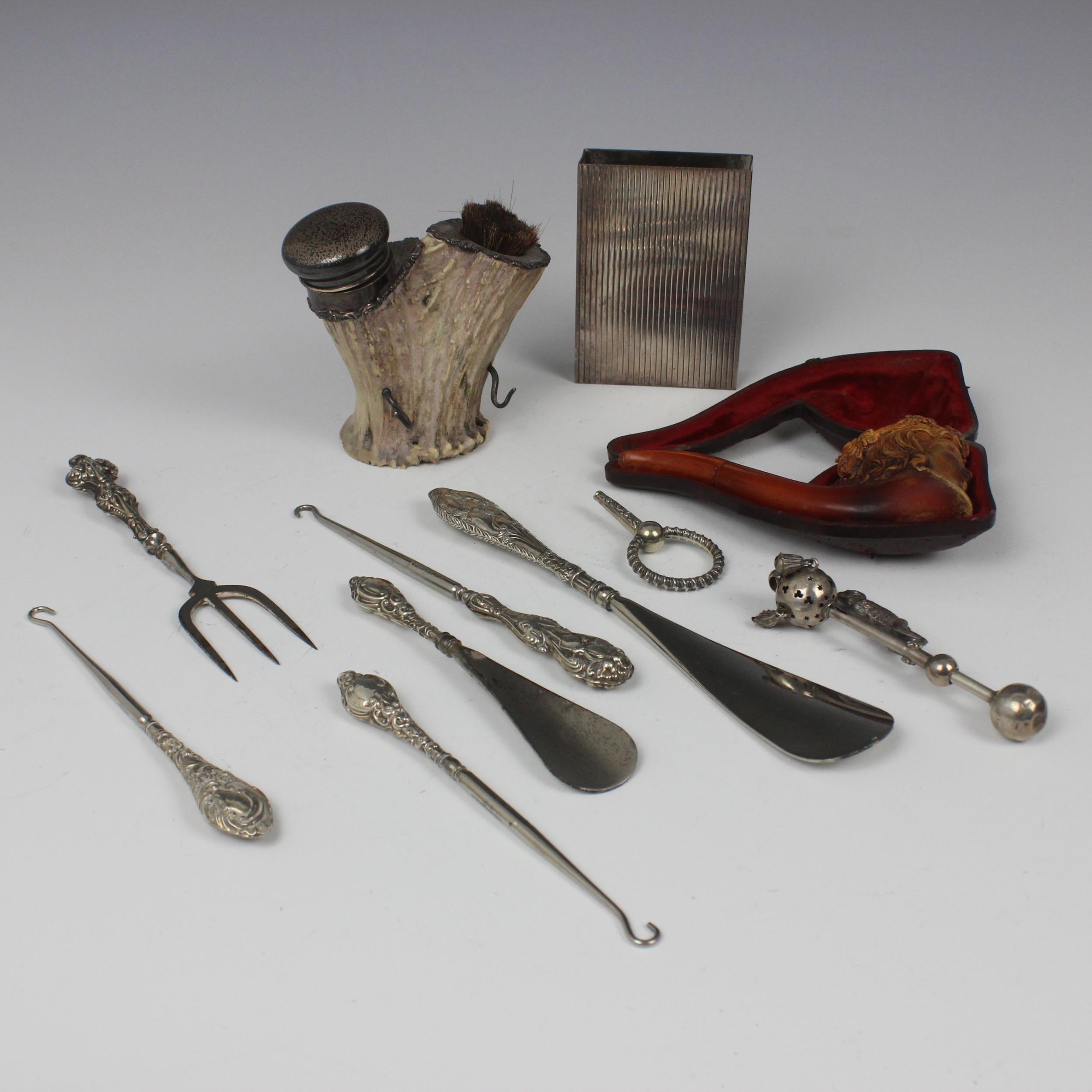 A late 19th century desk tidy, the horn stem with white metal terminals with presentation engraving relating to the 'Seawanhaka Corinthian Yacht Club' 11cm high, with a silver plated match box case, a meerschaum style pipe, and further silver coloured mounted pieces (qty)