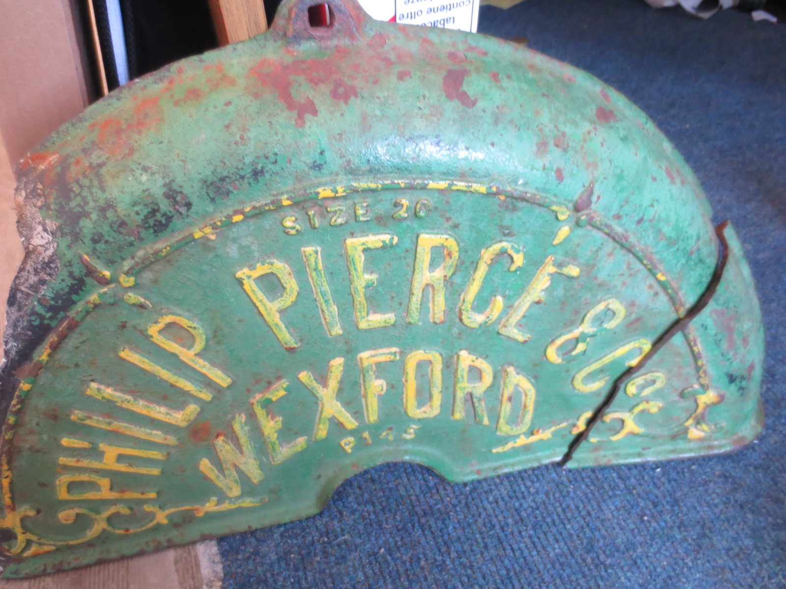 A green cast iron curved plate branded for Philip Wexford & Co Wexford