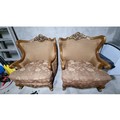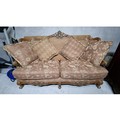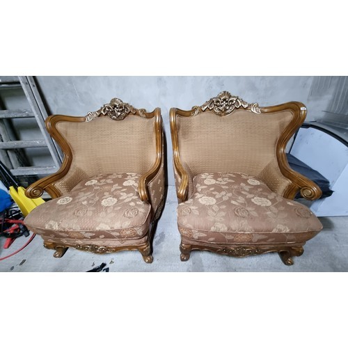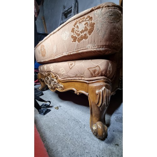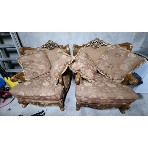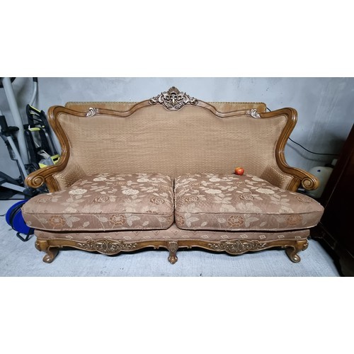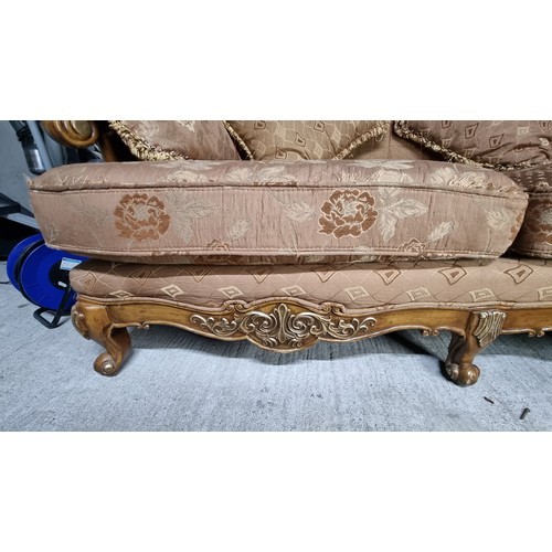 Star Lot : Lovely three piece Silk French style suite. In a walnut frame with a 3 seater and 2 matching large armchairs with lovely damask fabric and throw pillows.