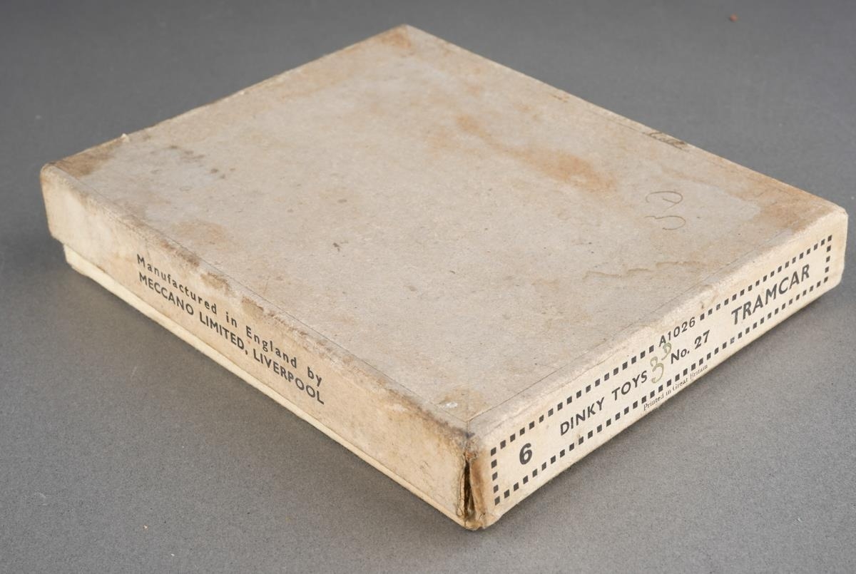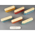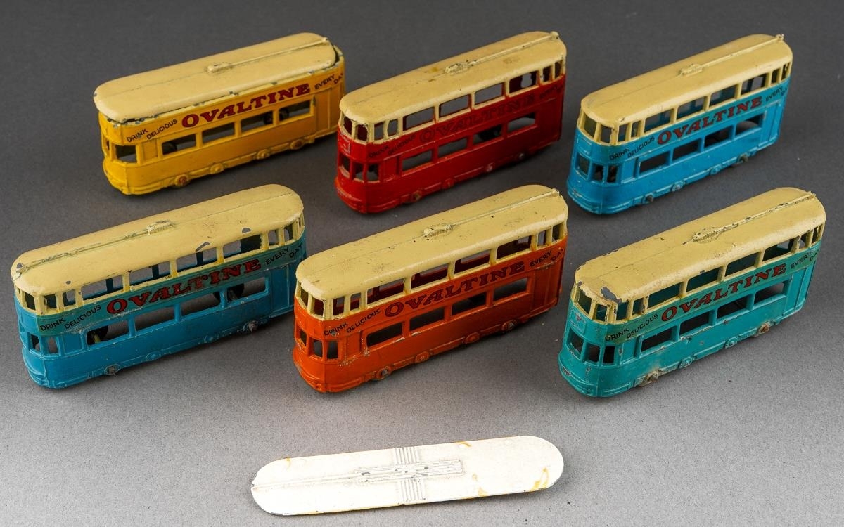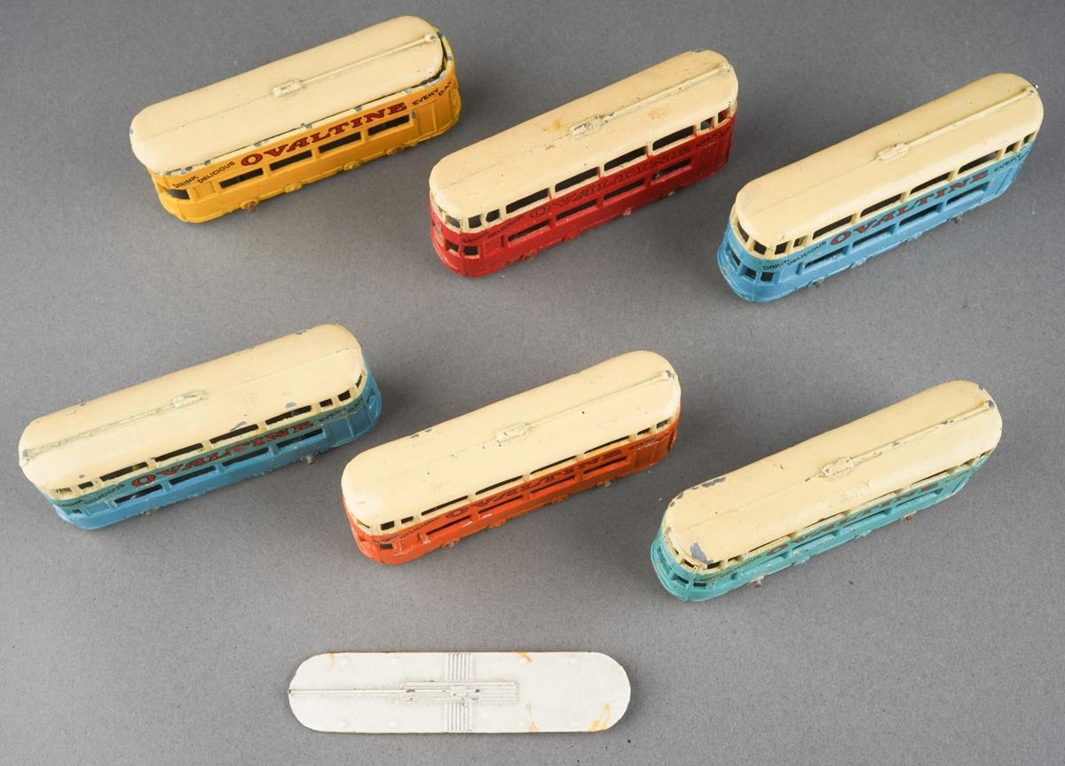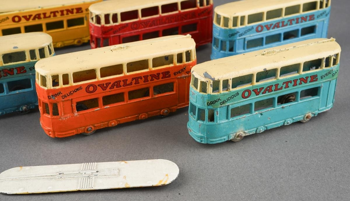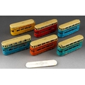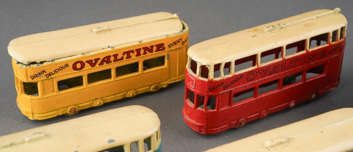 Boxed Dinky Toys [pre-war] No. 27 Tramcar manufactured by Meccano Ltd Liverpool to include six examples yellow and cream, orange and cream, red and cream, turquoise and cream and 2 x blue and cream, all with Ovaltine livery [6 Tramcars in original box]