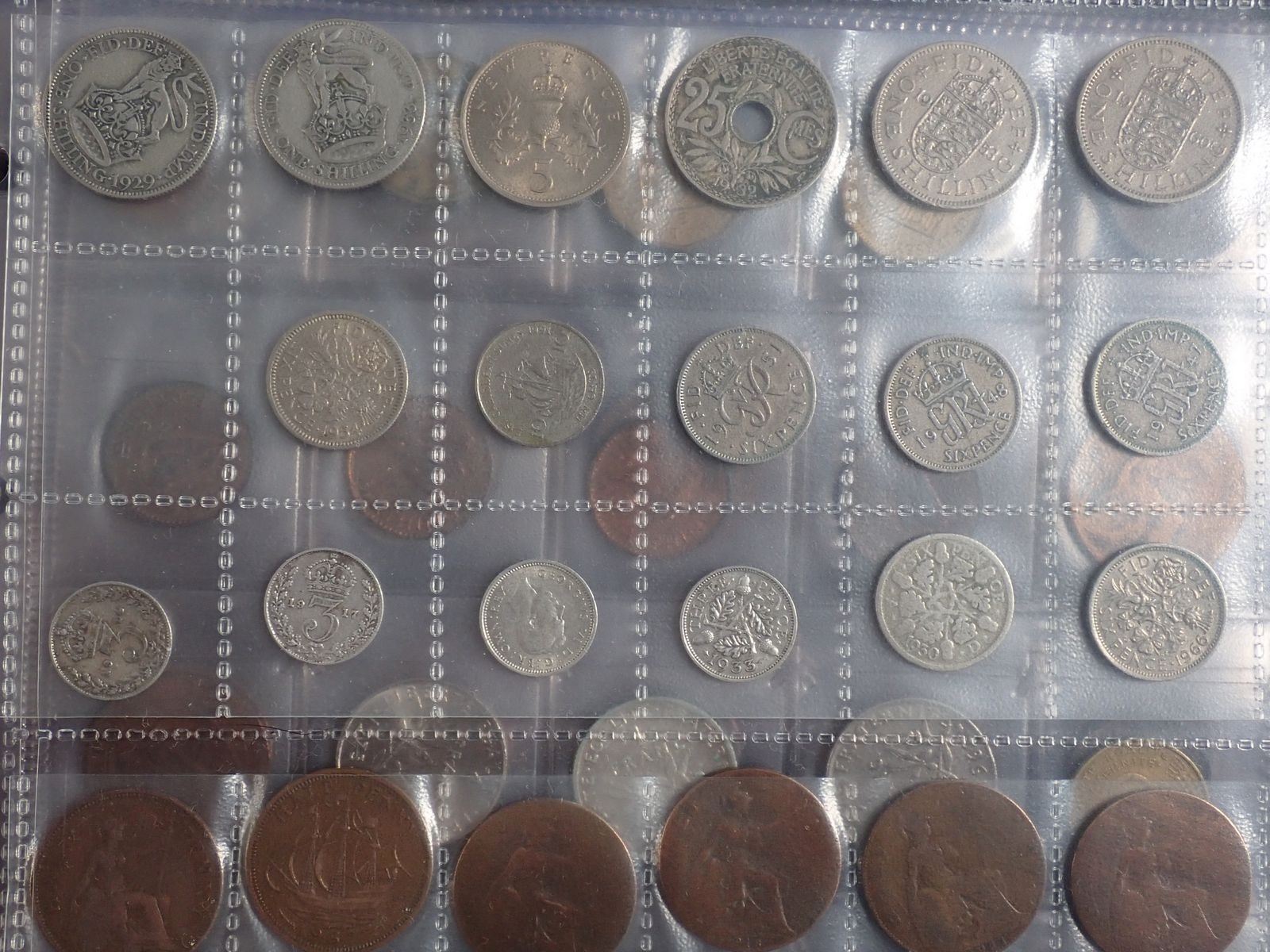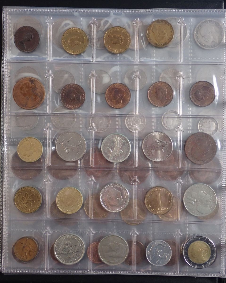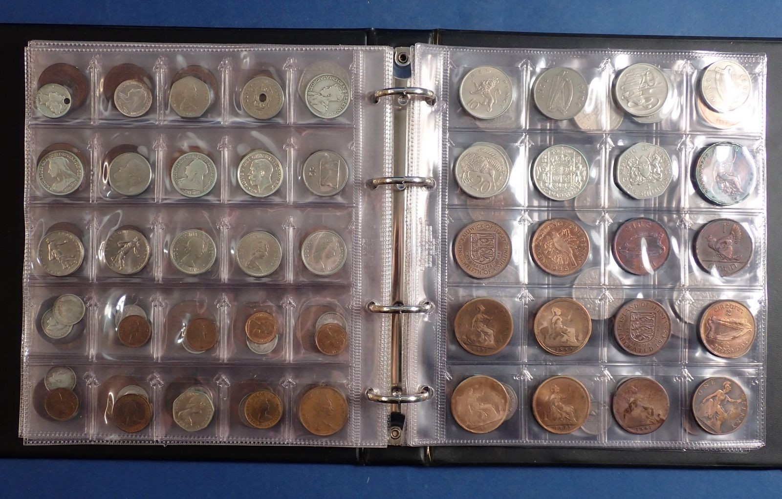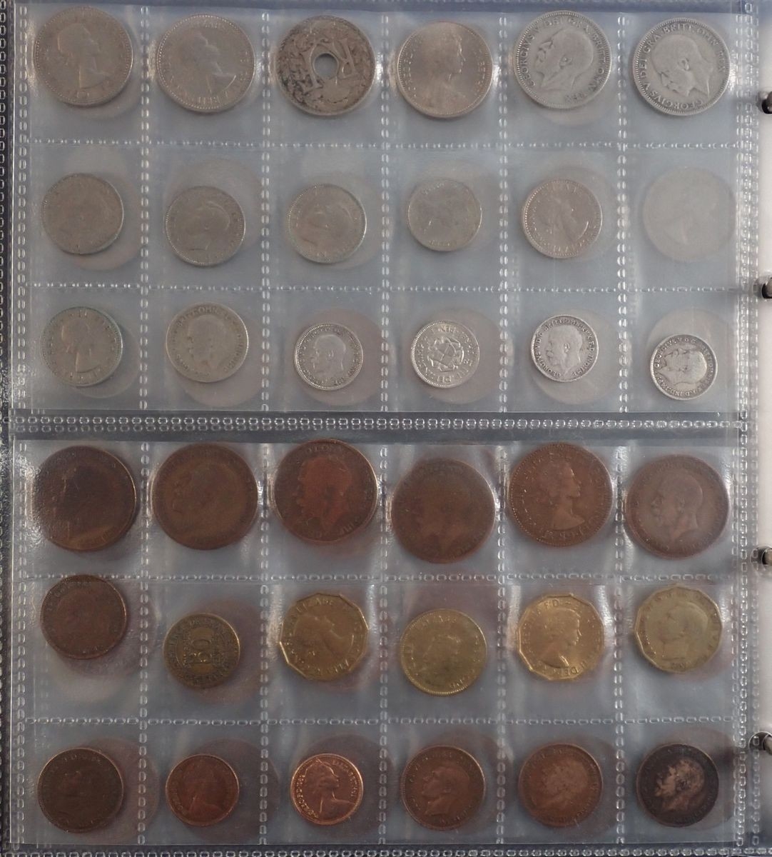 An album of British and World coins including silver examples, pre 1920 shillings x3, threepences x9, pre 1947 .500 silver half crowns x3, florin x1, shillings x2, sixpence x1 and threepences x5, Victoria - Elizabeth II plus Canada, Kenya, Eire etc