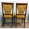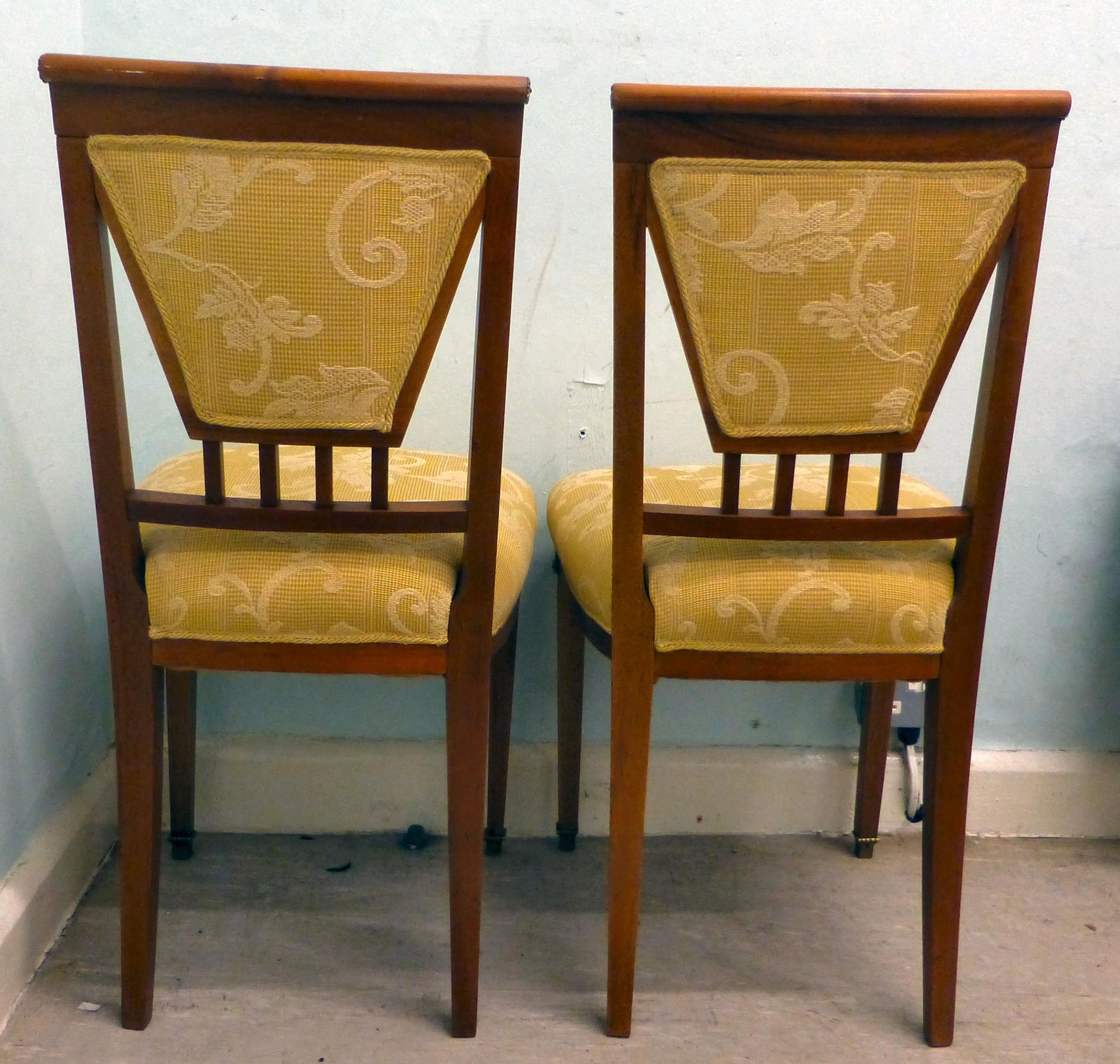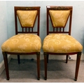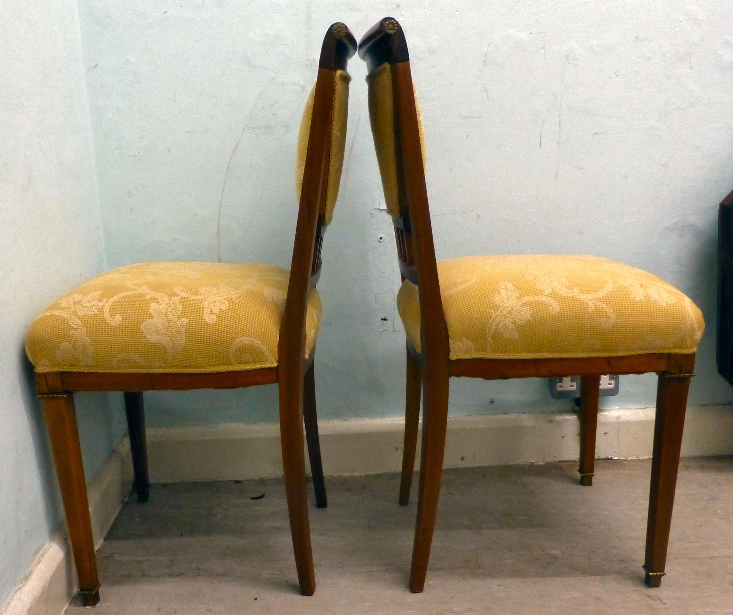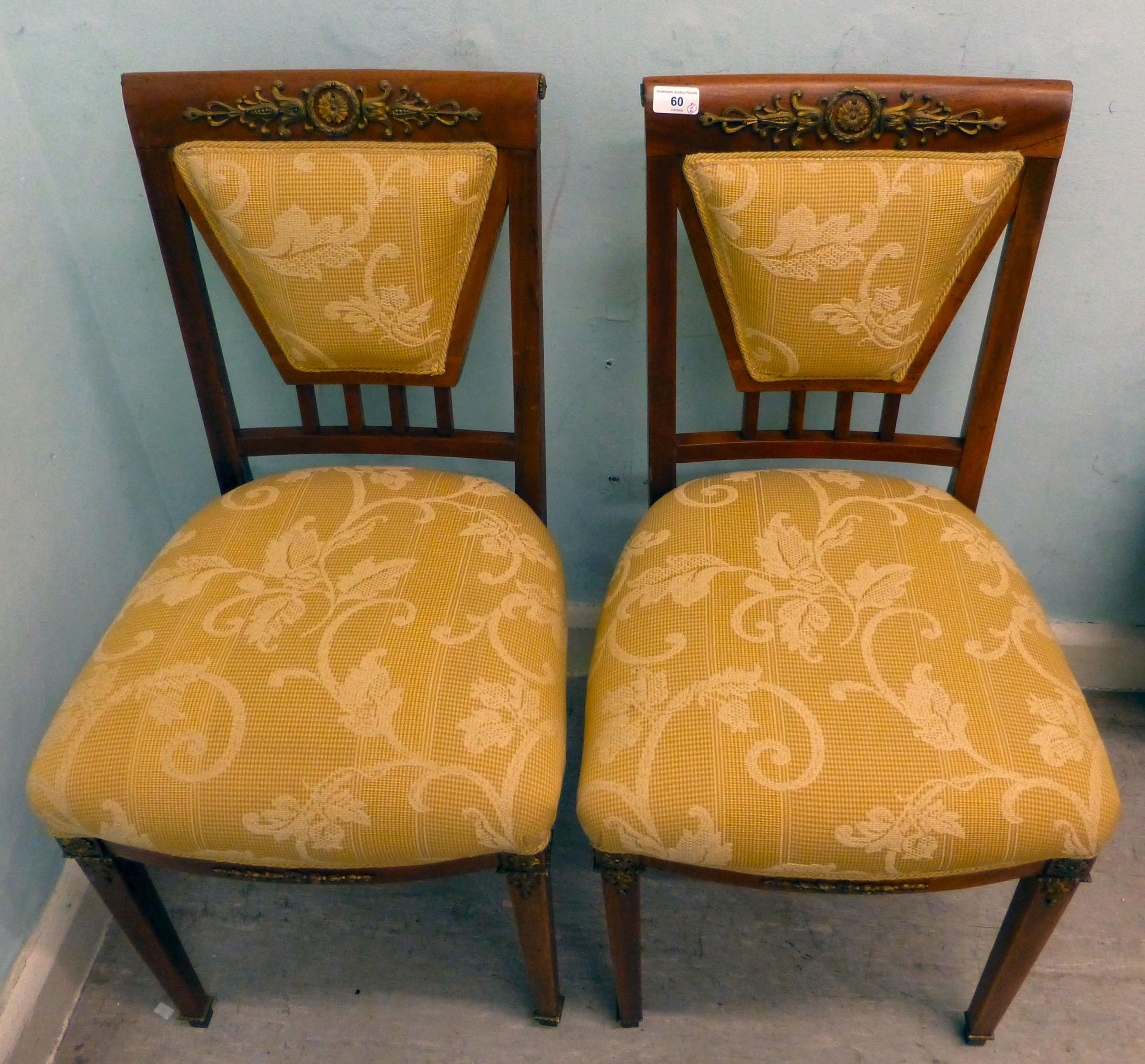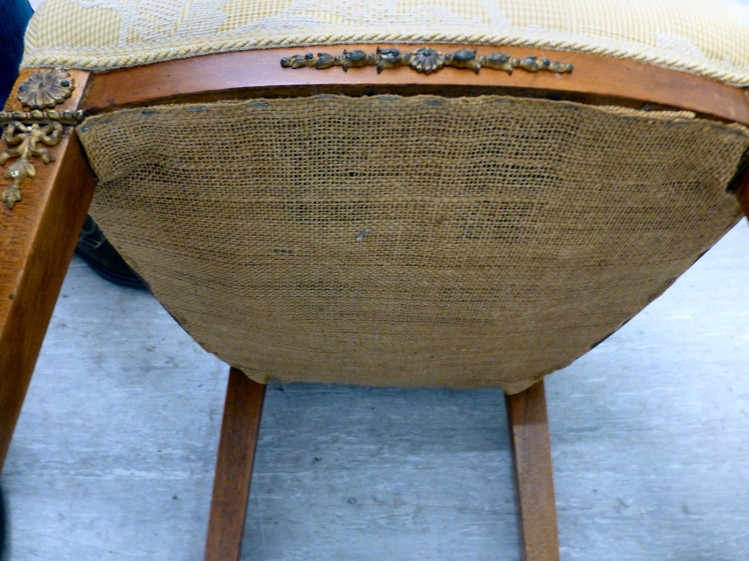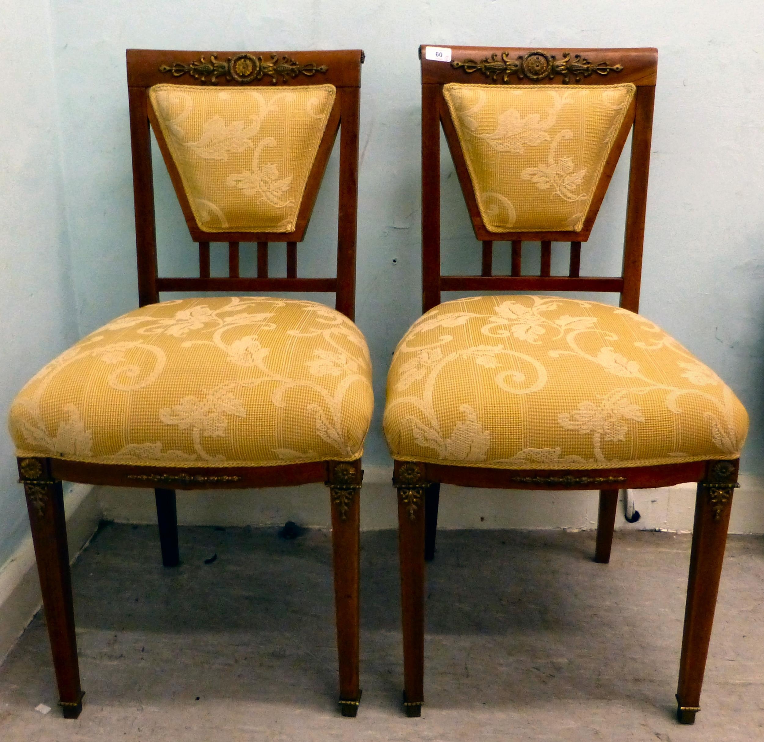 A pair of late 19thC walnut framed, ormolu mounted bedroom chairs, each with an upholstered back and seat, raised on square, tapered legs