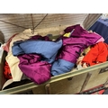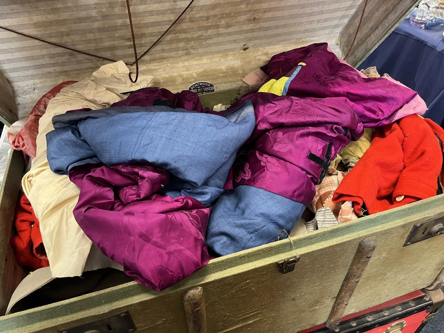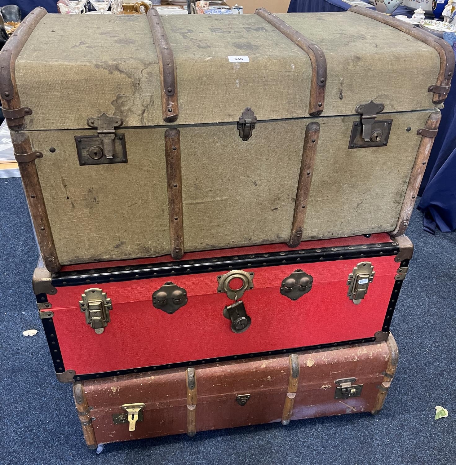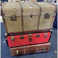 Two wood-bound trunks and contents, and another red trunk.